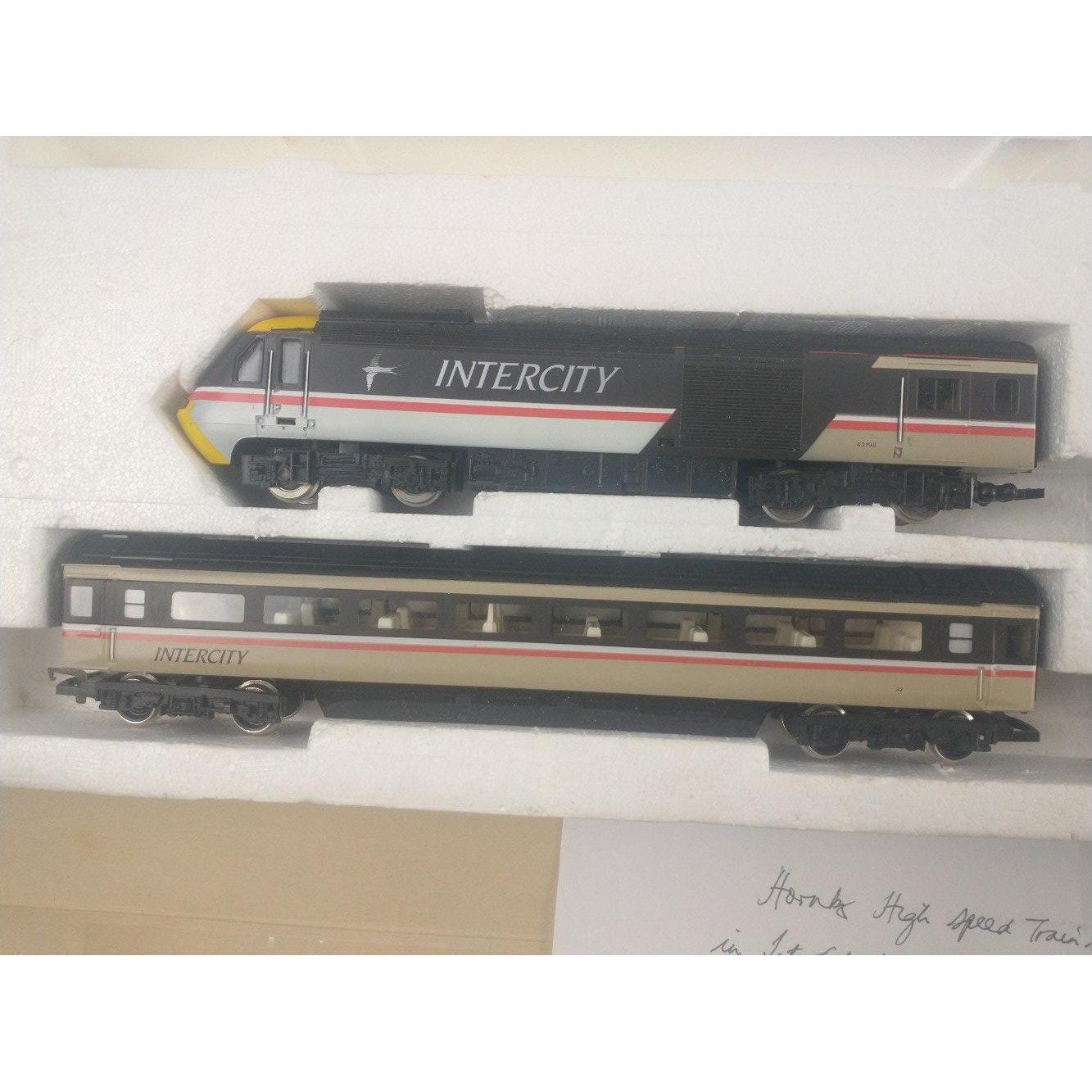 HORNBY HIGH SPEED TRAIN SET in inter-city swallow livery in excellent condition, consisting of HST power car, HST dining car and two BR Mk3 2nd class intercity coaches.