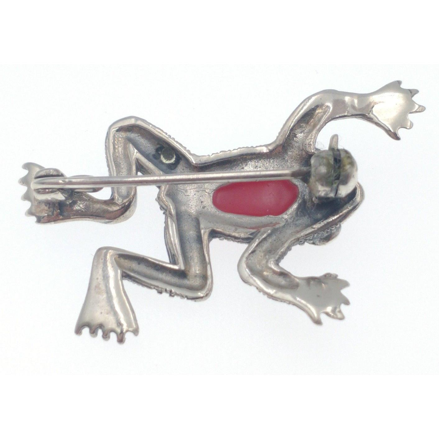 A small brooch in white metal Marcasite frog with a red stone back, 4cm long, 4.6g weight gross
