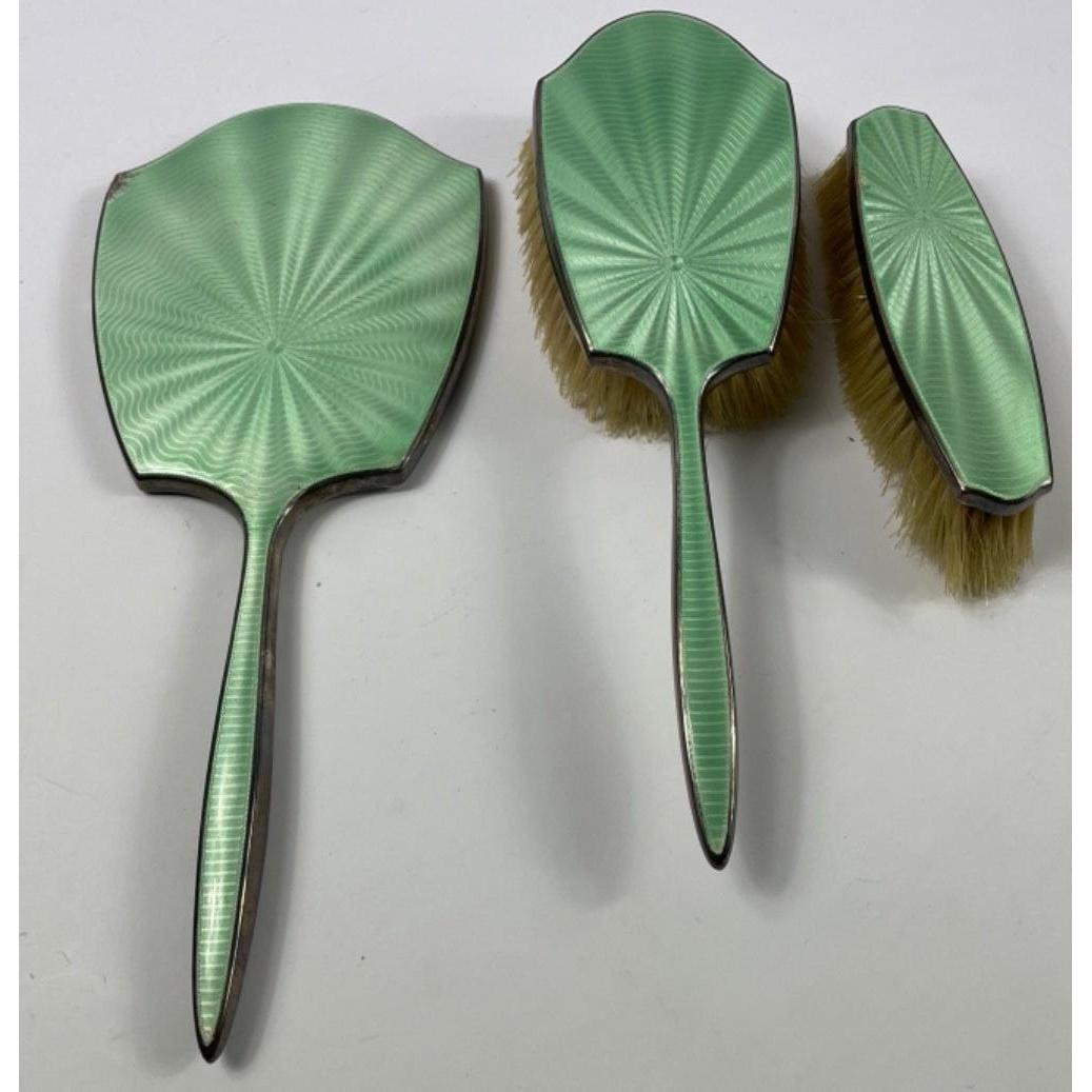A nice vintage silver enamelled dressing table set with very slight damage to the corner of the hand mirror in green enamelApprox 3 pieces