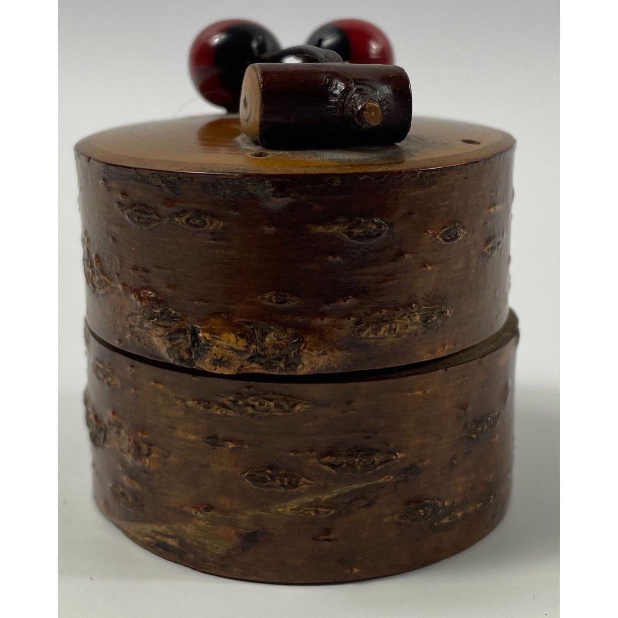 An UNUSUAL ink bottle encased in a lidded birch-wood piece of wood height 6cm x diameter 5cm approx