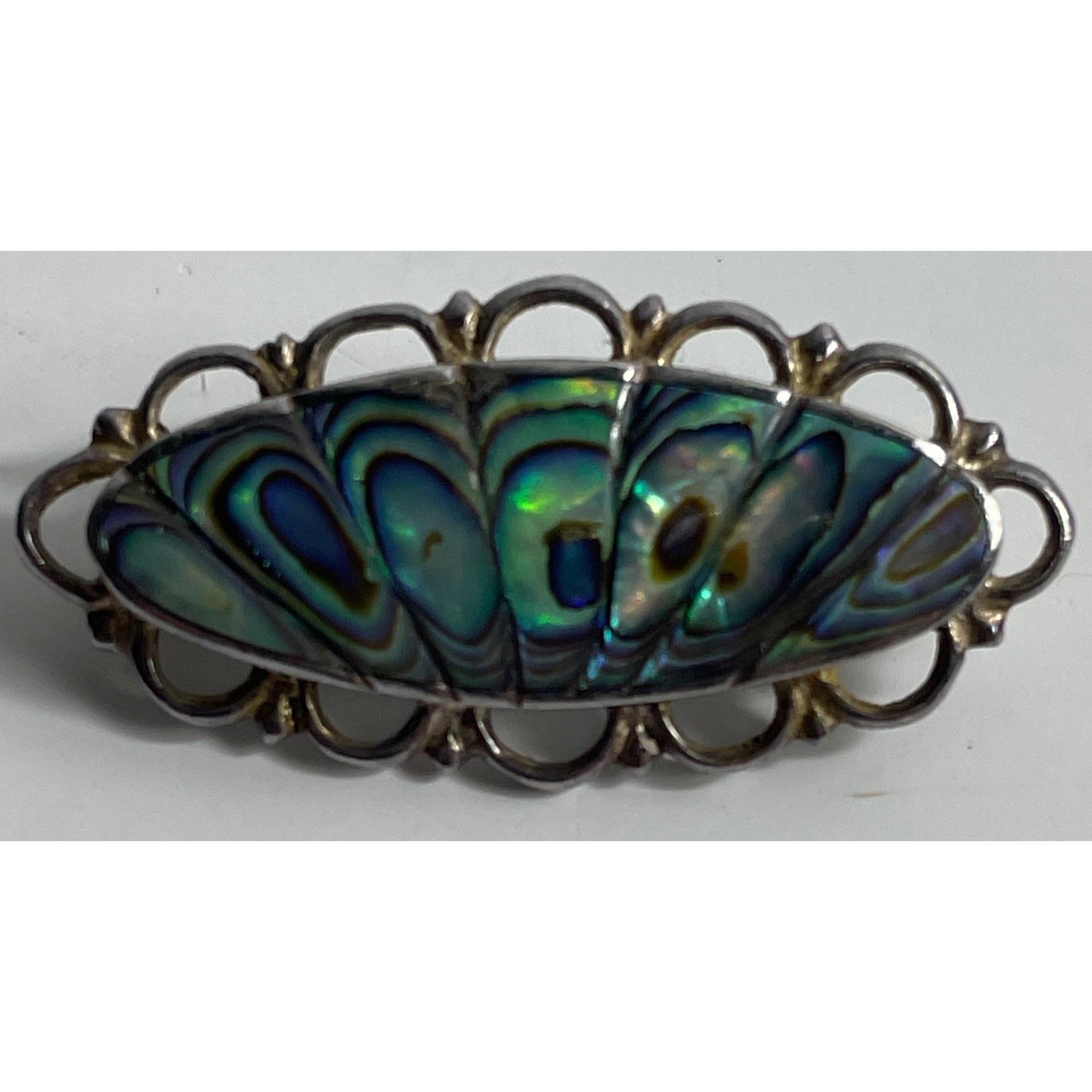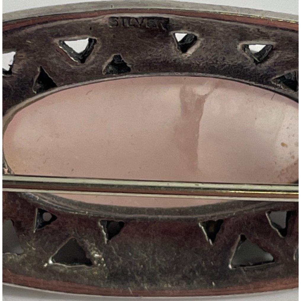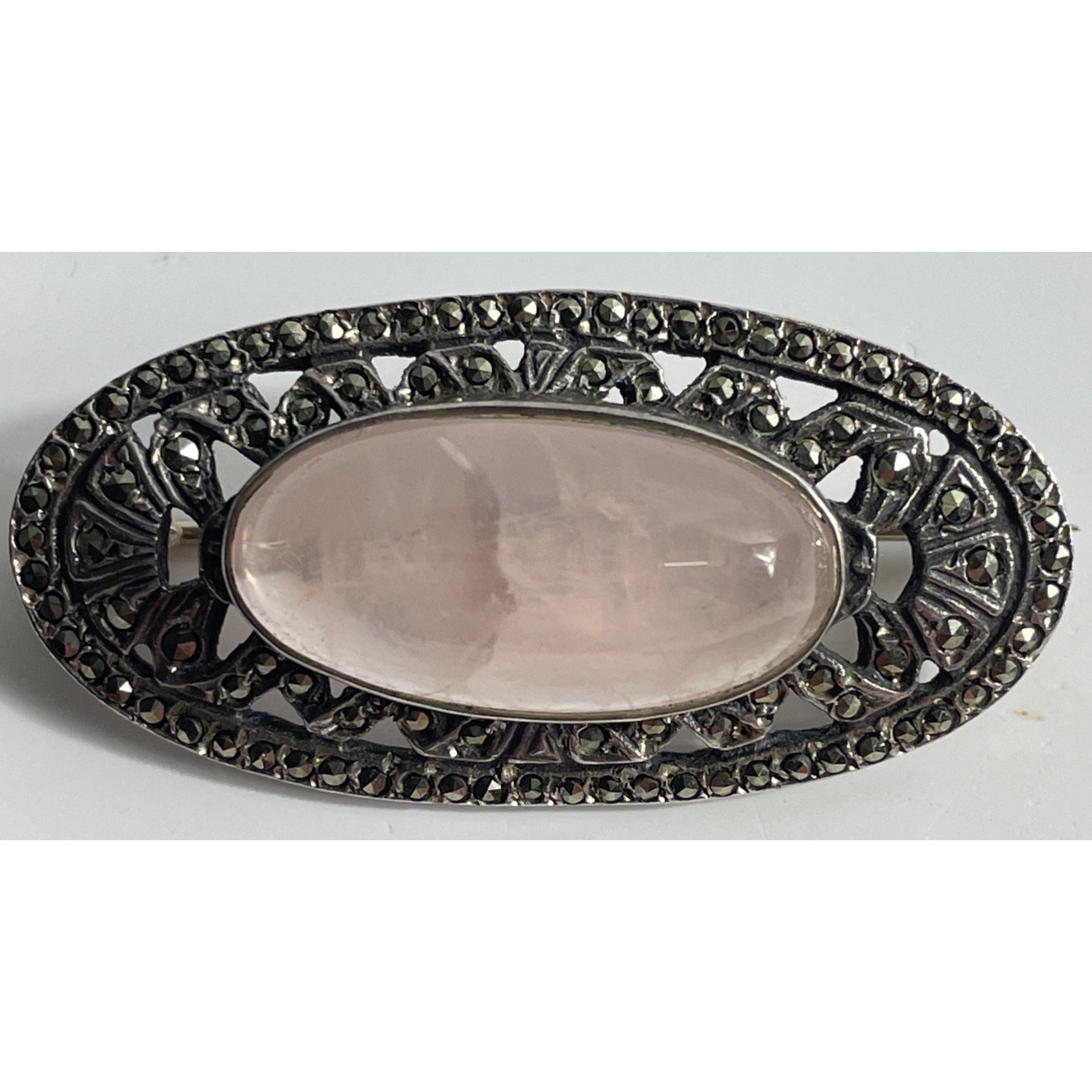 Two pretty hallmarked brooches one MARCASITE, with pinkish stone, is 4cm long gross weight 8.24g, the other with MOTHER OF PEARL, is 3.5 cm, gross weight 5.36gApprox 2 pieces
