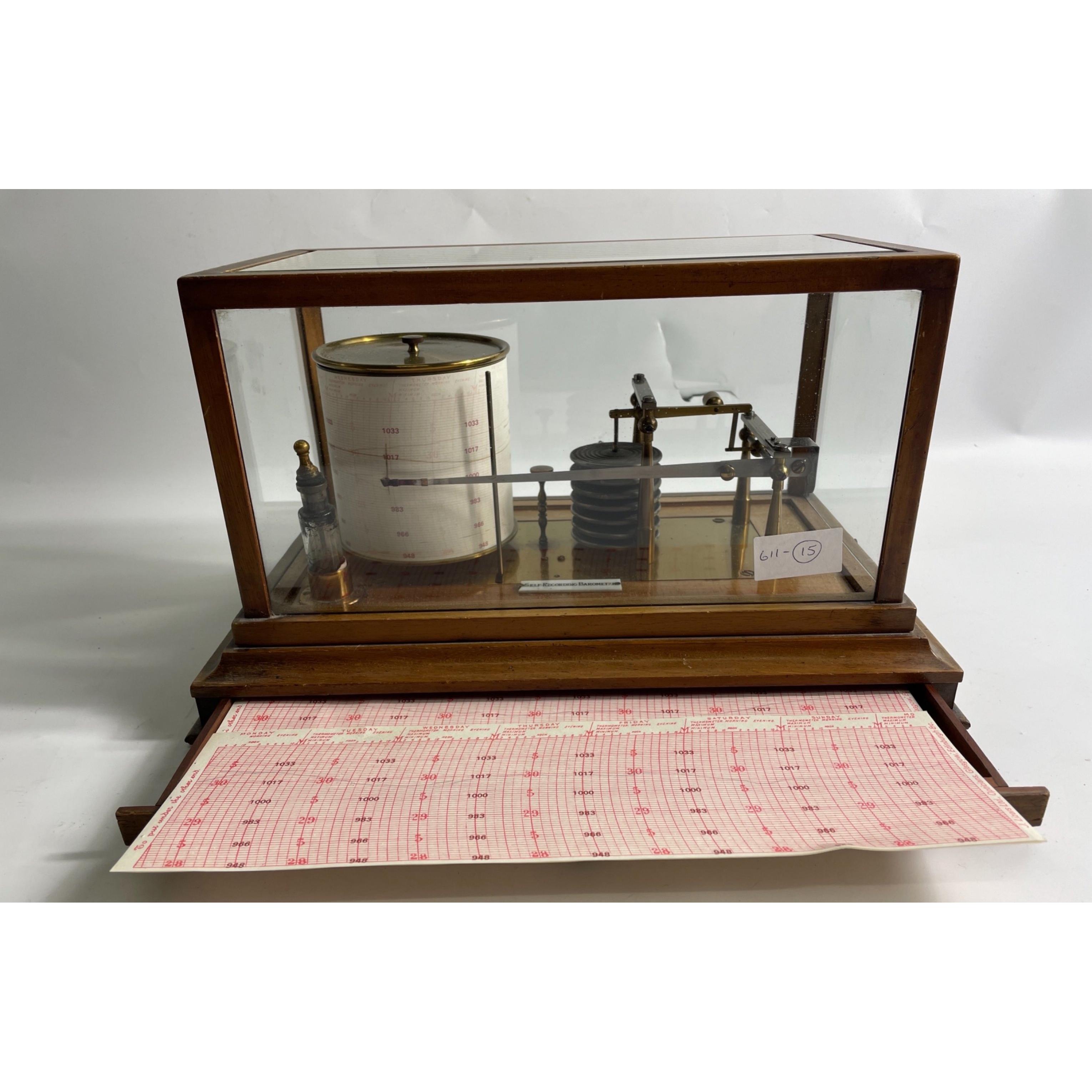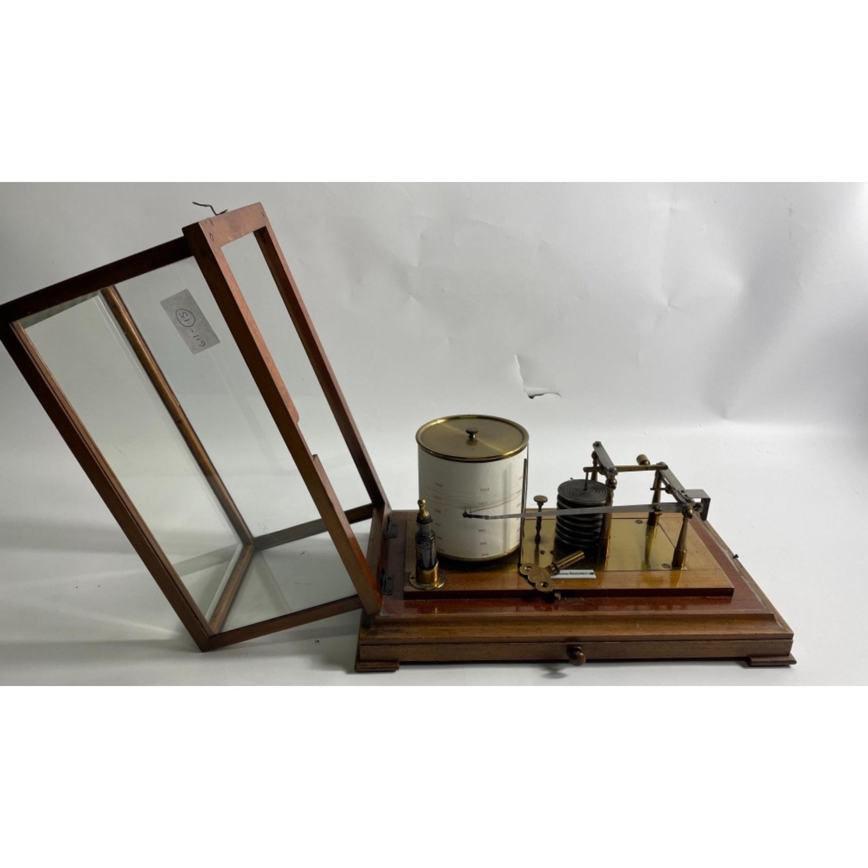 RARE! An antique mahogany cased BAROGRAPH, (labelled Self-recording barometer) with 8-day movement and 7 vacuum cylinders mounted on a brass plate, plinth base with chart drawer enclosing used and unused charts from J. Lizars of Glasgow.