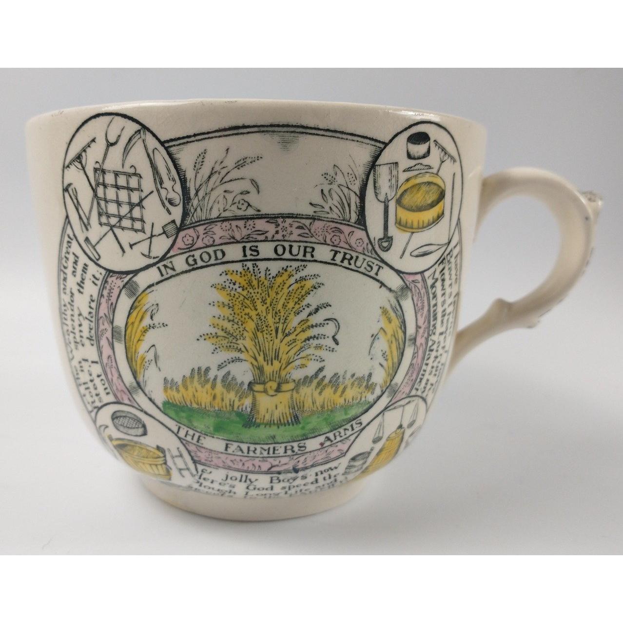 Antique ADAMS Staffordshire large cup and saucer 'THE FARMERS' ARMS' motto 'In God is our trust' (cup 12cm dia, saucer 19cm)Approx 2 pieces
