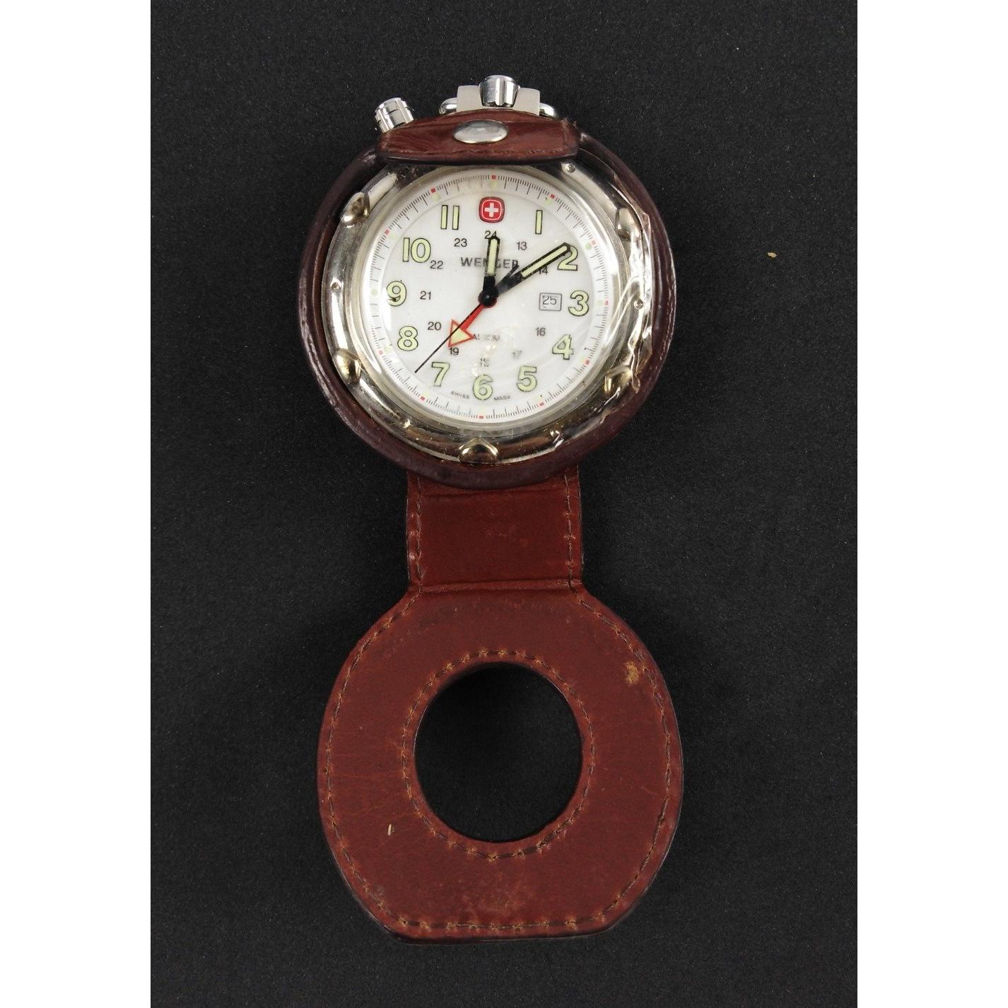 A WENGER Swiss Made alarm/stop watch within leather case, still with watch wrapper as 'new condition'