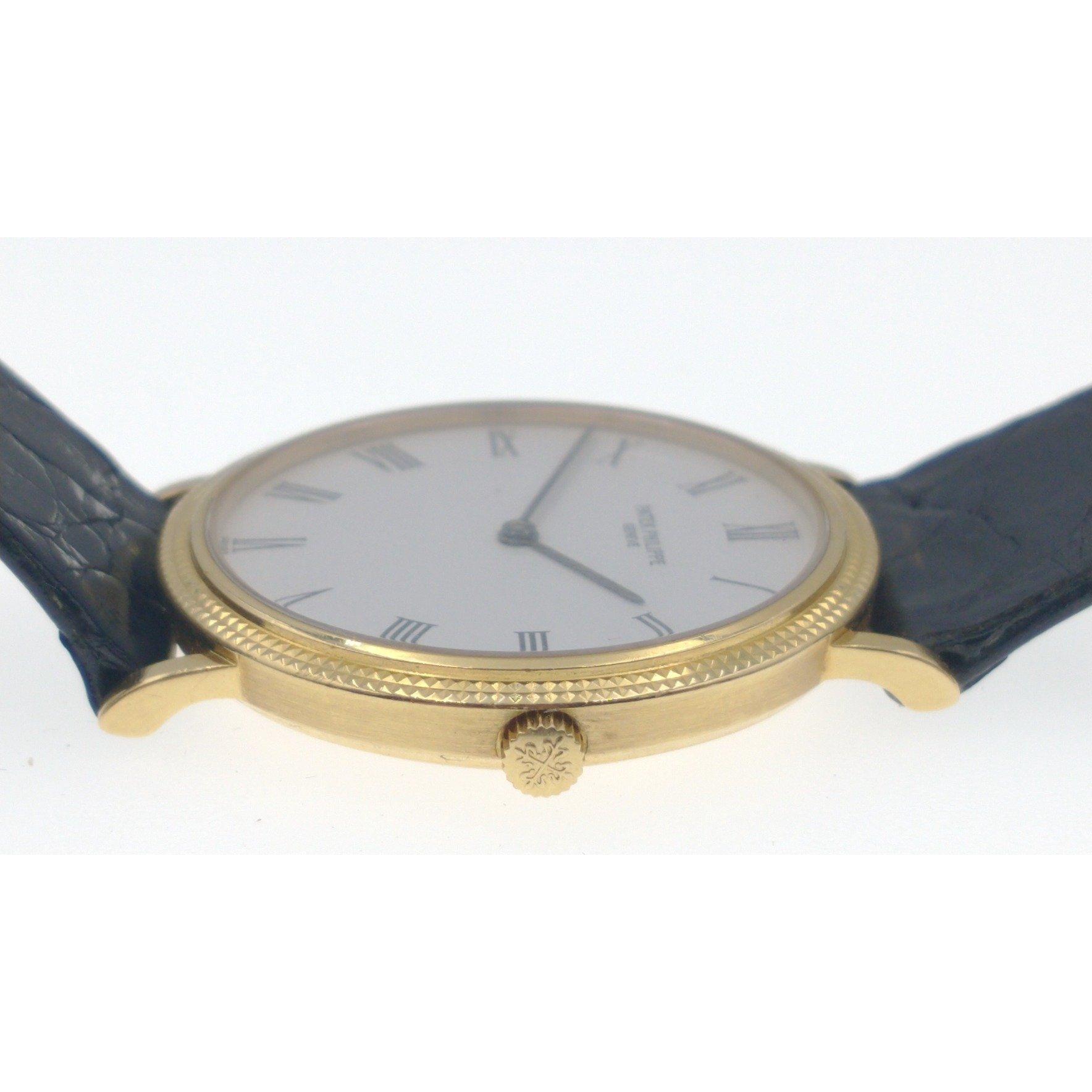 Pre-owned Patek Philippe Calatrava in yellow gold with black leather strap. This piece features a white dial with black roman numerals and a case diameter of 32mm. It is powered by an automatic self-winding movement.