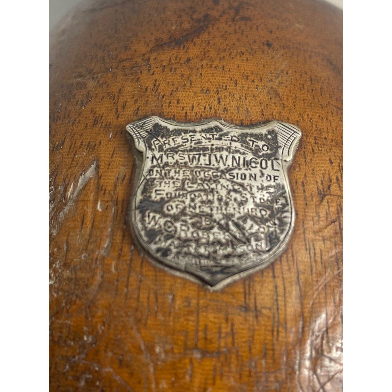 LOCAL INTEREST - 1925 MASONIC MALLET (approx 22cm high) presented to Mrs Nichol on the Occasion of the laying of the Foundation stone of Netherurd by Master Mason W.C Robertson. Has some wear and damage