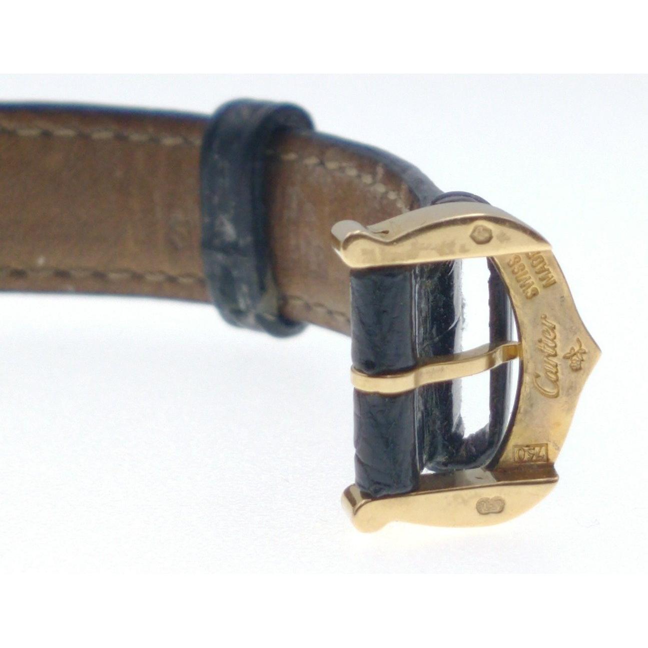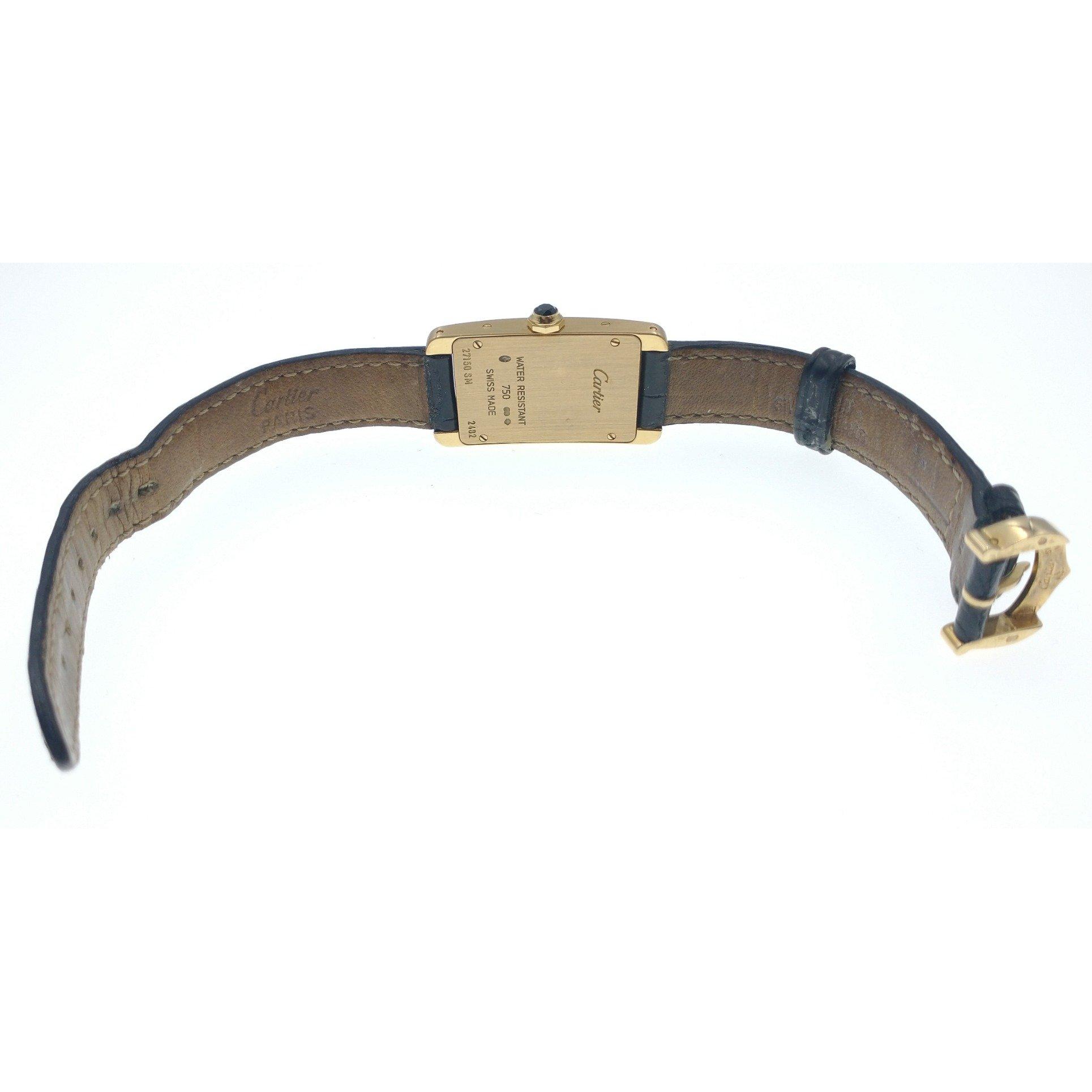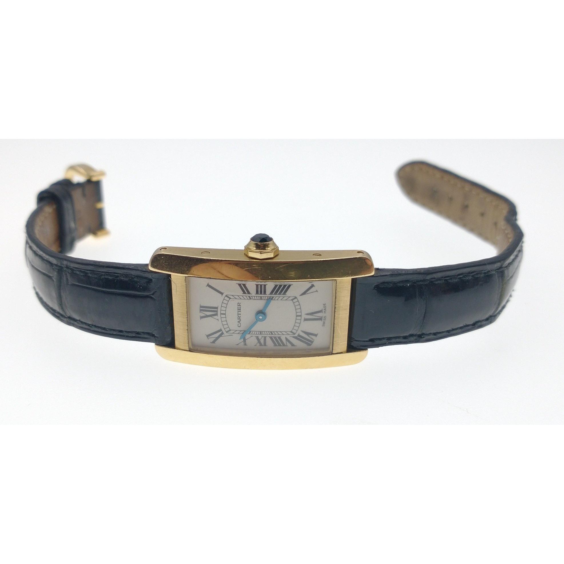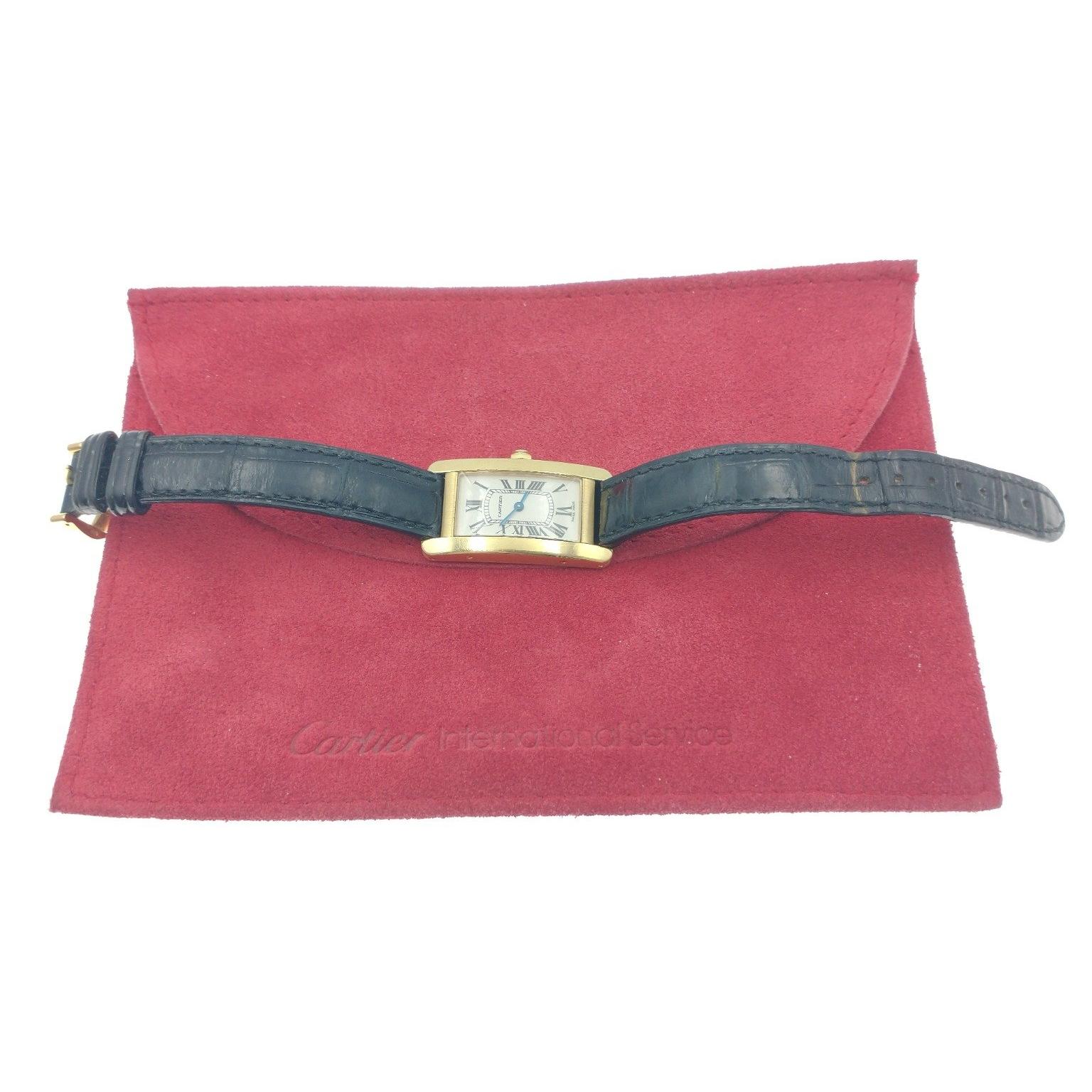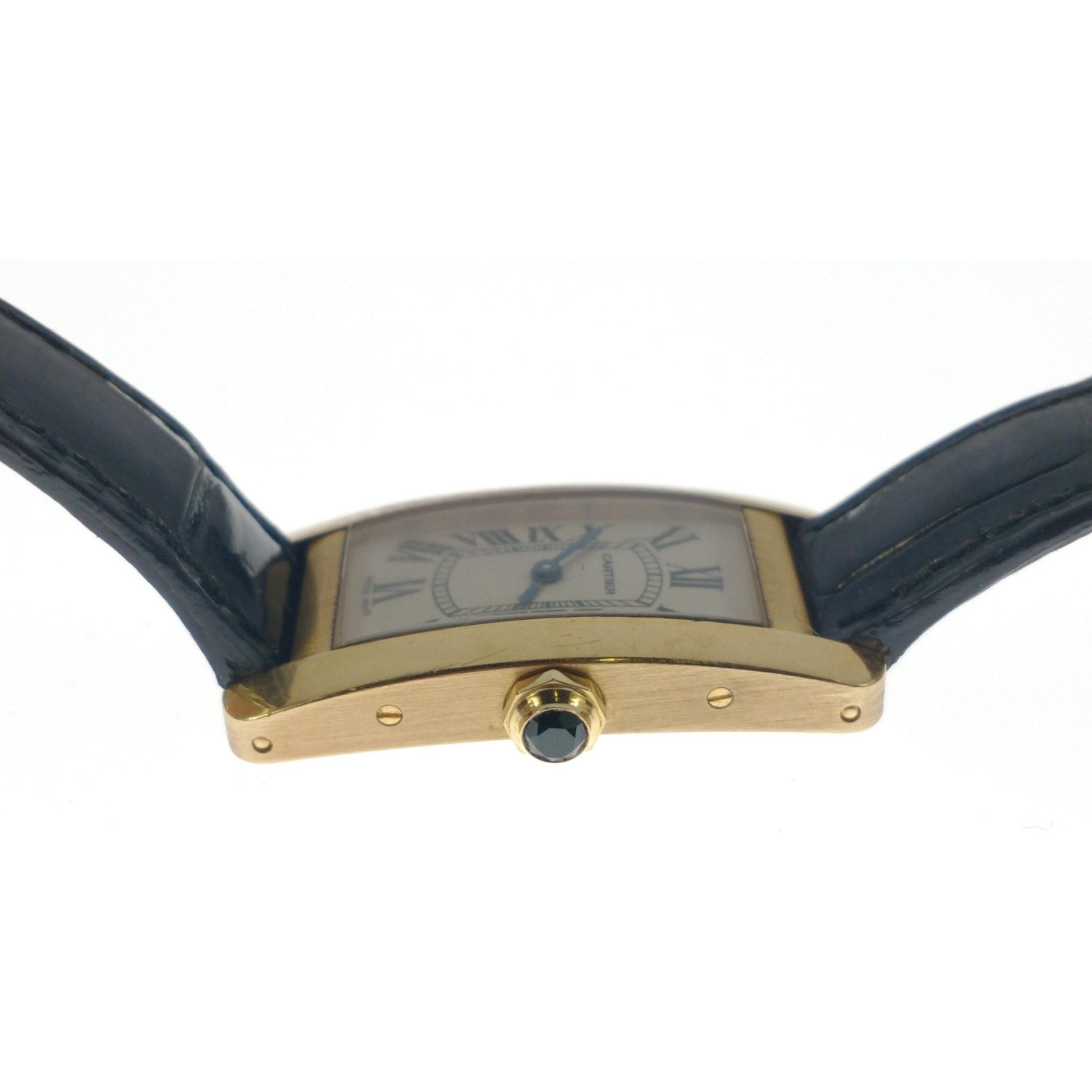 CARTIER tank ladies WRIST WATCH 750 stamped casing complete with a sapphire within the watch winder, with serial No 27150 SM with corresponding 248(all No's on the rear of the watch) weight 32.50g gross - includes the red CARTIER pouch - from part of an estate with high quality family jewellery collection spanning 100 years