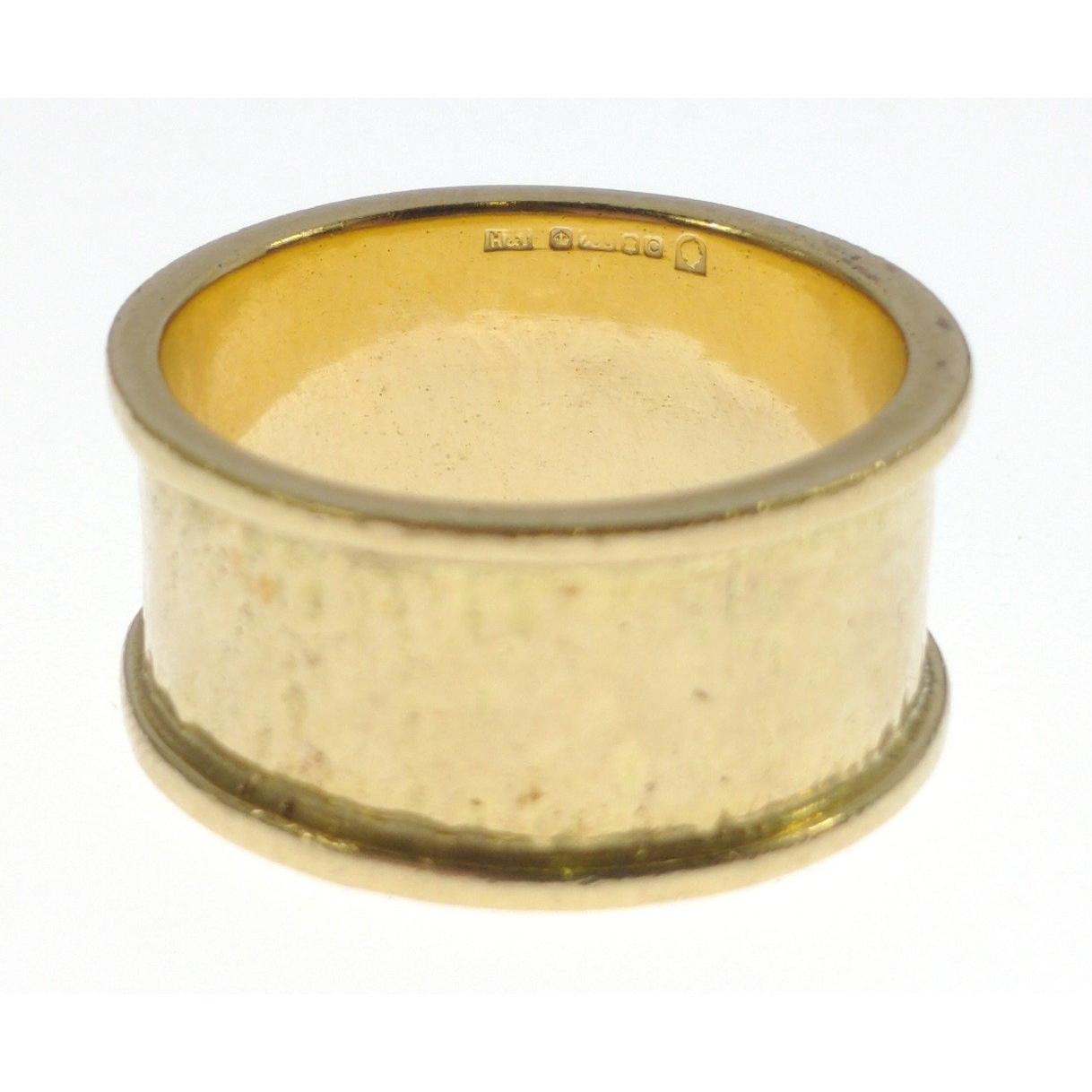 750 stamped yellow gold hammered effect plain WEDDING BAND, ring size P, weight 10.50g