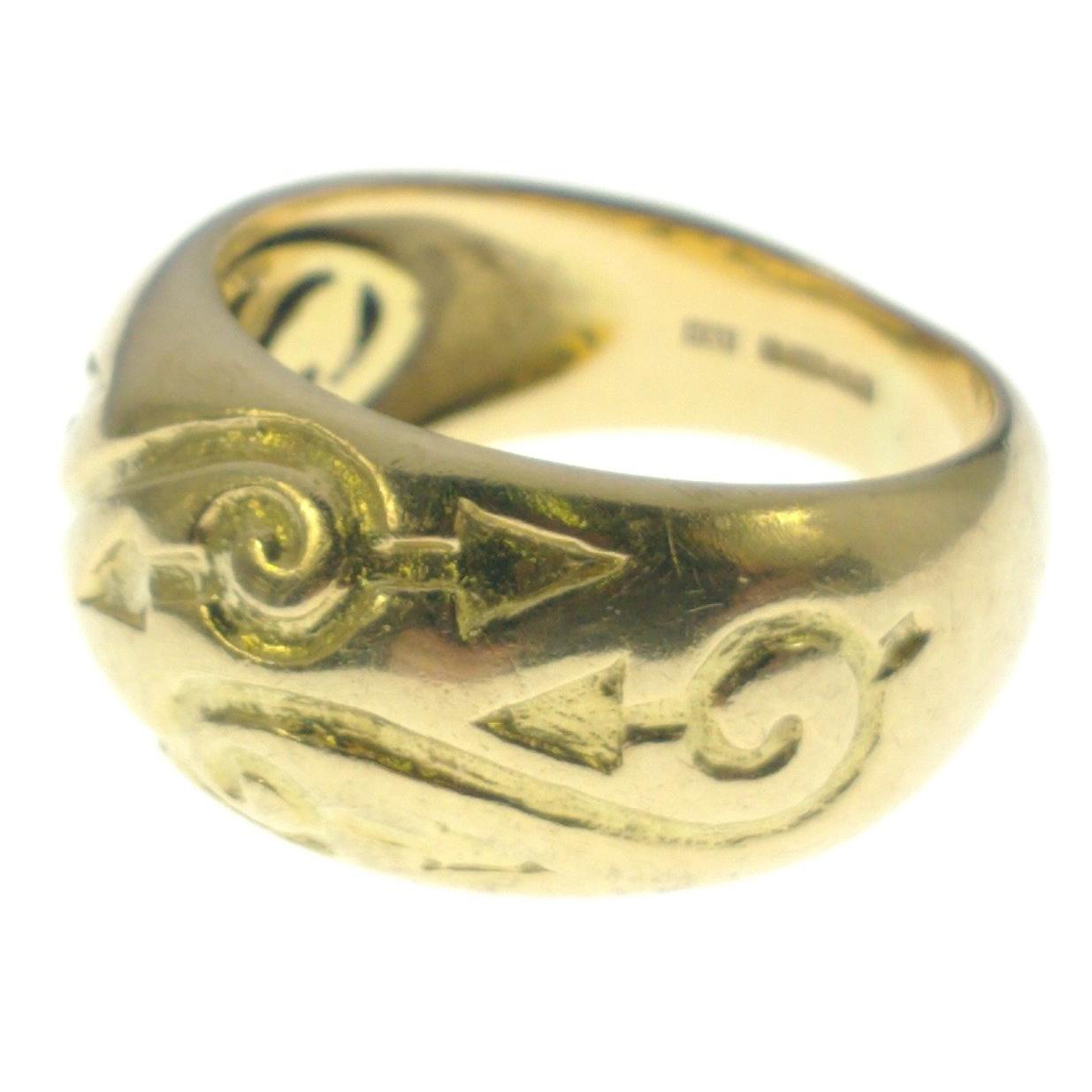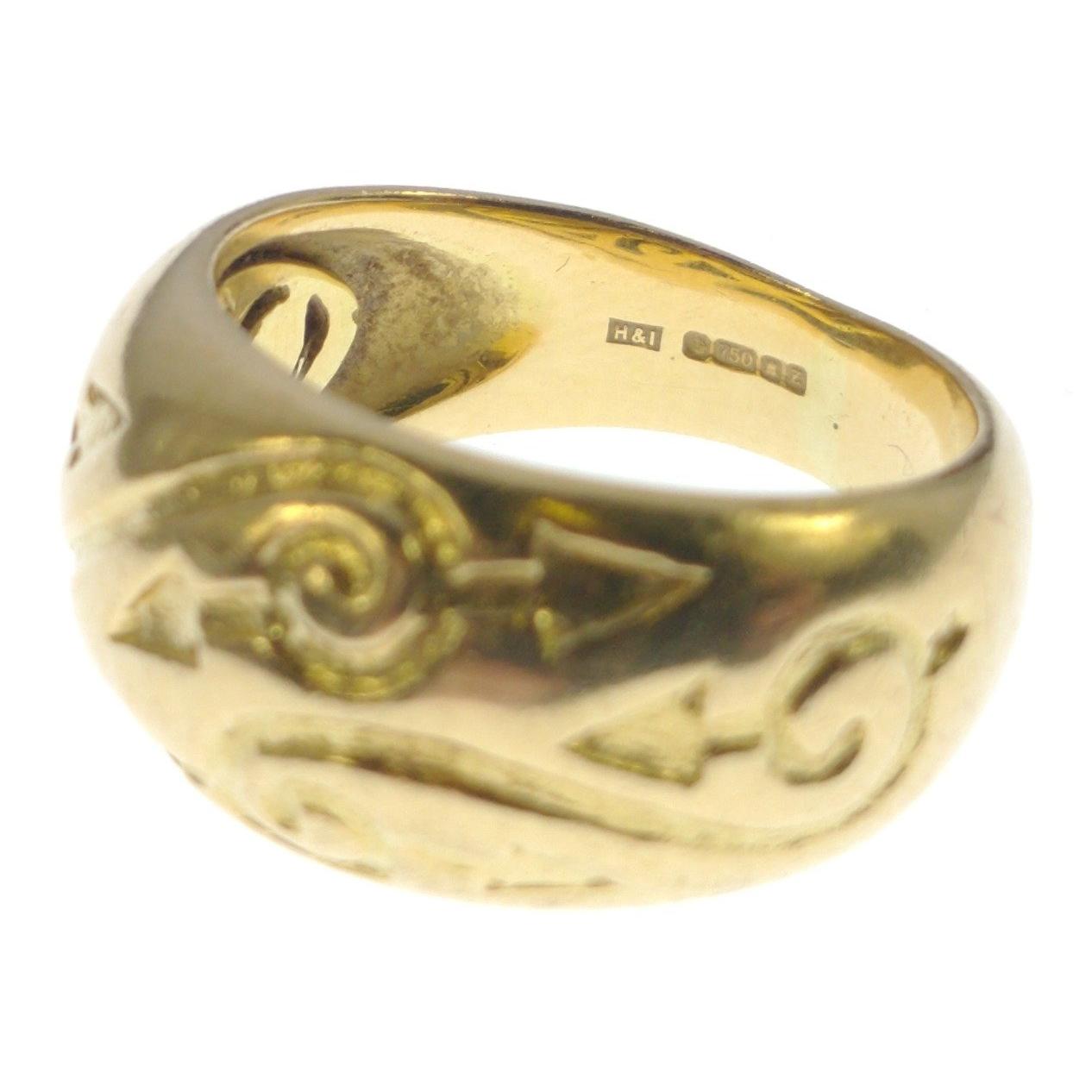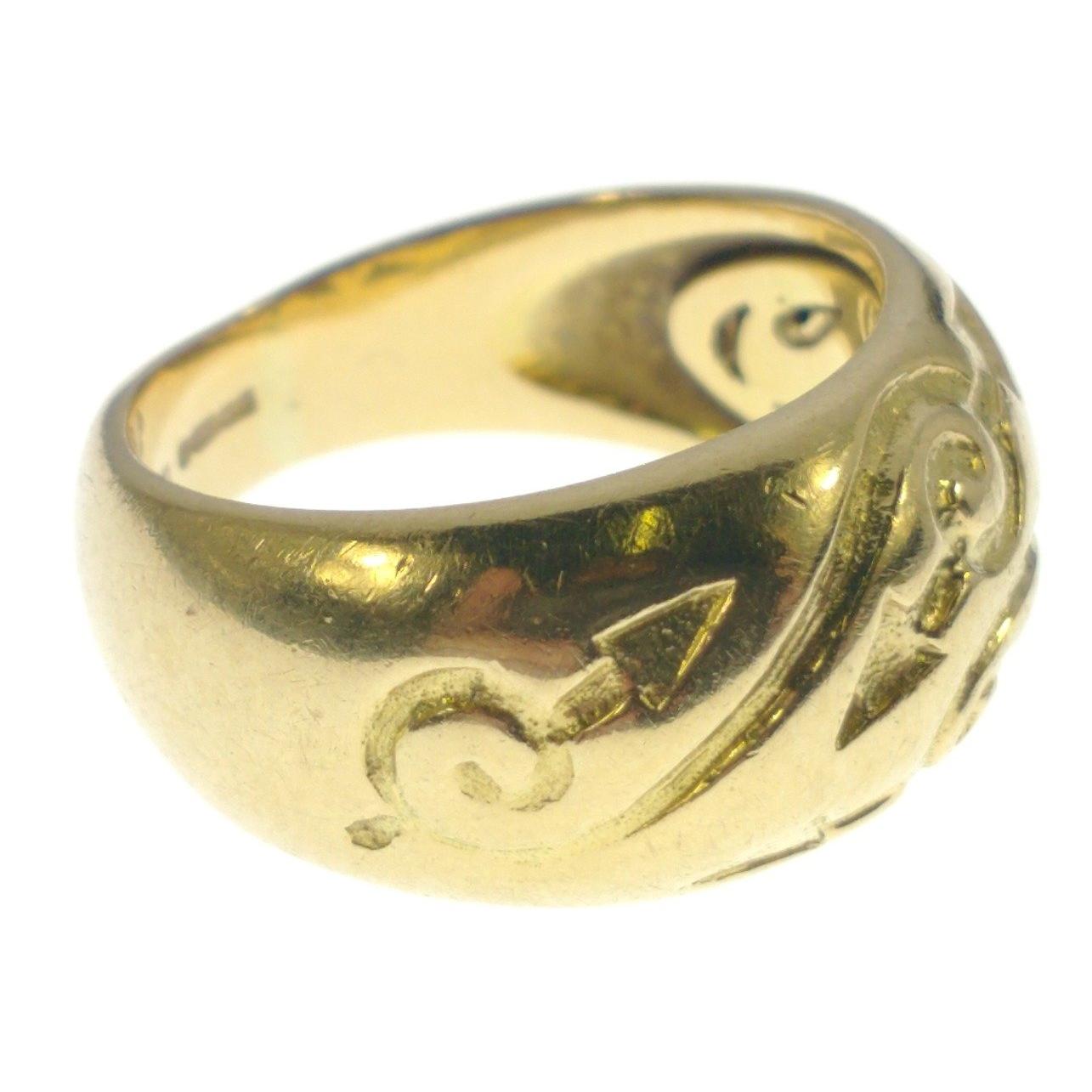 STUNNING! 750 stamped yellow gold RING with scrolled engraving, ring size M, weight 8.50g approx