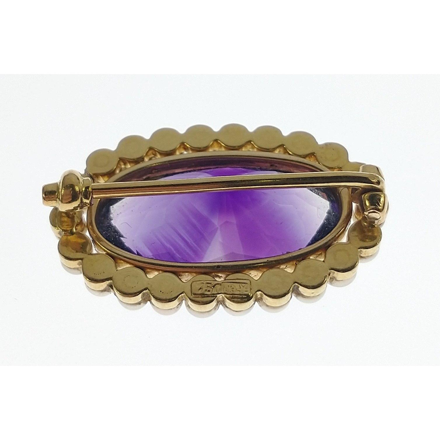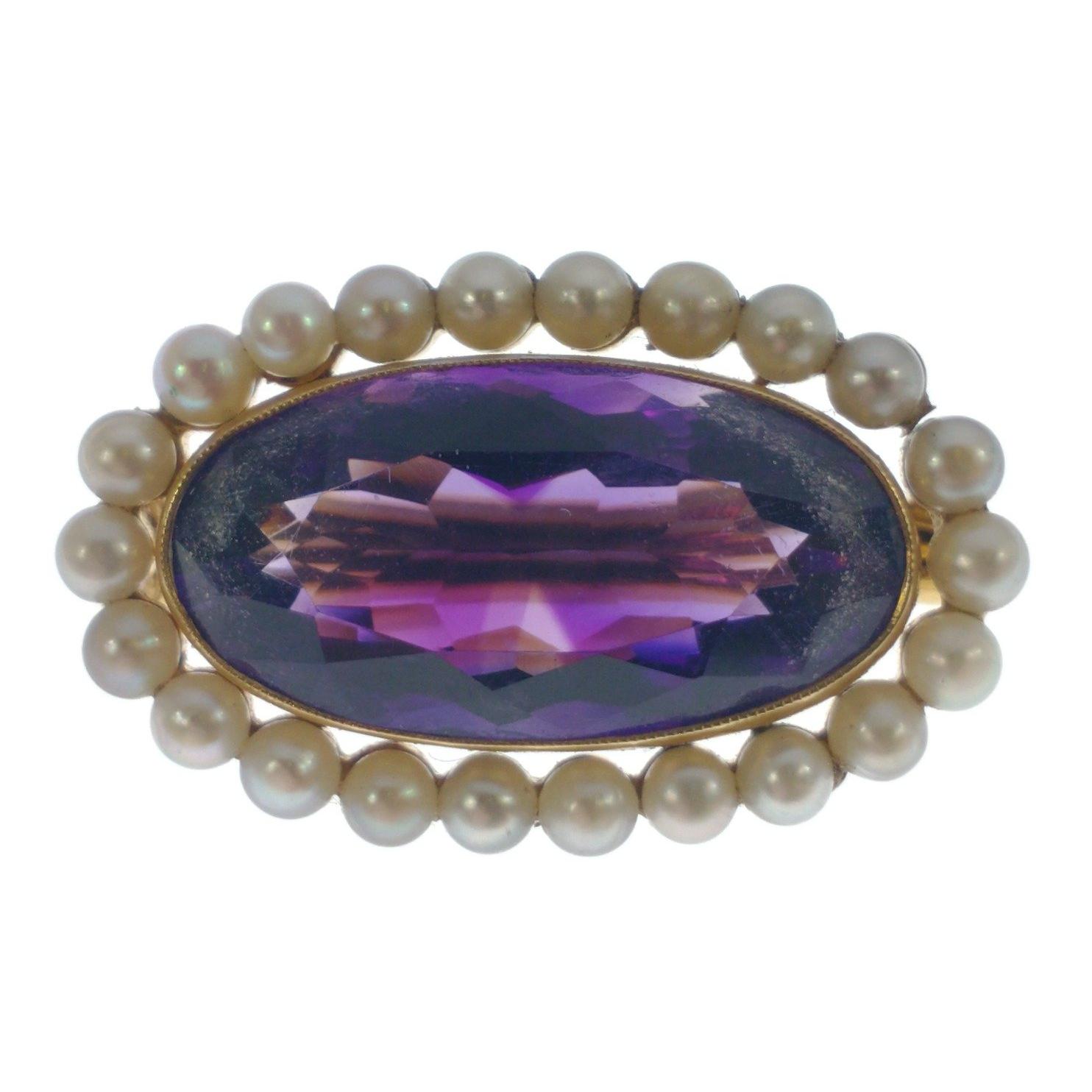 Vintage nice quality! 750 stamped BROOCH, yellow gold oval shaped amethyst & surrounded by small pearls, dimensions 3cm x 1.25cm, gross weight 7.7g