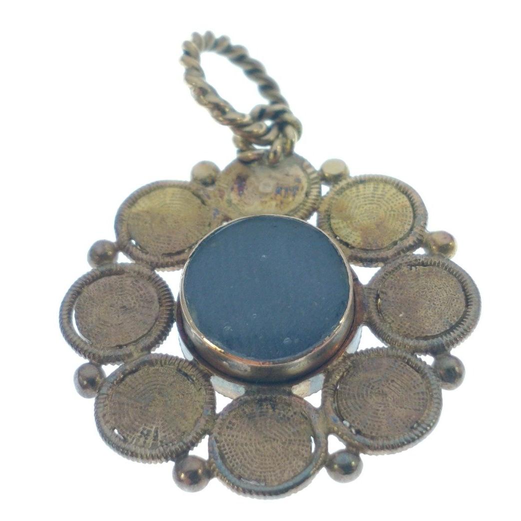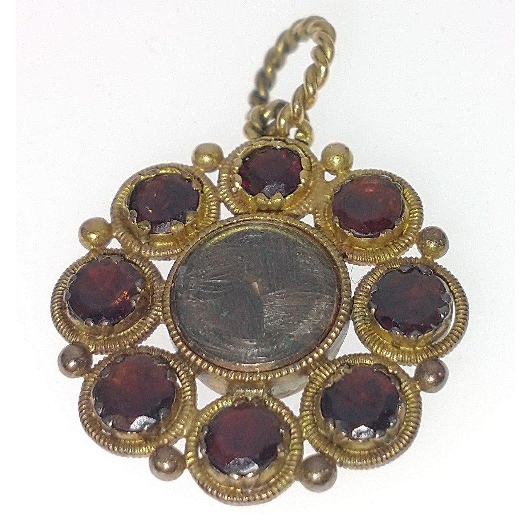 NICE QUALITY! VINTAGE 'yellow metal' mourning PENDANT set with 8 garnets surrounding woven hair, dimension 2cm diameter, gross weight 4g