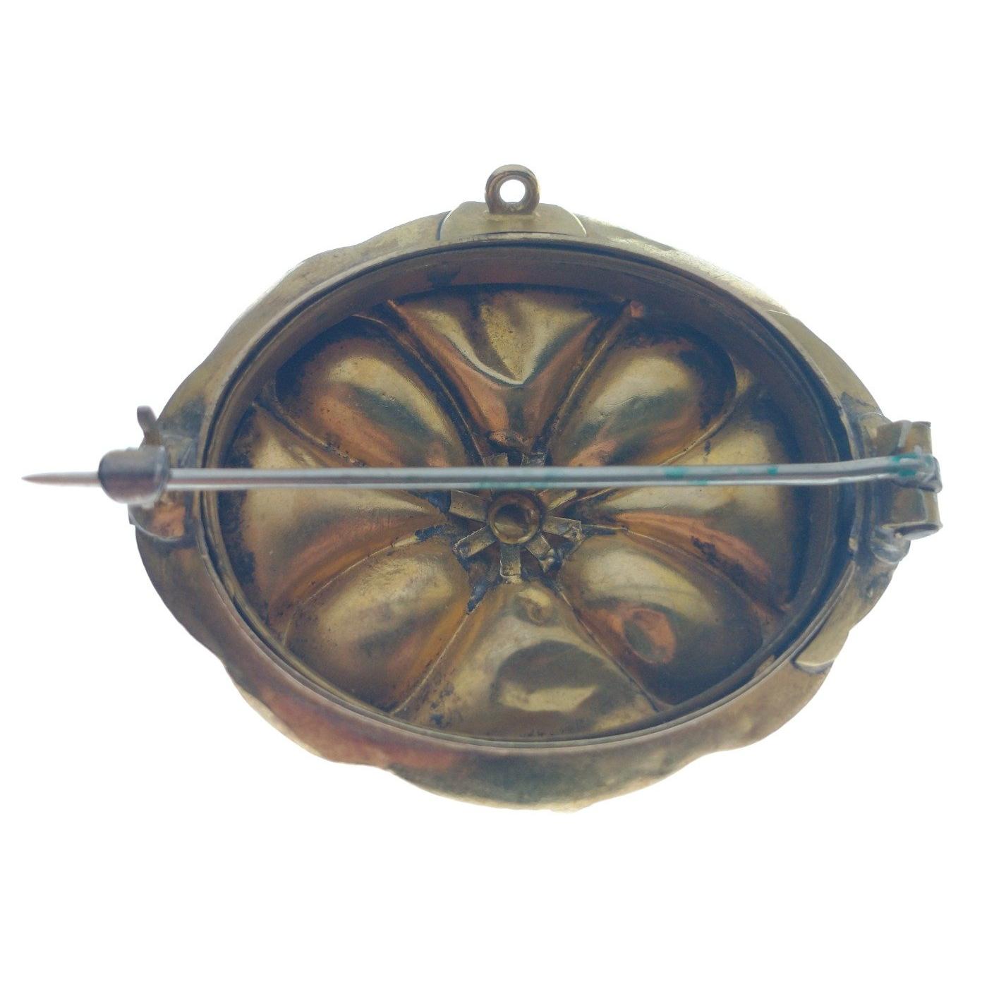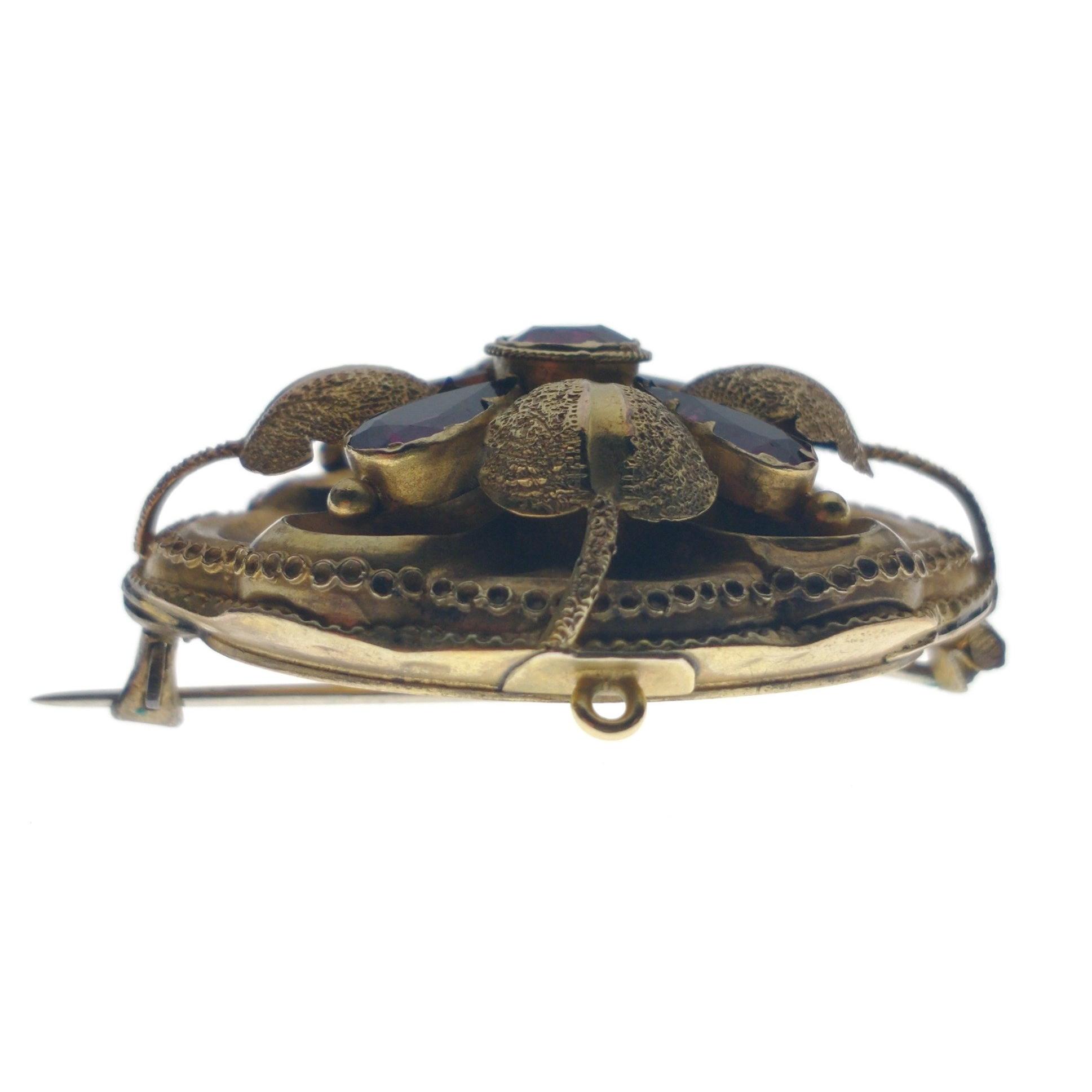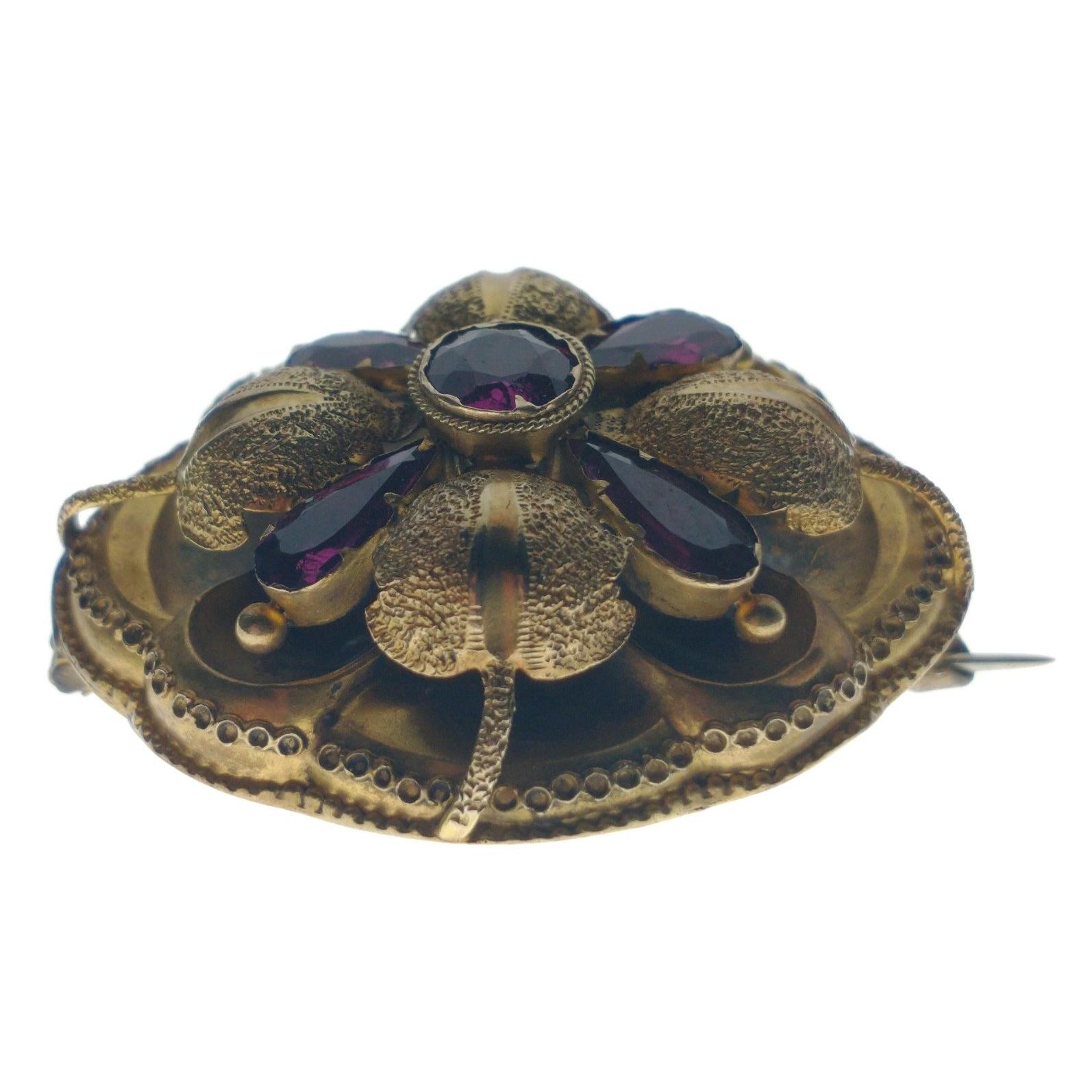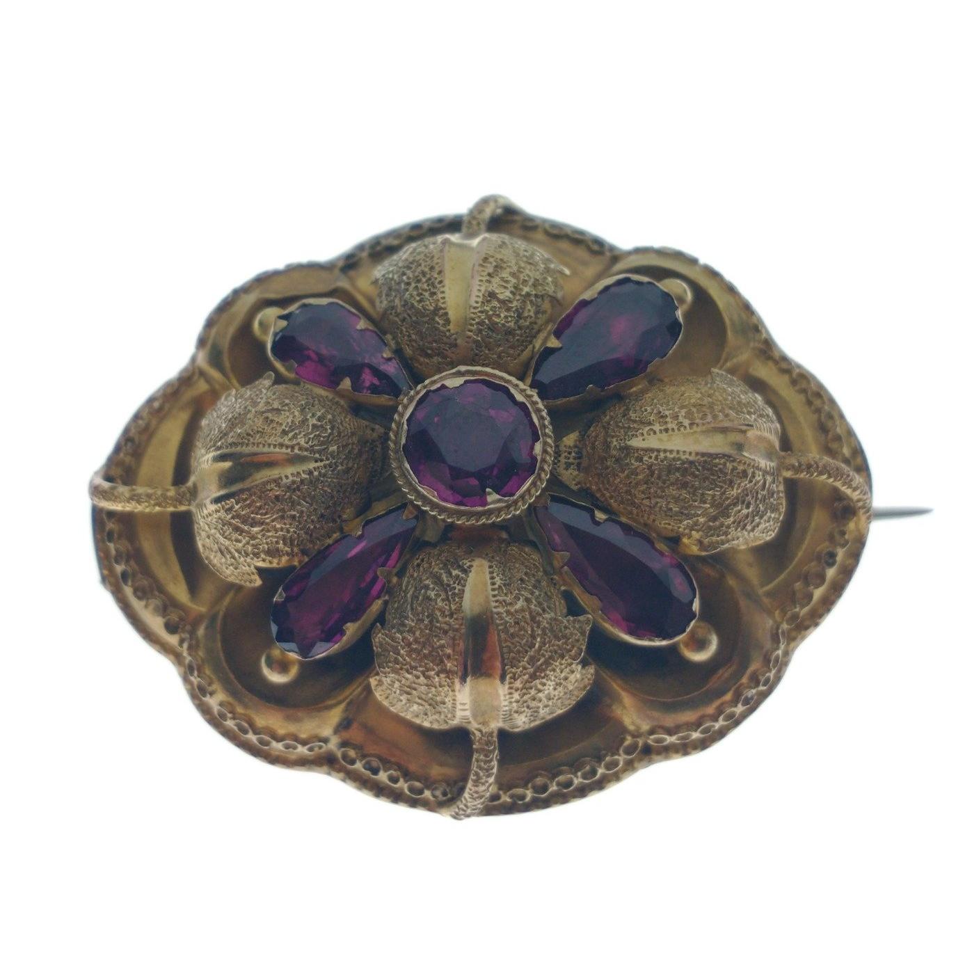 A VICTORIAN 'yellow metal' oval BROOCH with a leaf and flower bud design, set with 5 amethysts - BEAUTIFUL QUALITY! ! For info the pin has been repaired, dimensions 4cm x 3.75cm, gross weight 6.90g approx