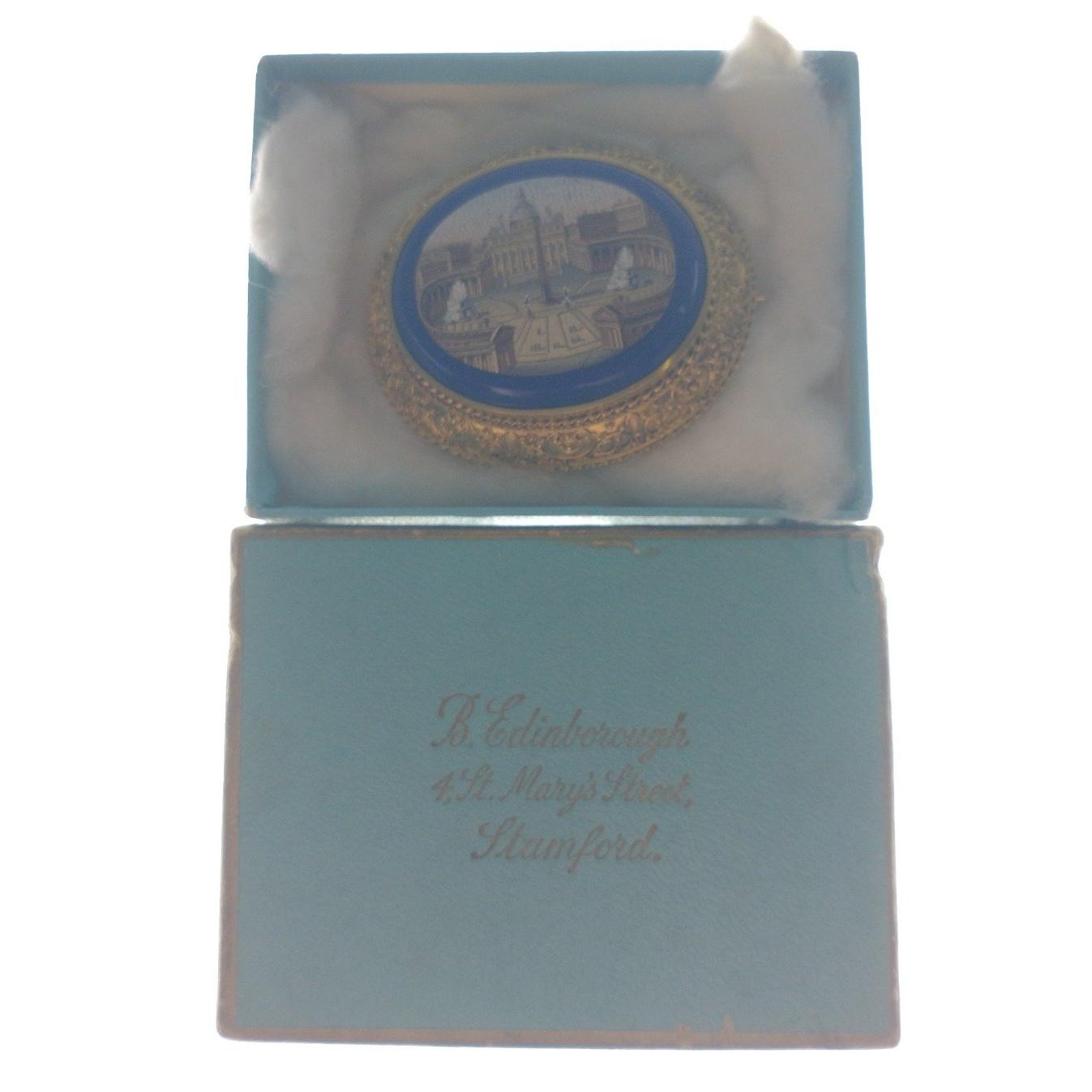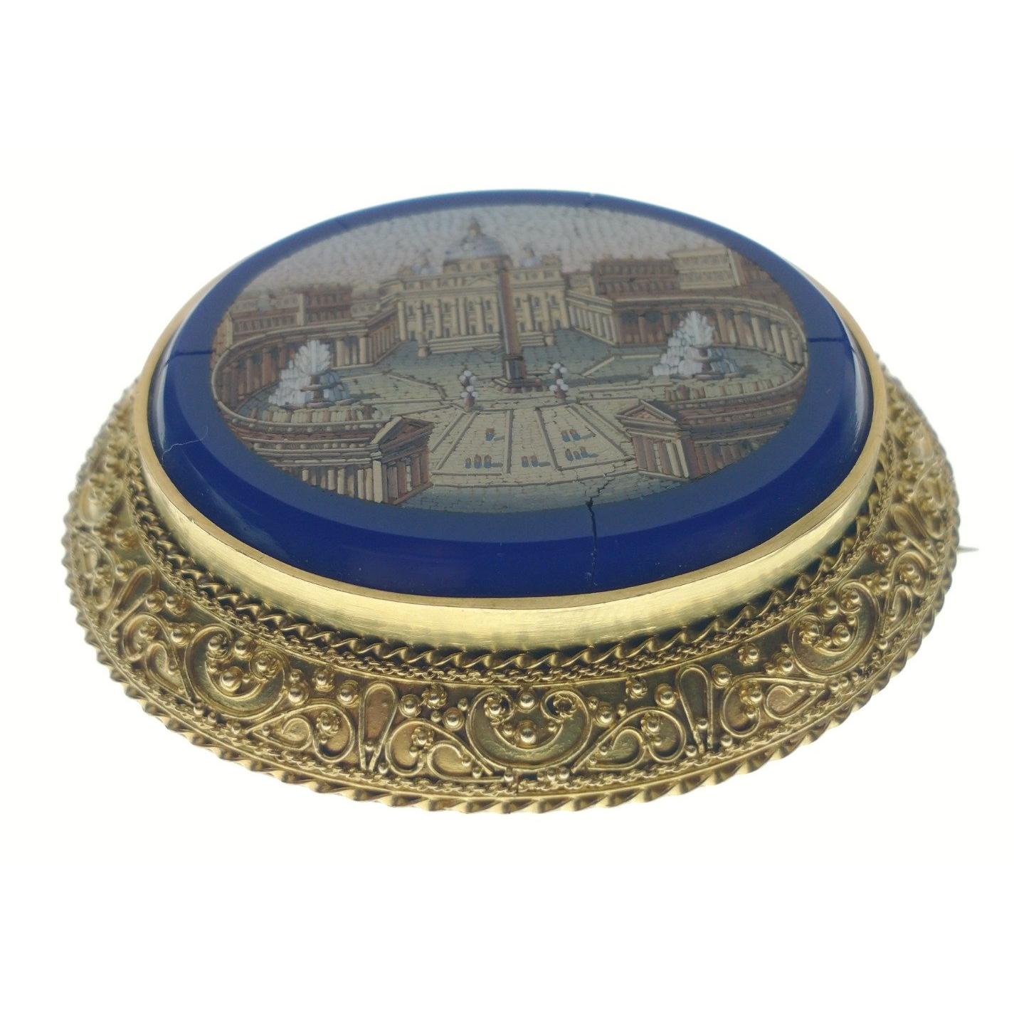 ANTIQUE MICRO MOSAIC 'fine yellow metal' oval BROOCH depicting St Peter's in The Vatican City, the brooch has some cracks on the back of the brooch, micro mosaic looks intact, this does not detract in any way the beauty of this item - this has been passed down within the family from the Italian visit of the Grand Tour - dimensions 5.5cm length x 4.75cm, and gross weight 19.90g