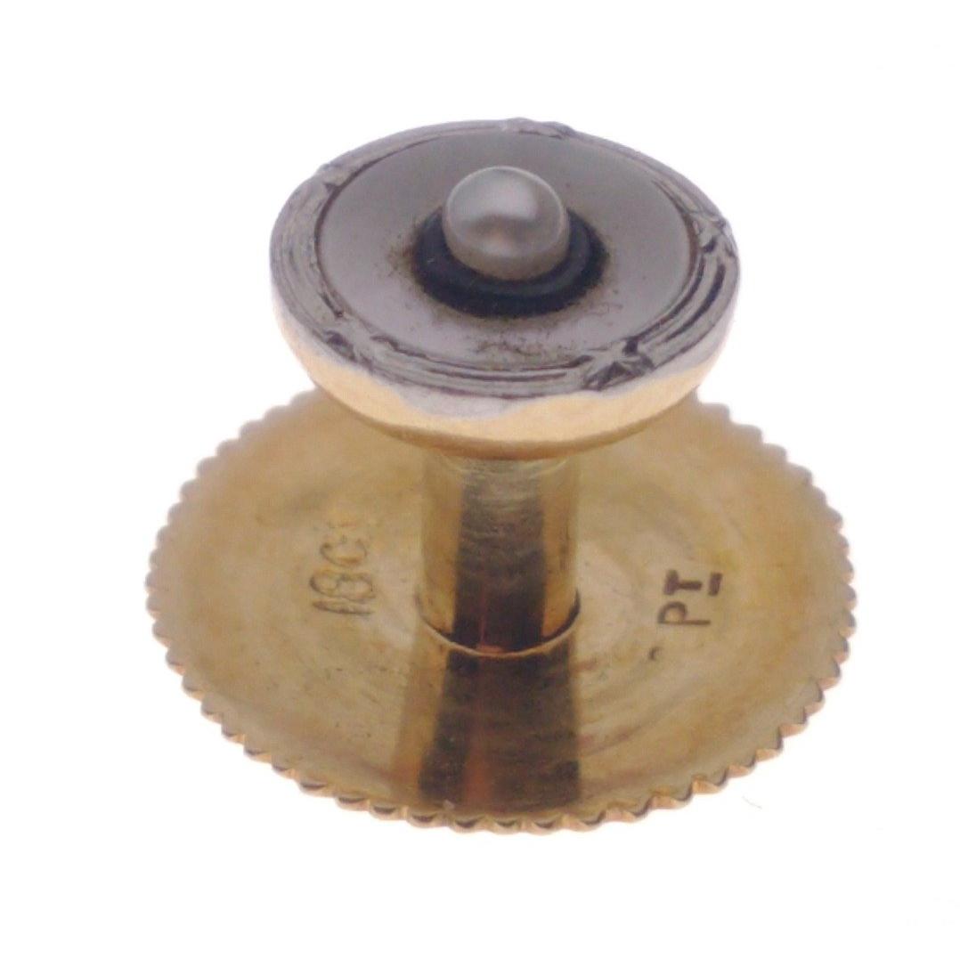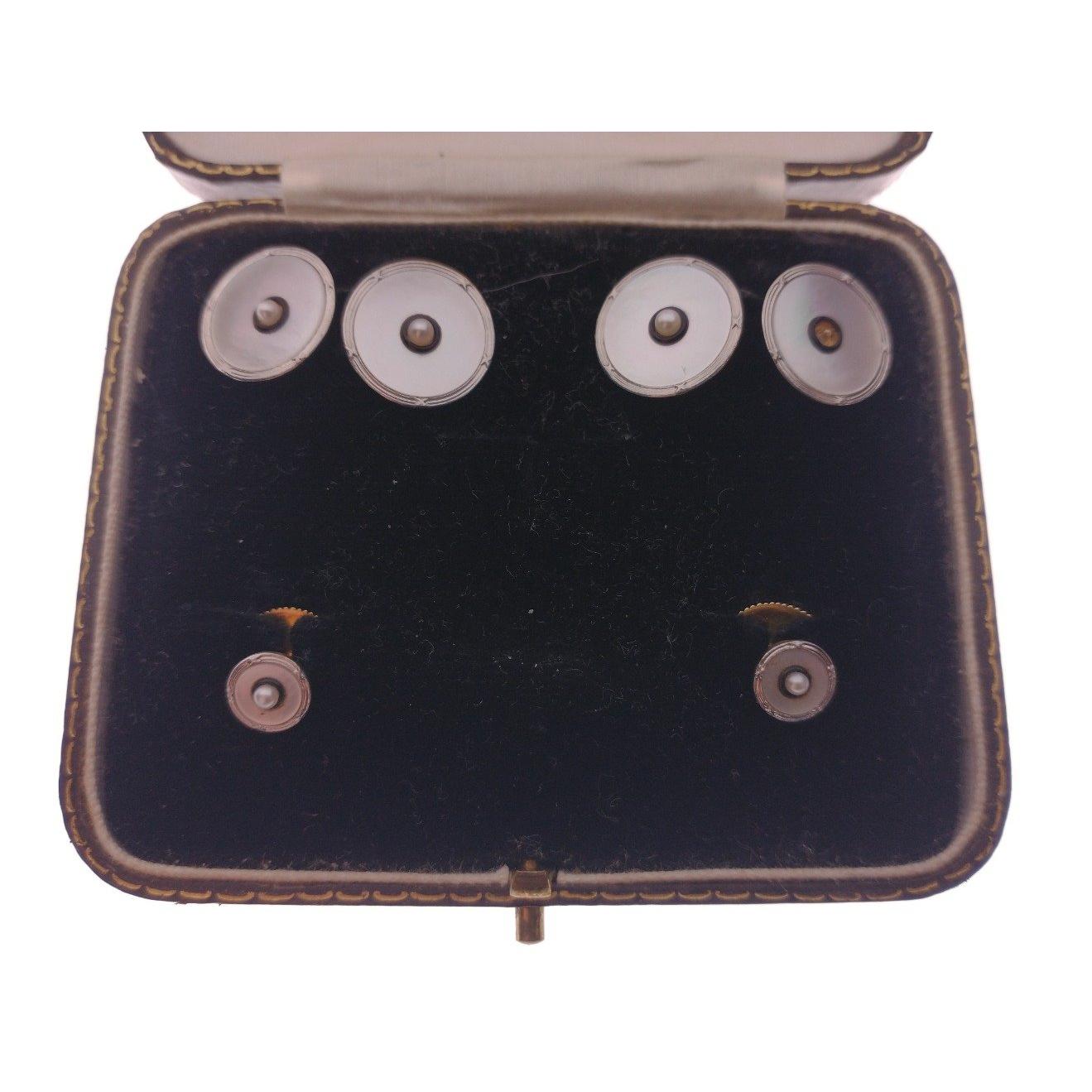 A pair of 18ct stamped mother of pearl CUFFLINKS set in platinum with a pair of matching COLLAR STUDS, all within original jewellers display box - gross weight 9.90g (matches previous lot)