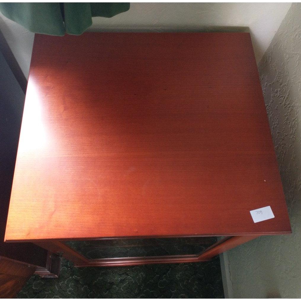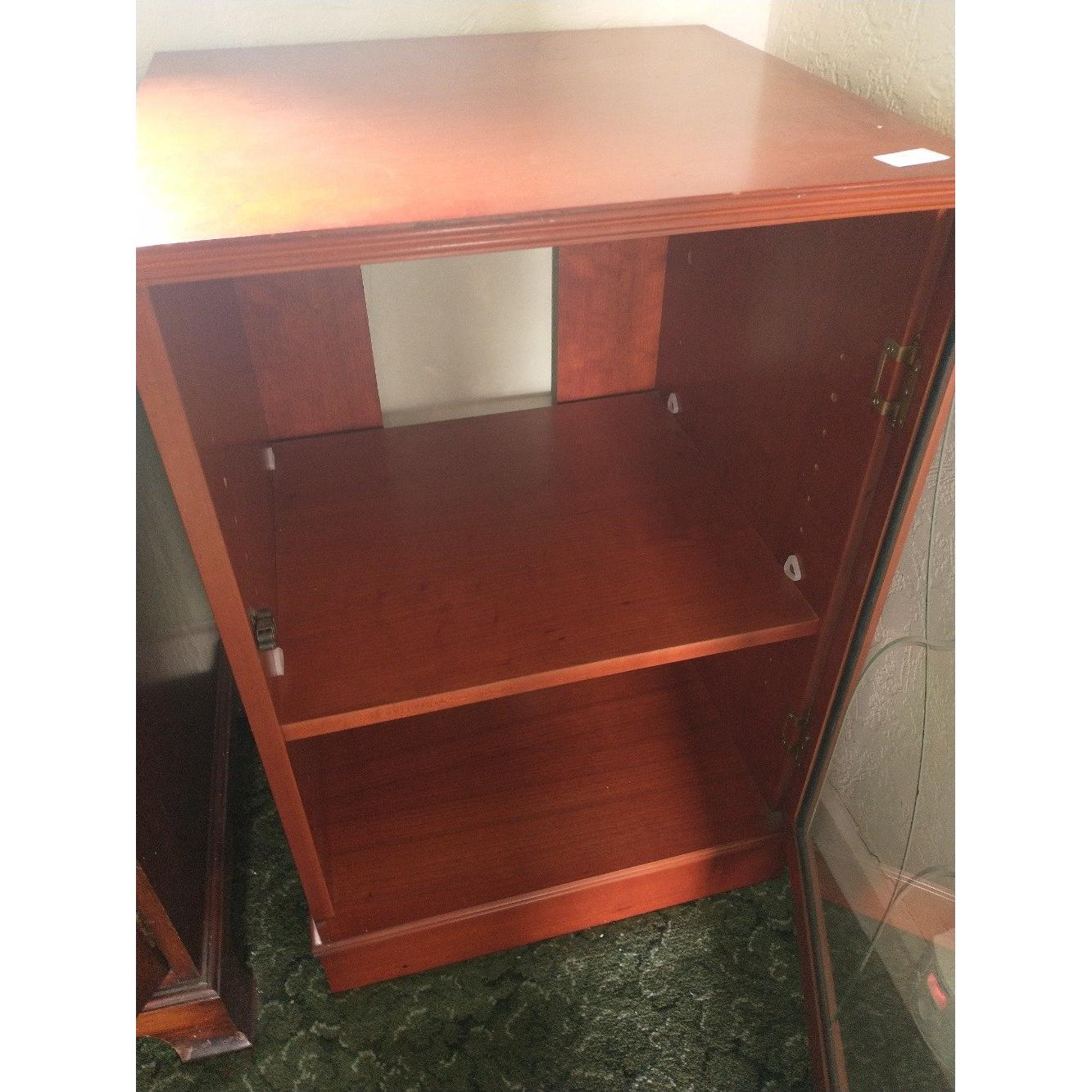 Wooden glass fronted record/media cabinetW: 49cm approx H: 75cm approx D: 45cm approx