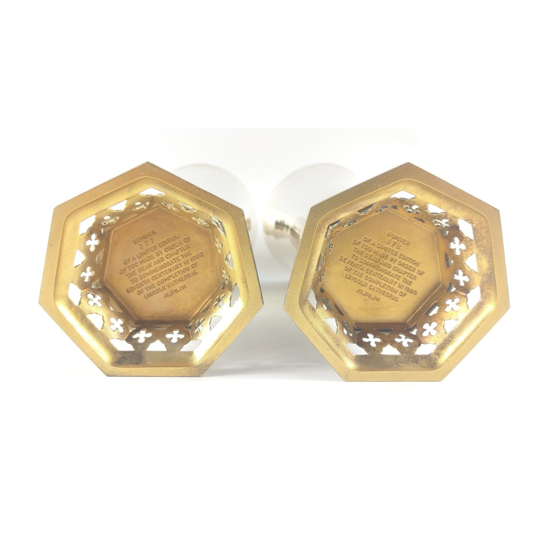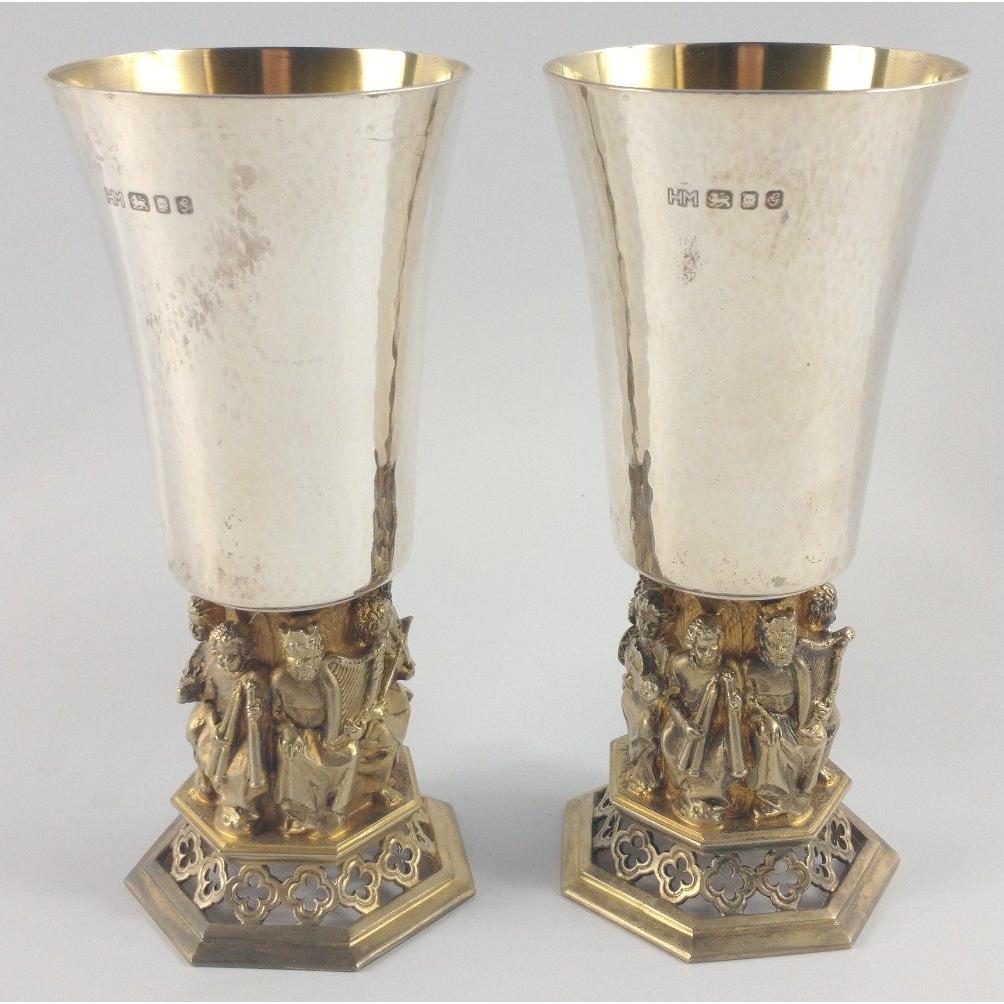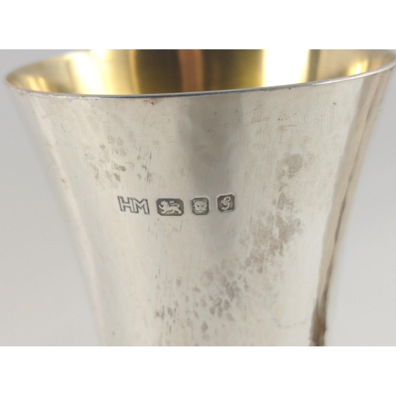 A pair of silver London hallmarked 1981 by HECTOR MILLER wine GOBLETS Nos 377 & 378 of a limited edition of 700 made to commemorate the 7th Century of the completion of Lincoln Cathedral in 1980. 16.5cm height x 7.5cm diameter, combined gross weight 630g