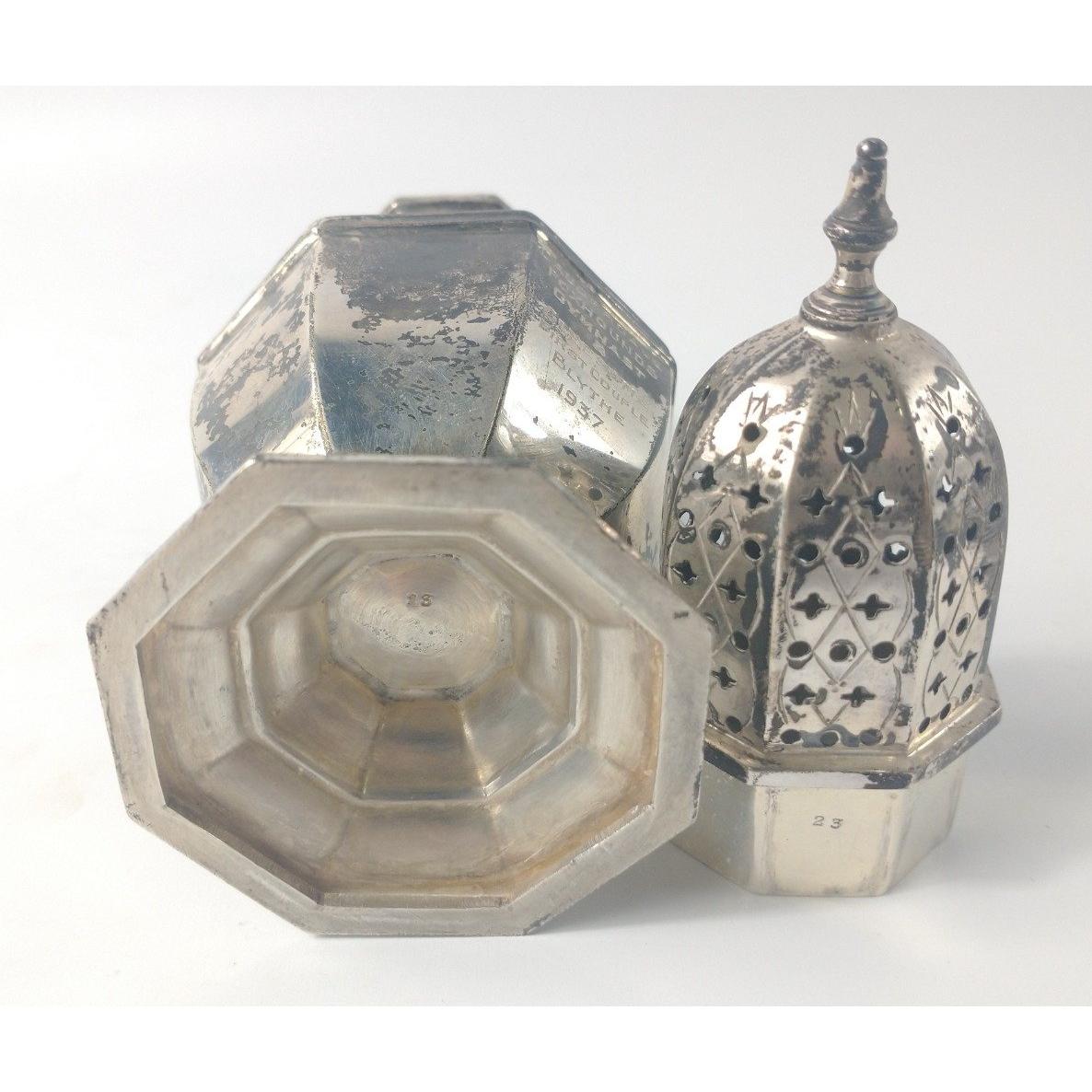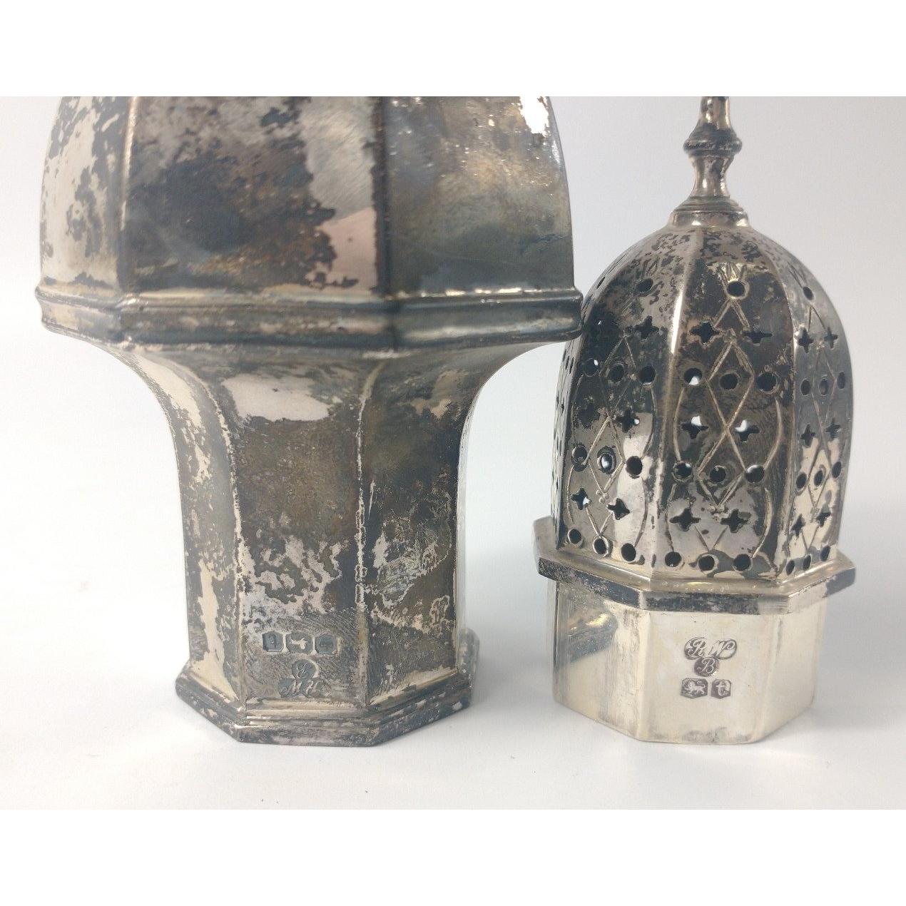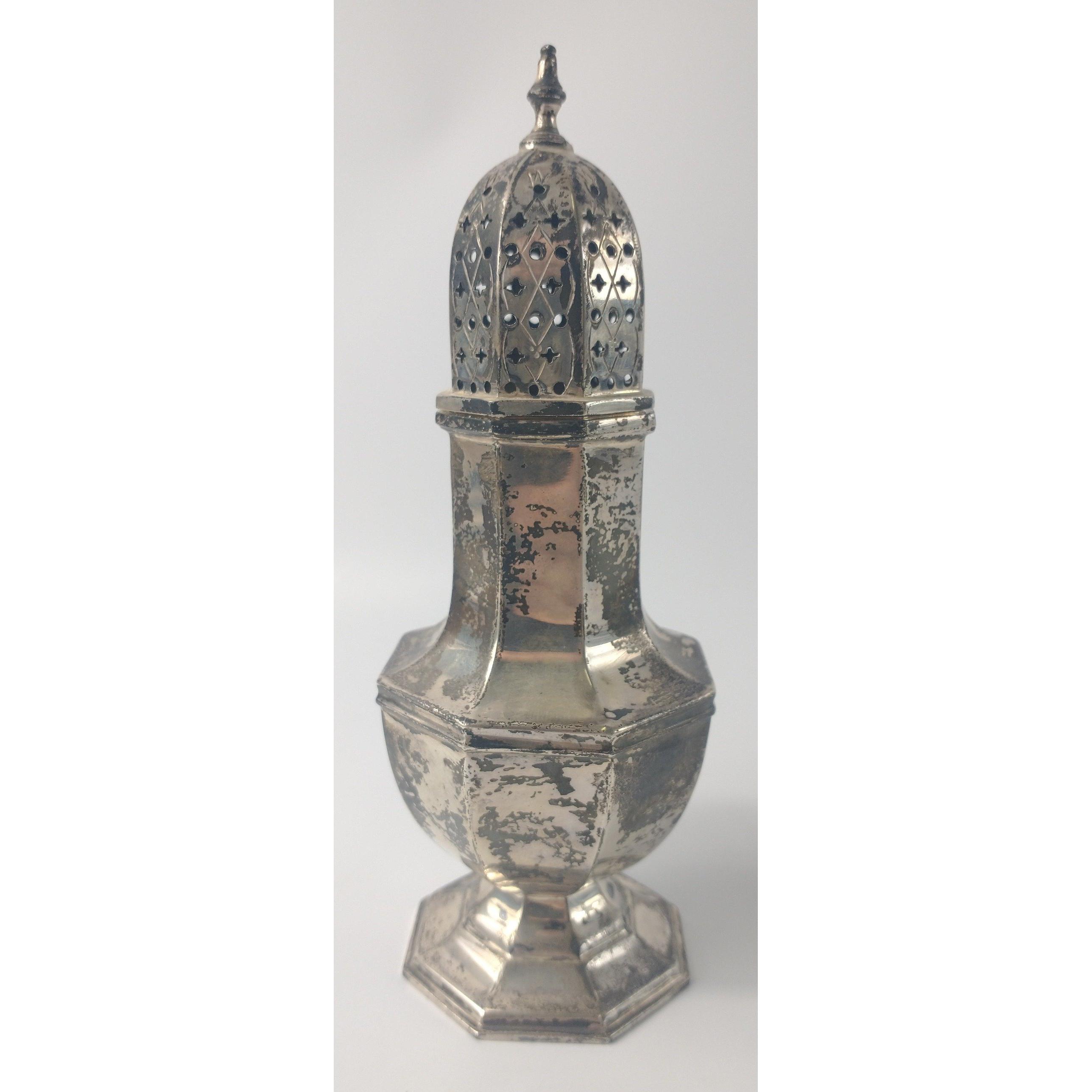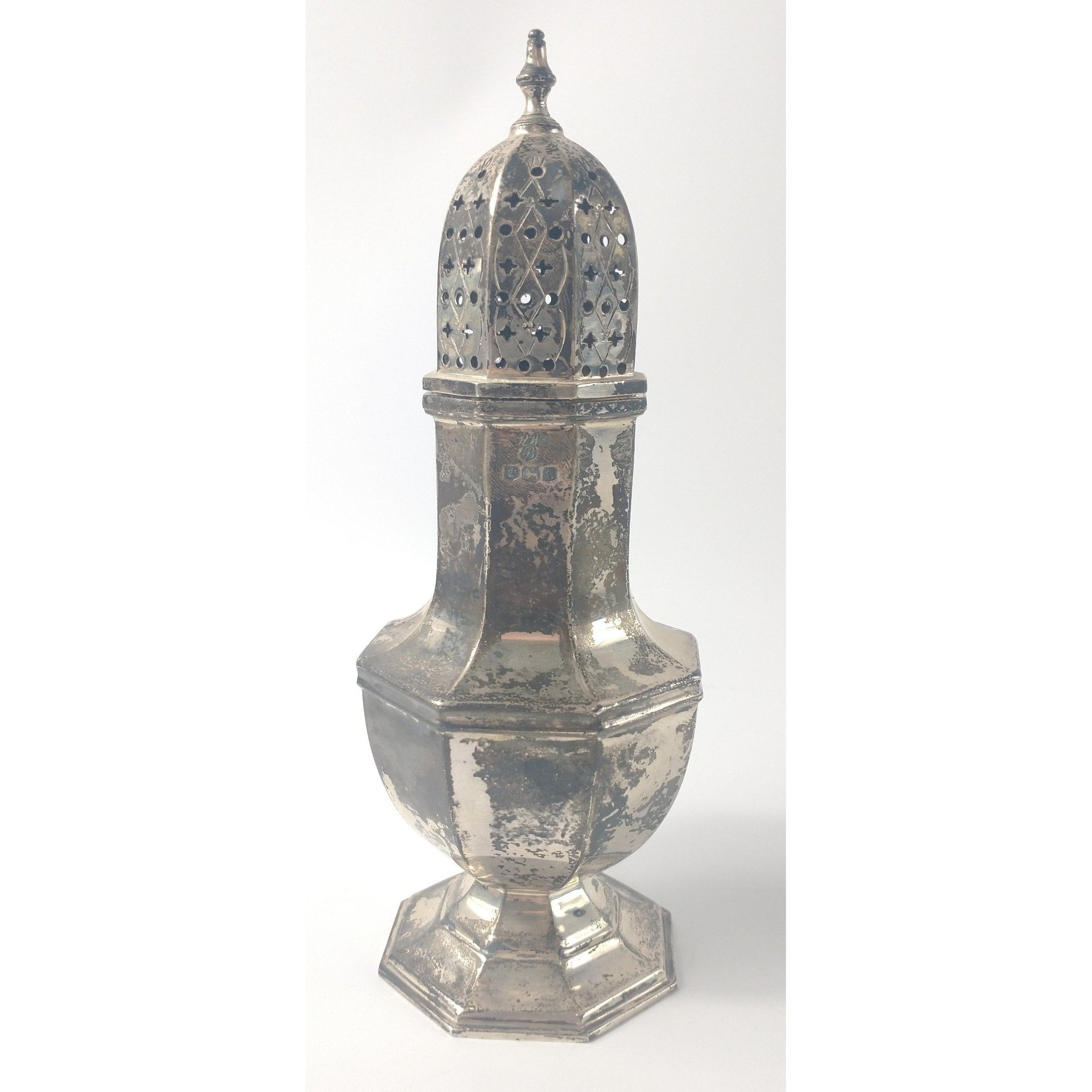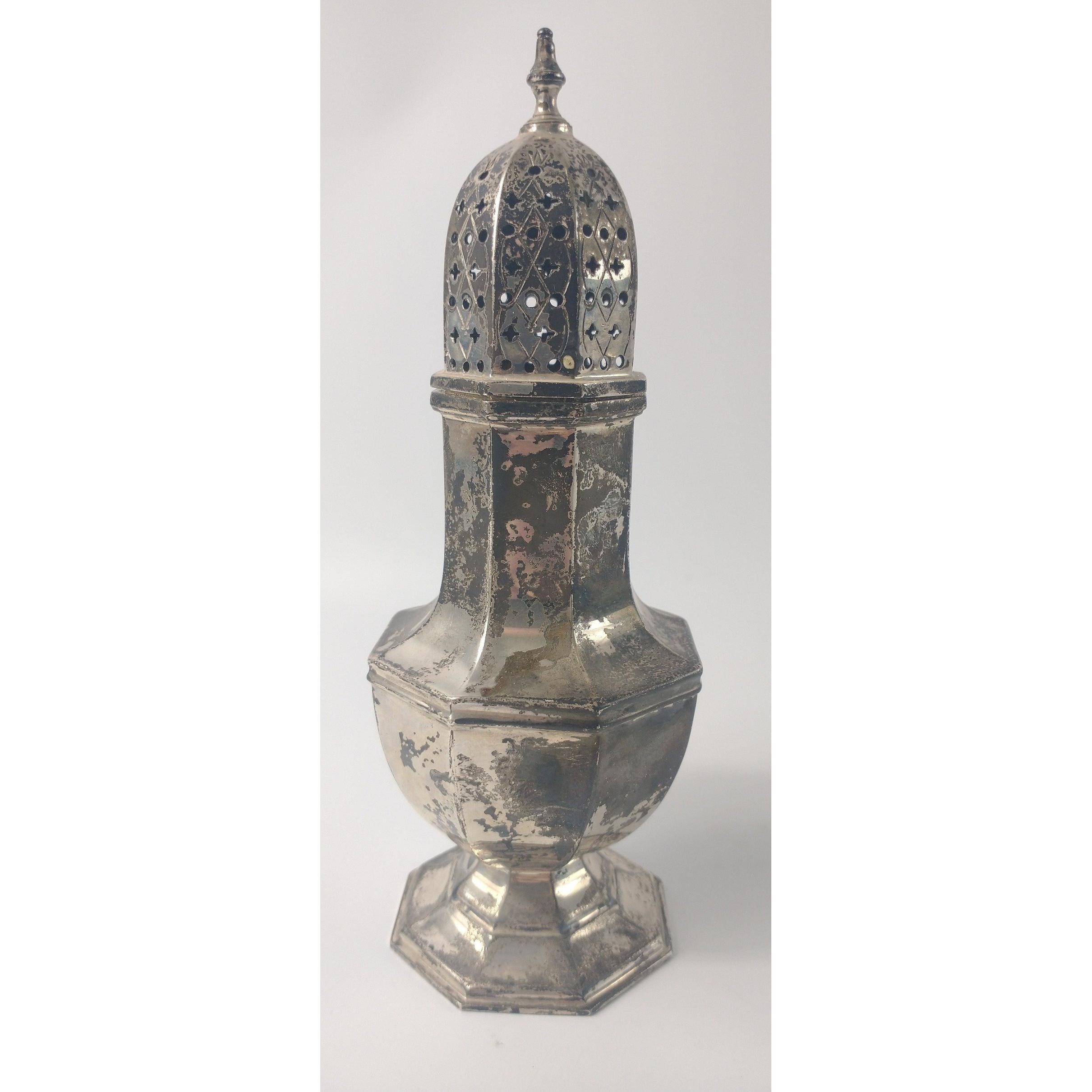 A Sheffield hallmarked 1936 silver SUGAR SIFTER by silversmith RICHARD WOODMAN BURBRIDGE, HARRODS of London, dimensions 18cm high, and 175g weight approx