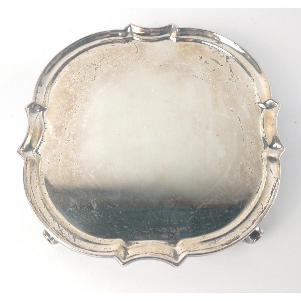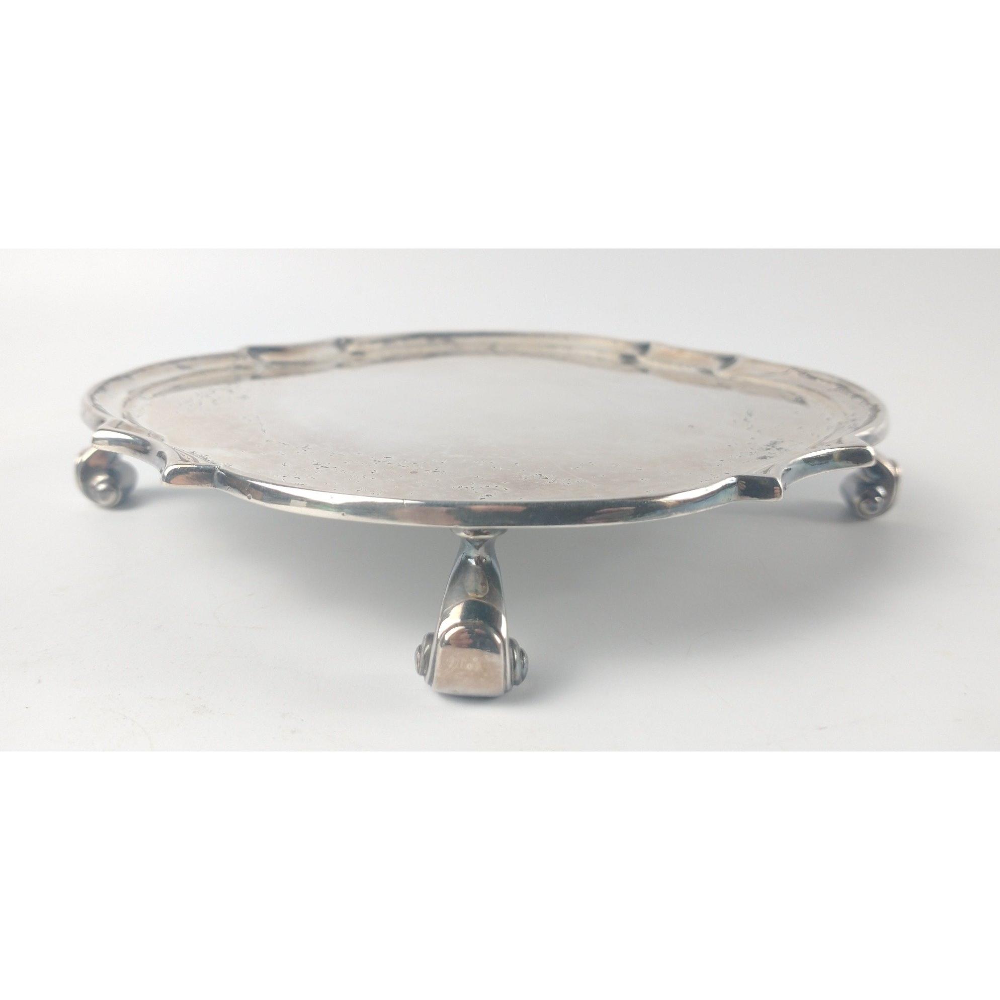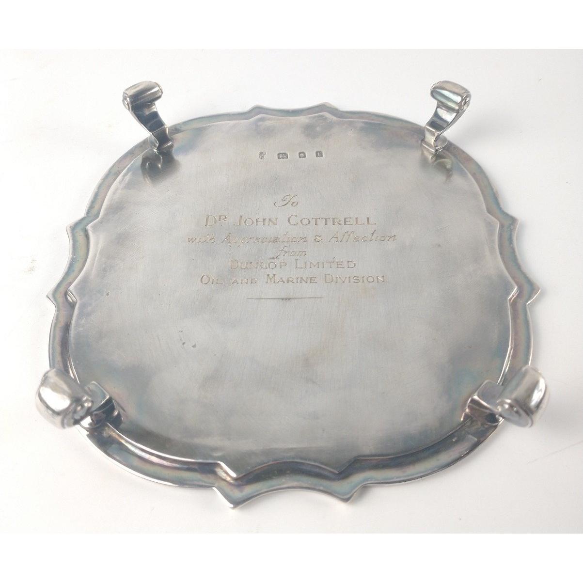 A London silver hallmarked 1932 small presentation TRAY to Dr John Cottrell, from DUNLOP Ltd Oil & Marine Division, dimension 15cm diameter and weight 240g approxGross weight approx 240g
