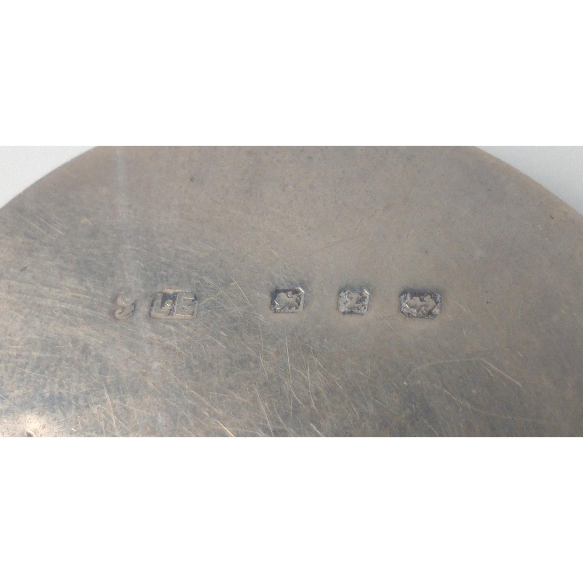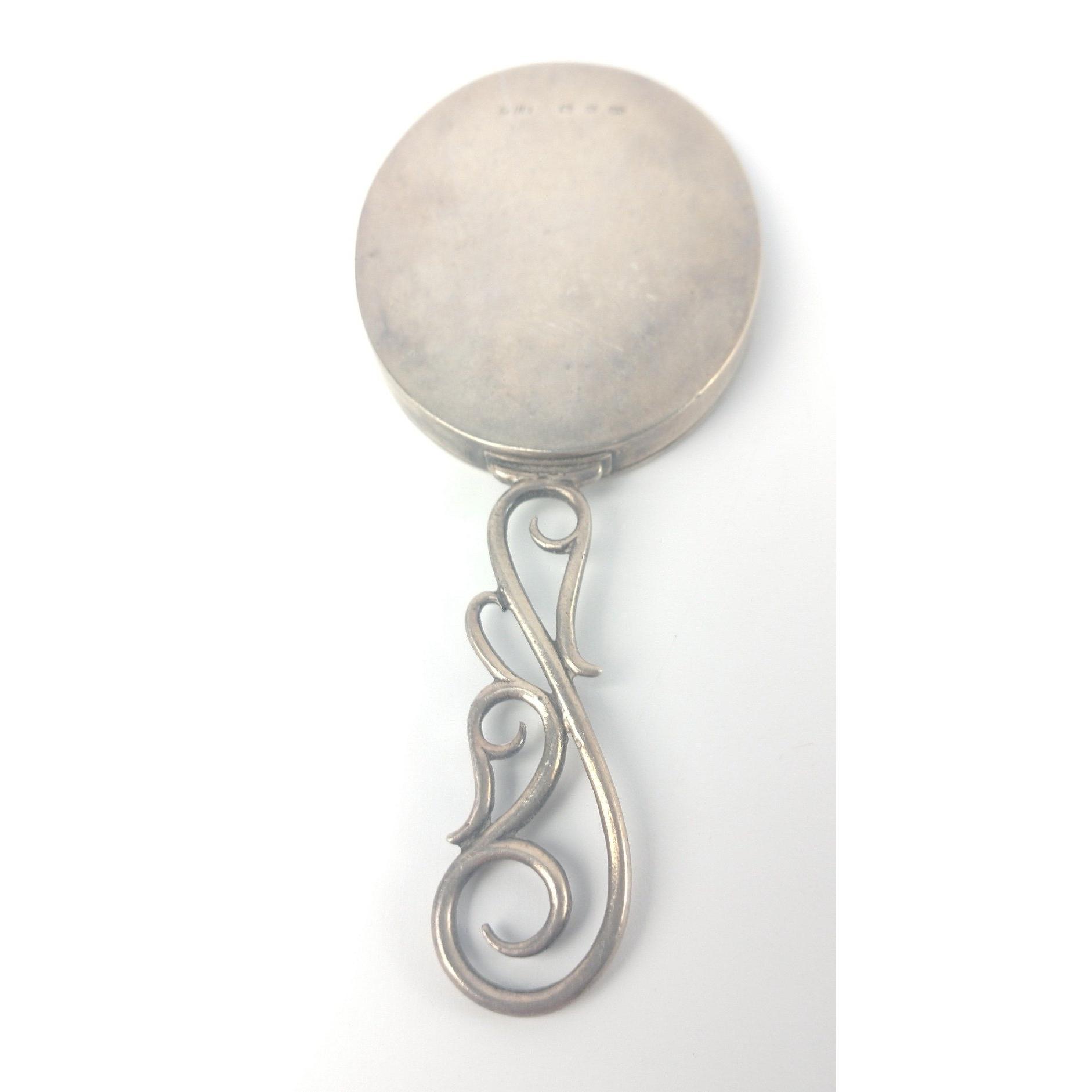 A small silver Birmingham hallmarked 1899 oval HAND MIRROR with scroll handle, by silversmith L.E, dimensions 12cm length x 5cm width and gross weight 50gGross weight approx 50g