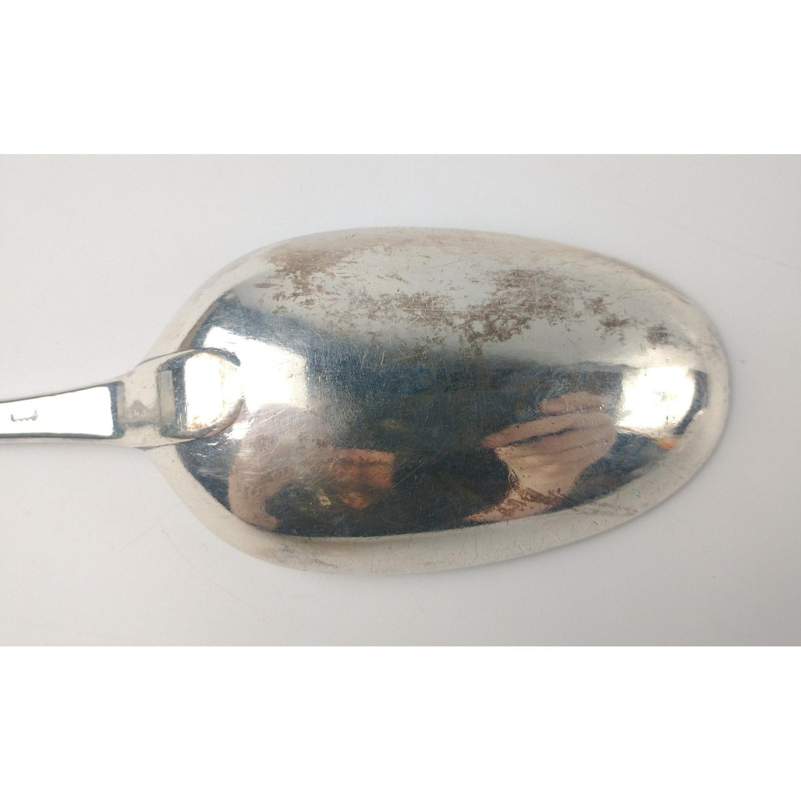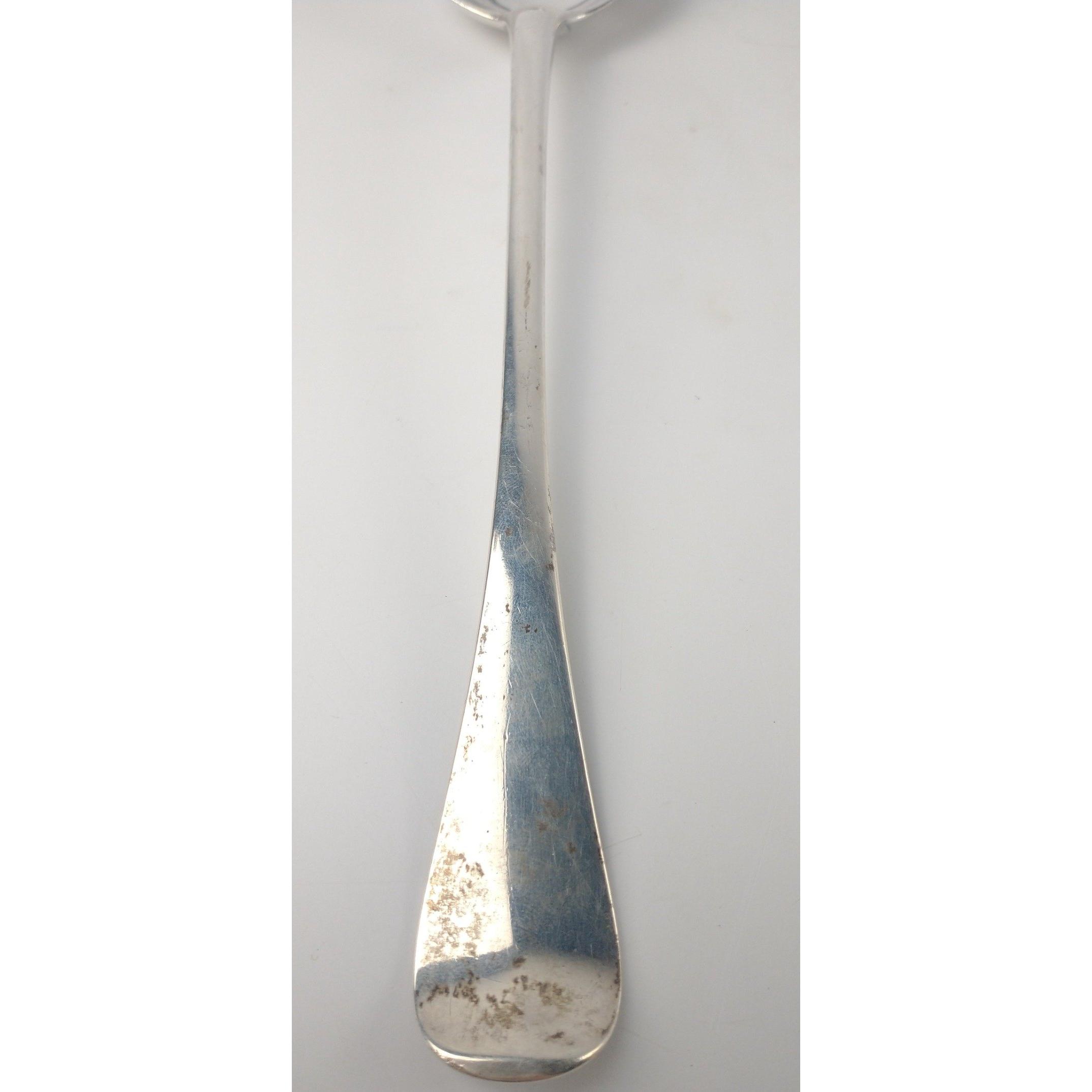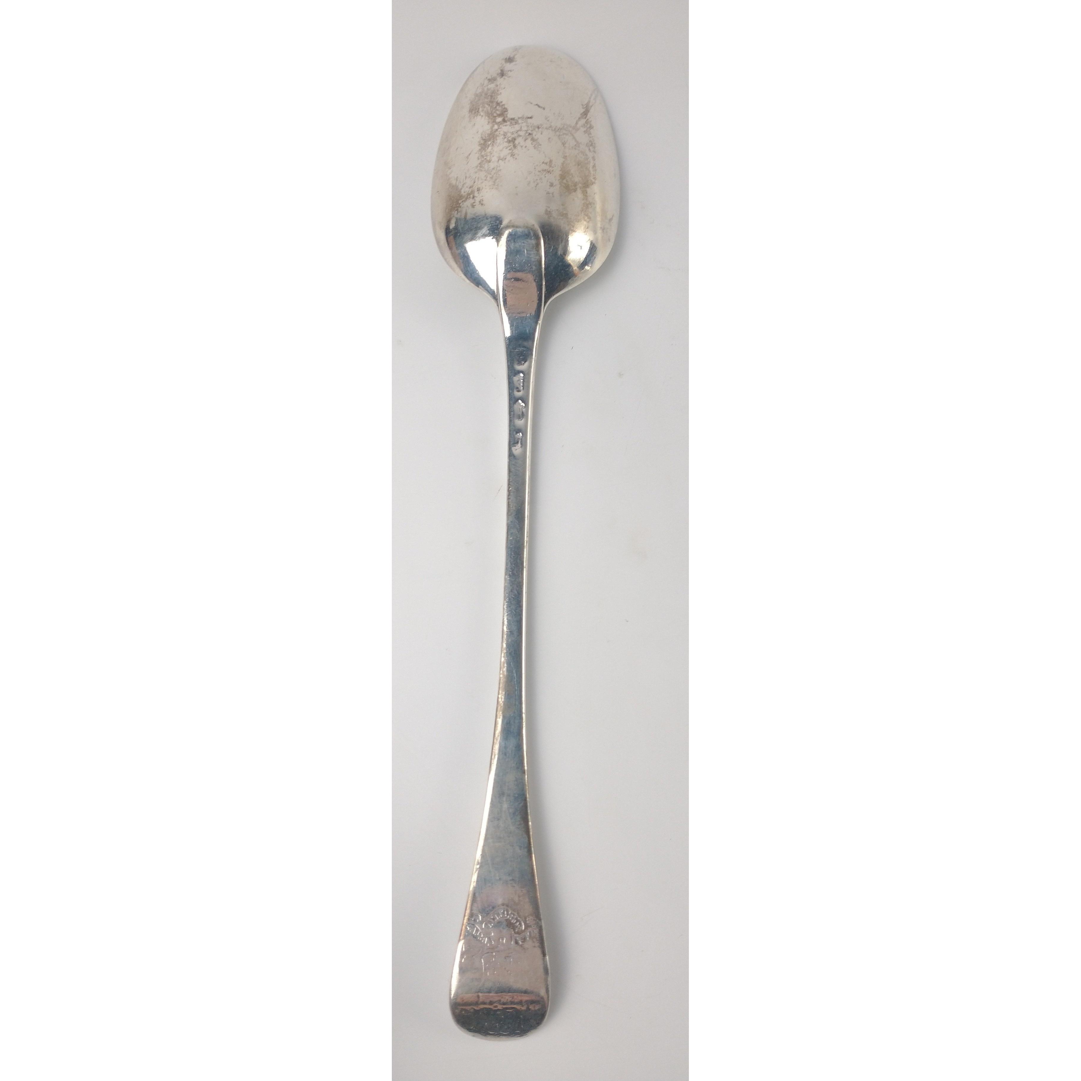 An early London silver hallmarked (Hallmark indistinct) BASTING SPOON, silversmith indistinct, dimensions 34cm long, actual spoon pan 11cm x 6.5cm approx, weight 185g.