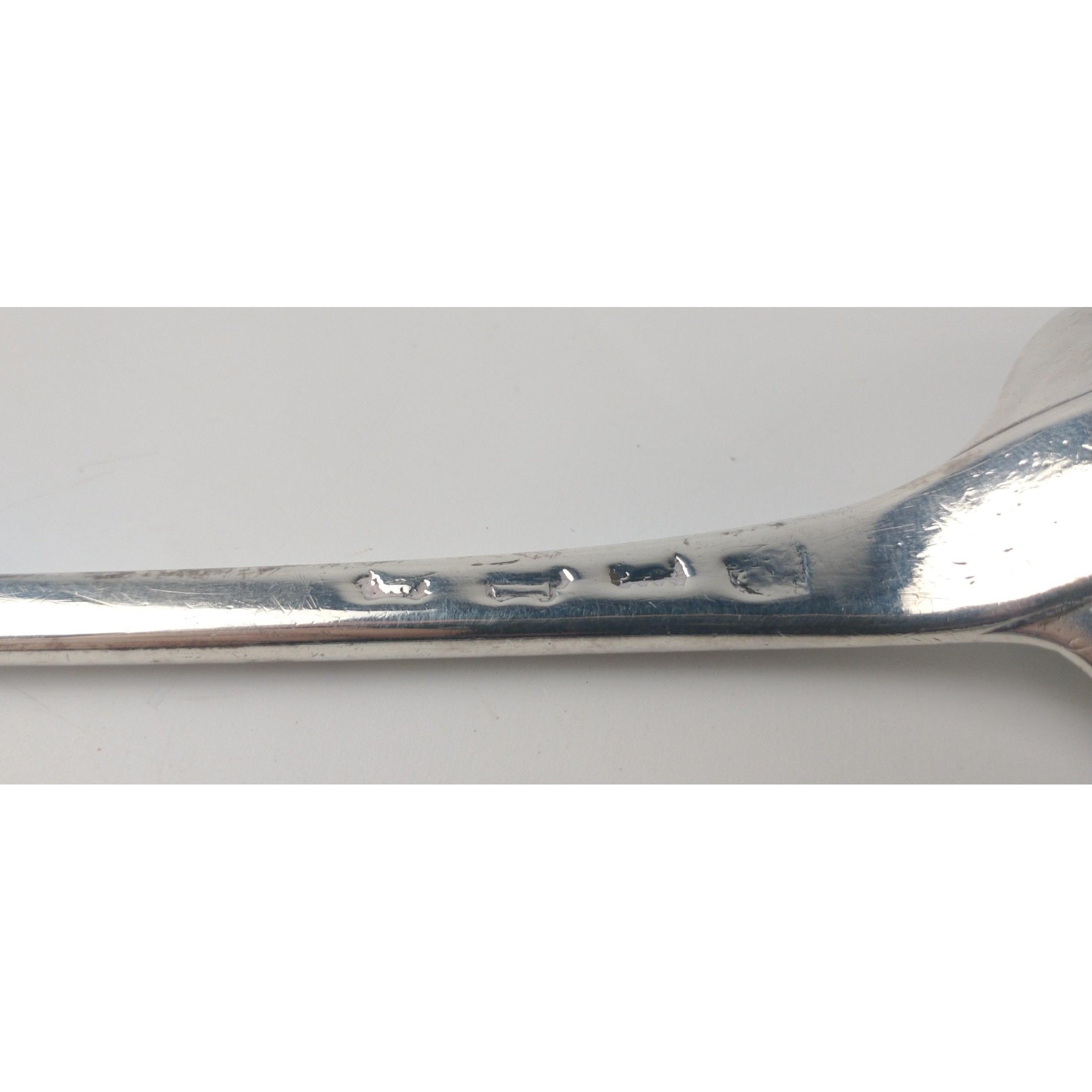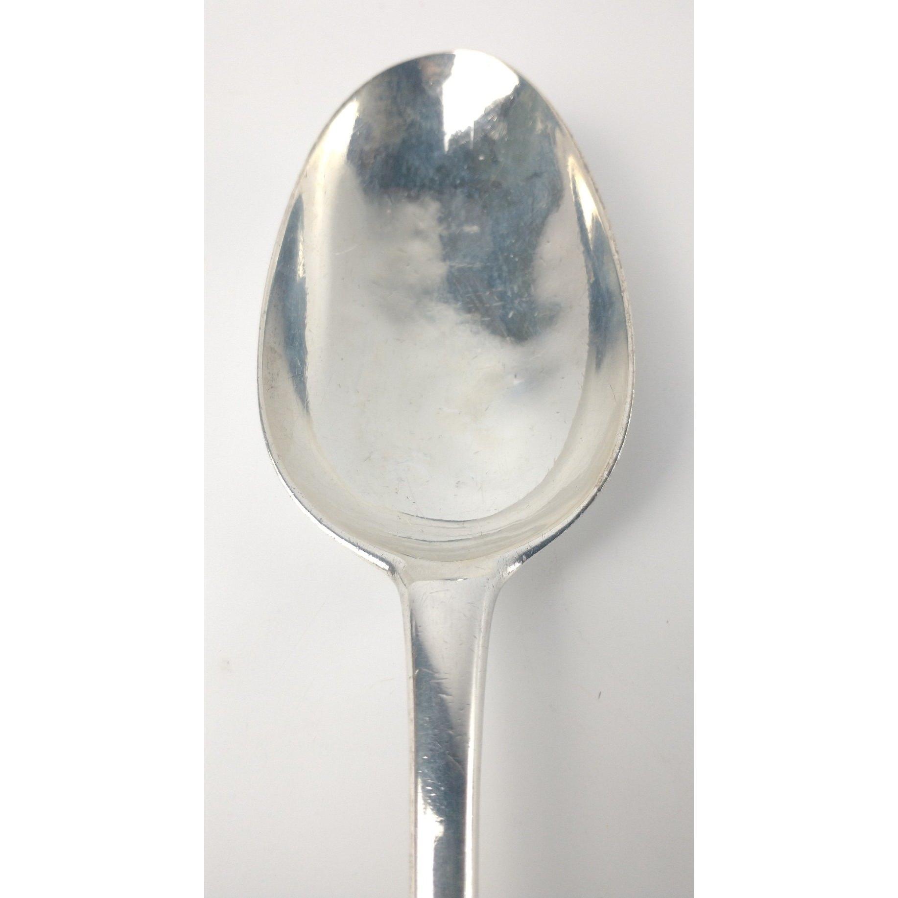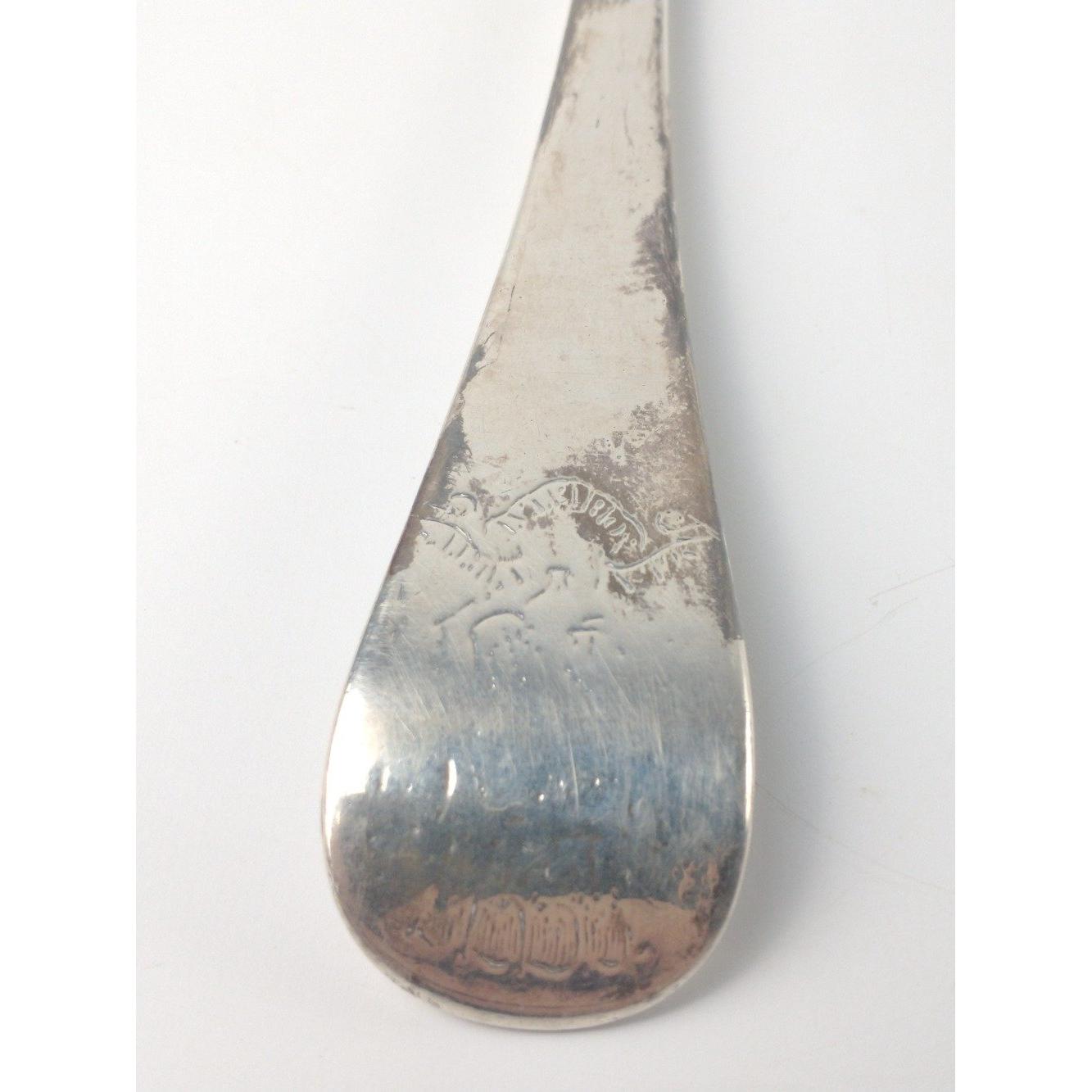 An early London silver hallmarked (Hallmark indistinct) BASTING SPOON, silversmith indistinct, dimensions 34cm long, actual spoon pan 11cm x 6.5cm approx, weight 185g.