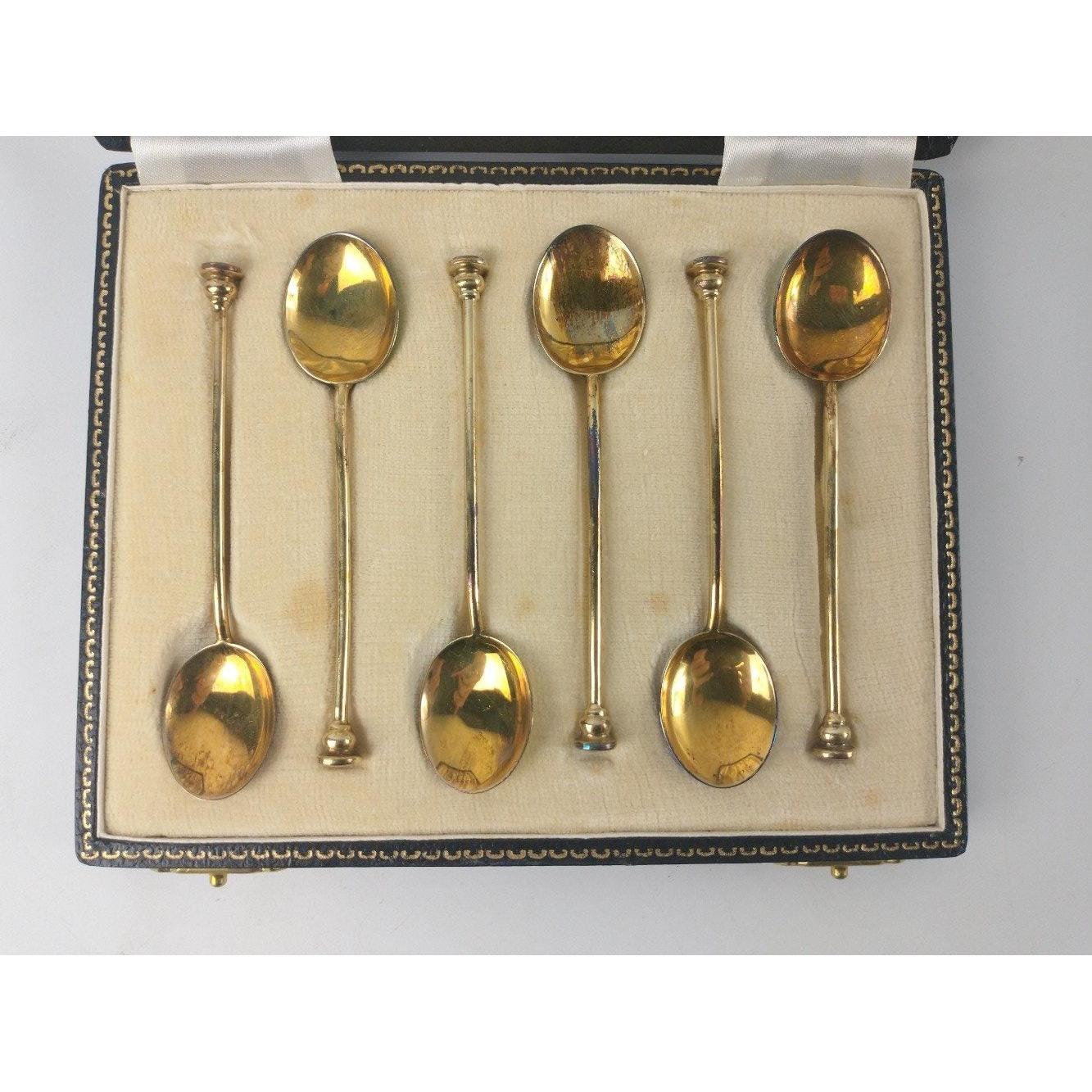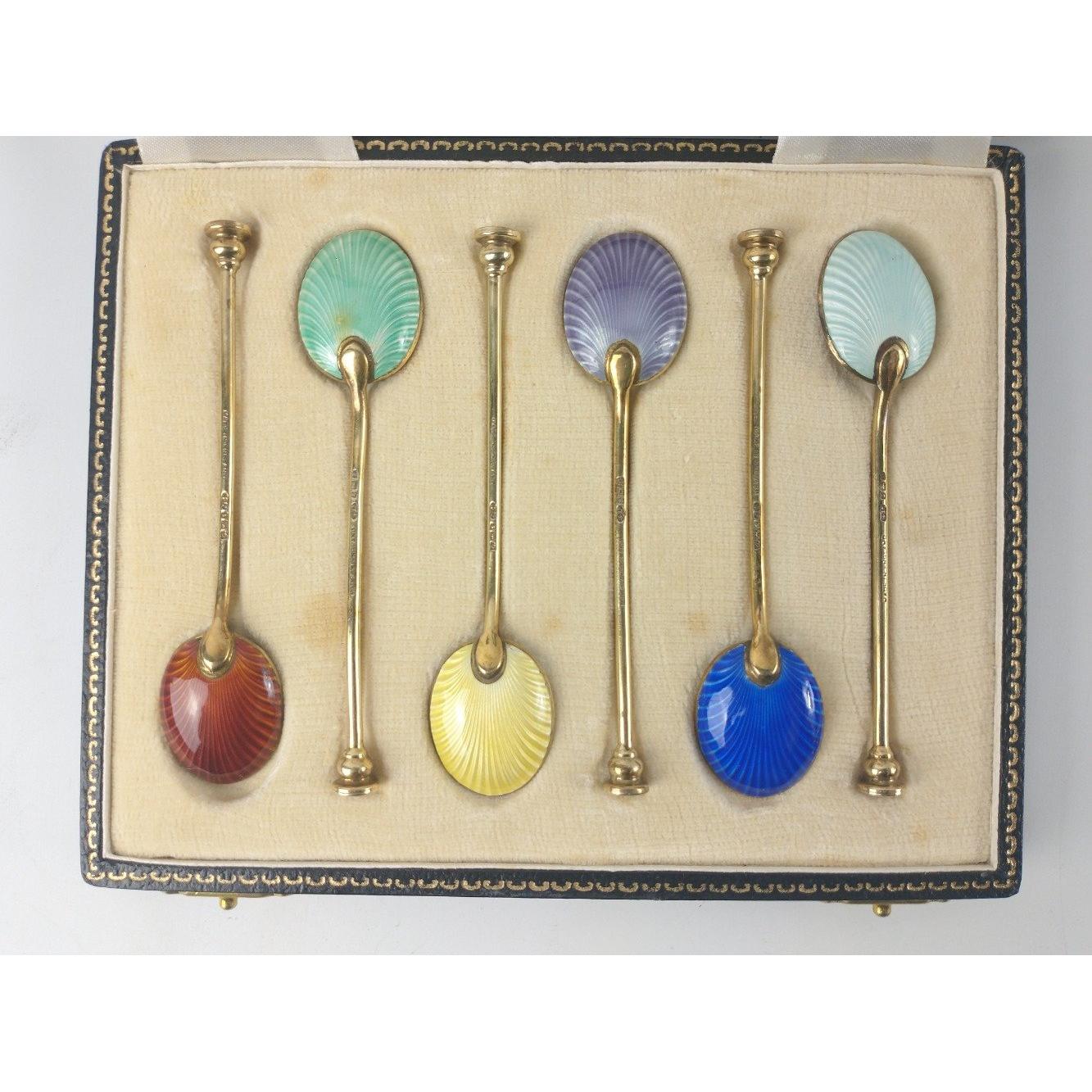 A boxed set of six enamelled and gilded Birmingham silver hallmarked 1953 COFFEE SPOONS in original presentation case, gross weight 58g. Approx 6 pieces