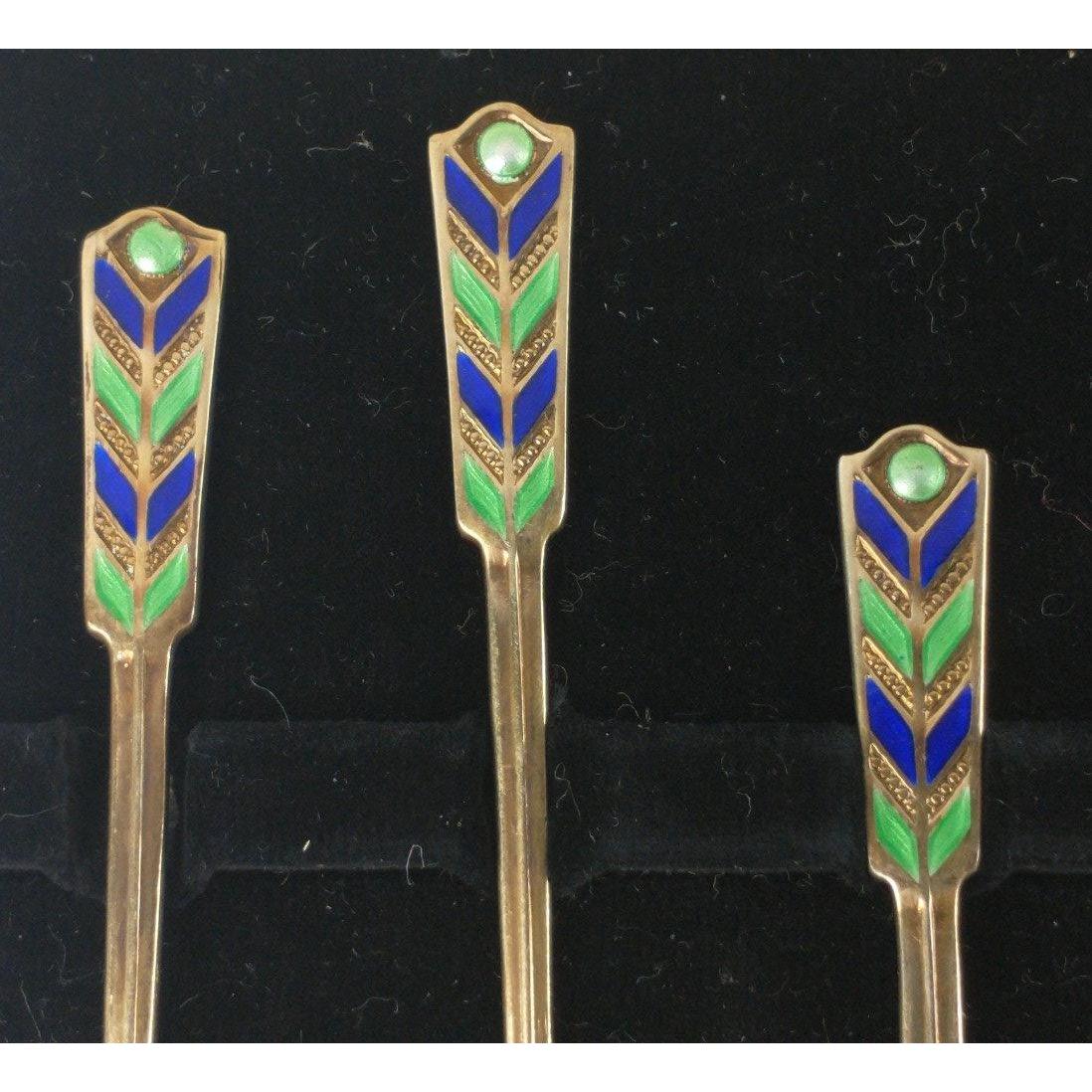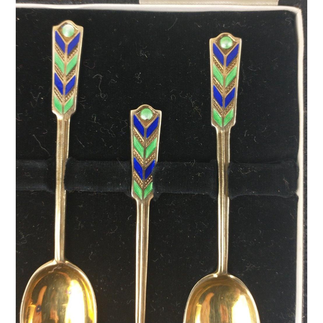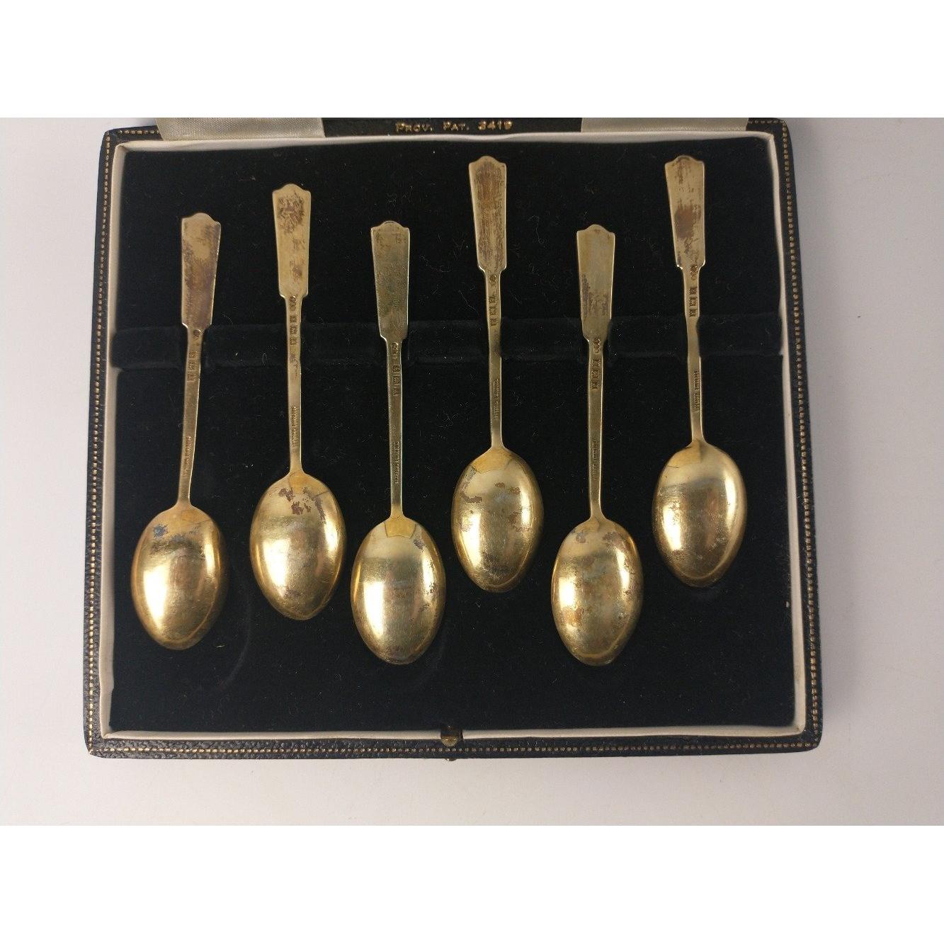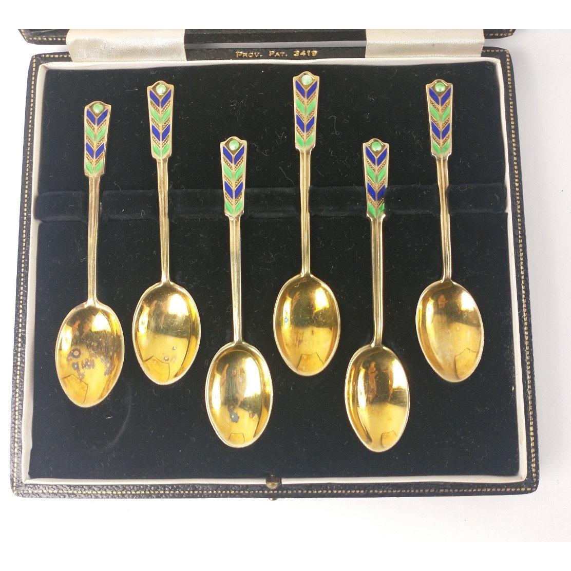 A boxed set of six enamelled and gilded Birmingham silver hallmarked 1950 COFFEE SPOONS in original presentation case, gross weight 60g. Approx 6 pieces