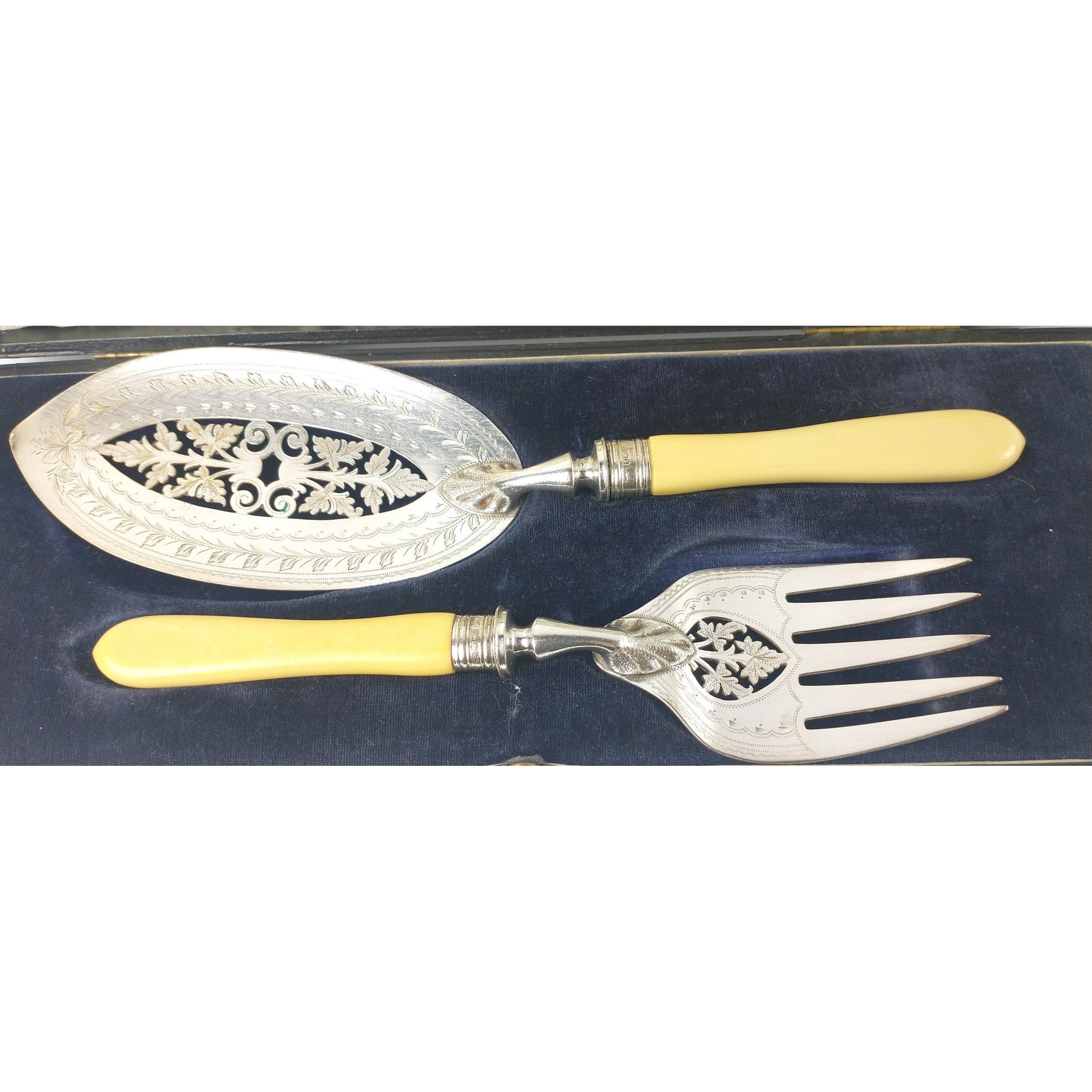 A boxed set of serving FISH KNIFE & FORK Sheffield silver hallmarked collar 1922, bone handled WALKER & HALL in original presentation case. Approx 2 pieces