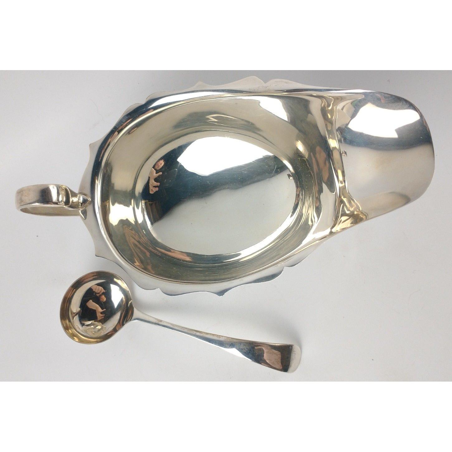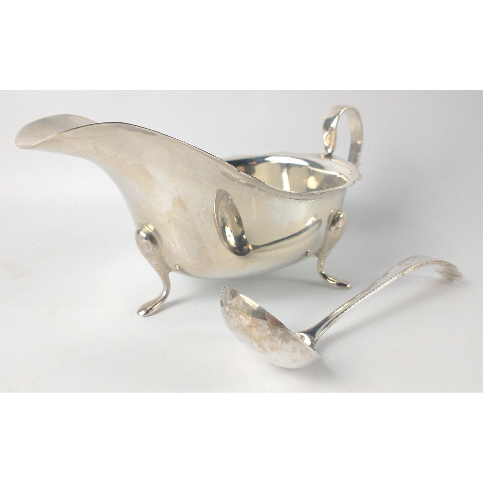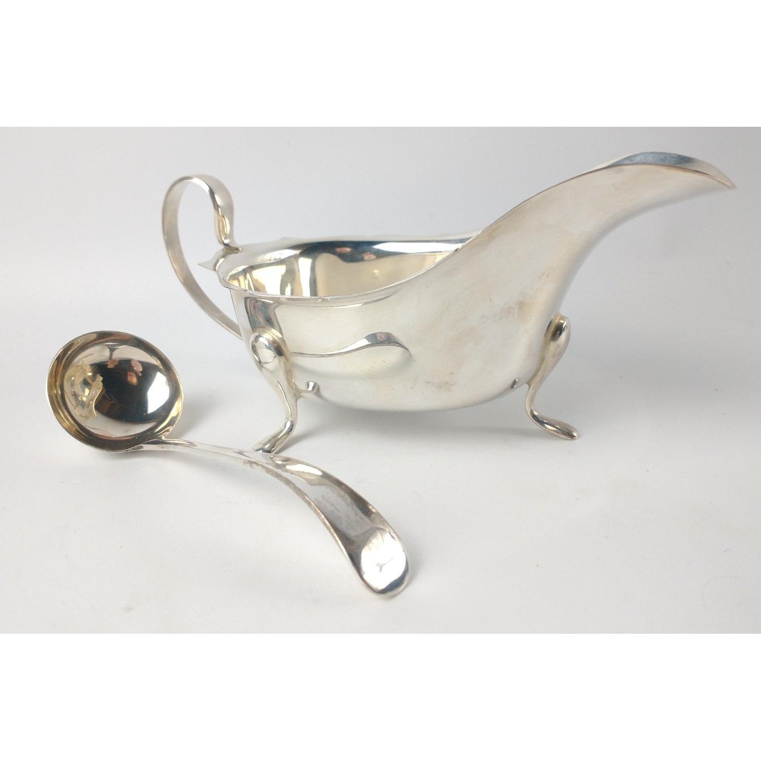 Boxed set of Sheffield sterling silver 1952 SAUCEBOAT (15.5cm x 9.5cm x 8.5cm) and LADLE (length 13cm x 4cm) in original presentation case, gross weight 189g. Approx 2 pieces