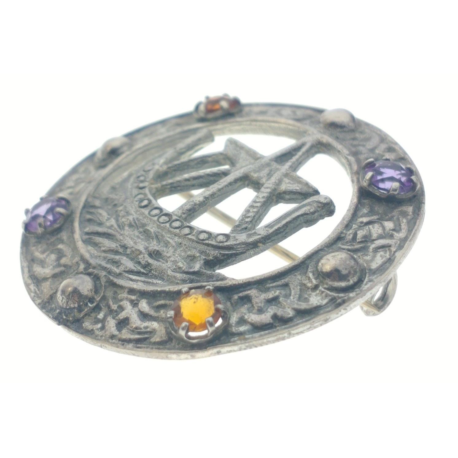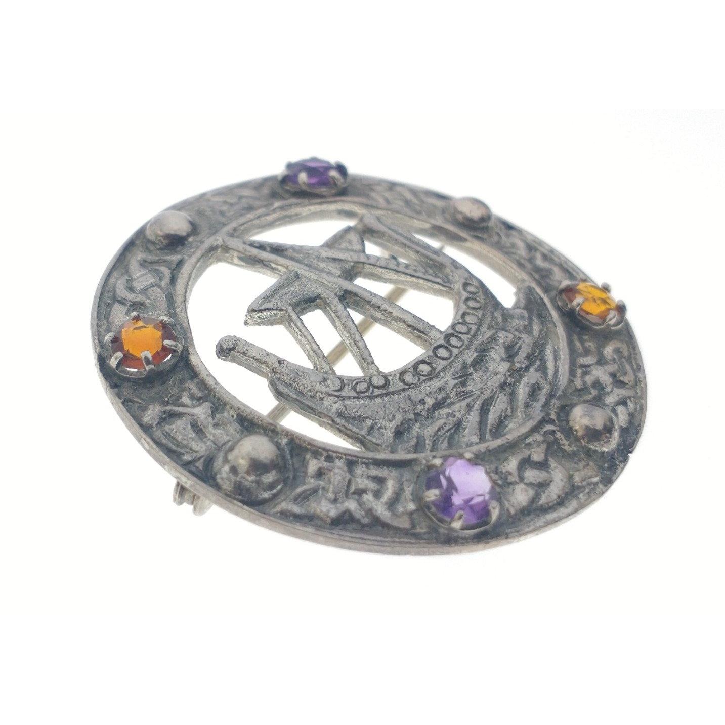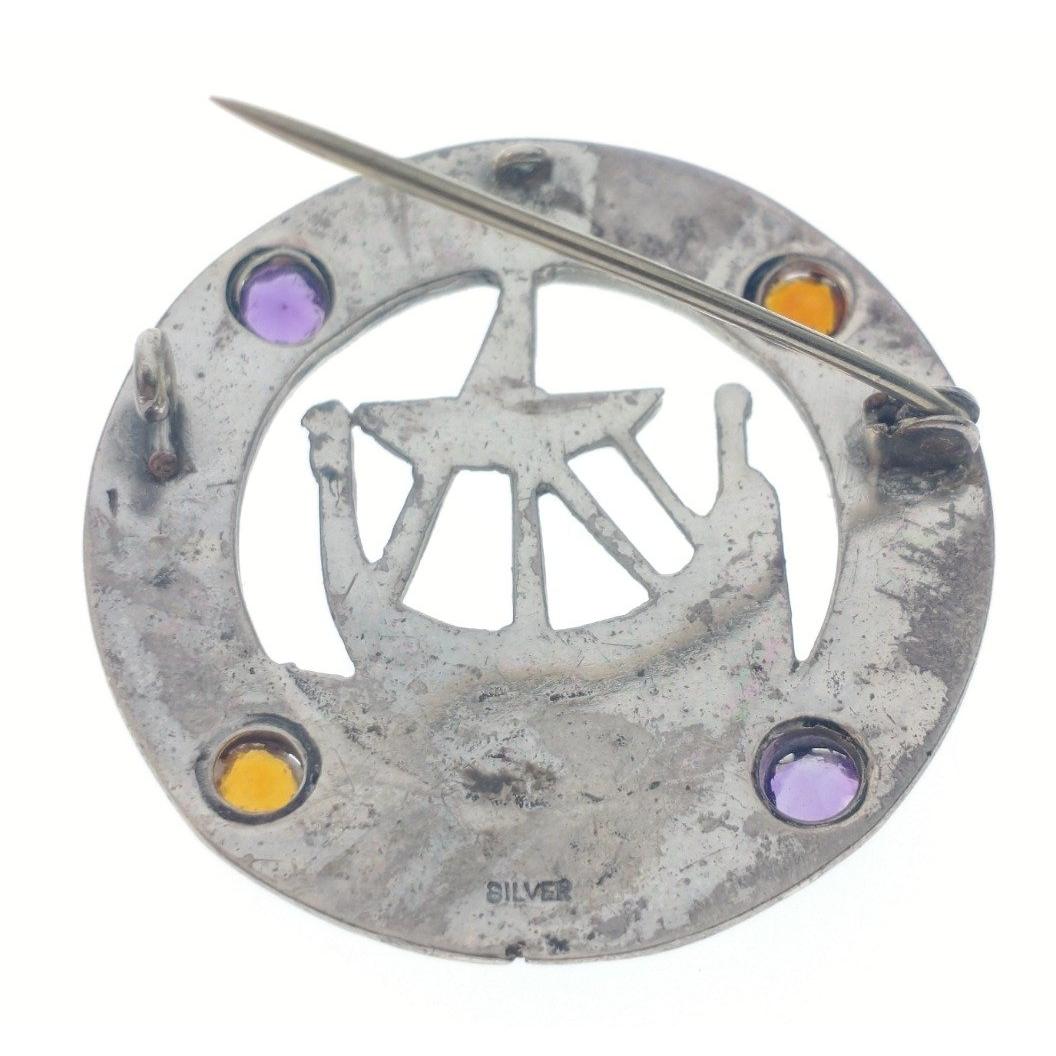 A VINTAGE CELTIC SHIELD form circular silver stamped' pin BROOCH depicting an early sailing ship on the sea, with two amber style stones and two purple amethyst style stones, 3.5cm diameter approx