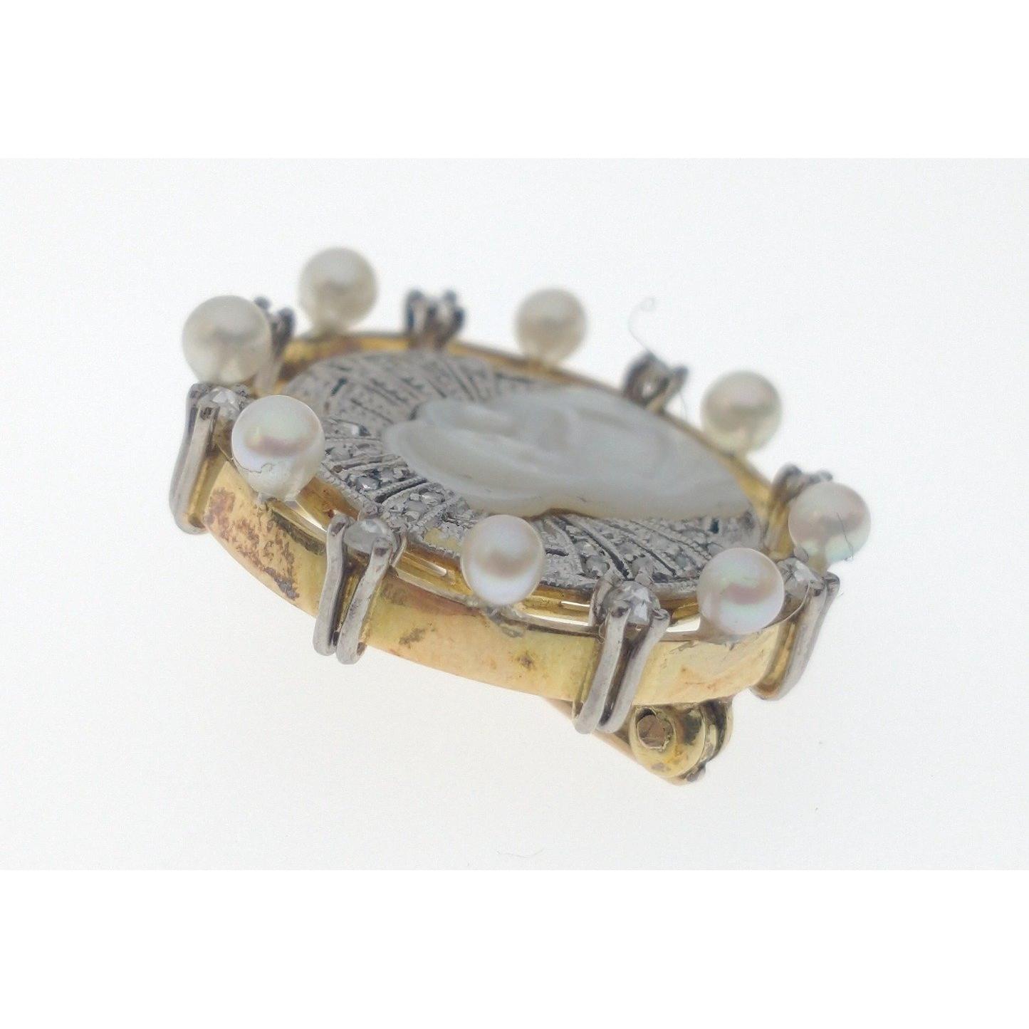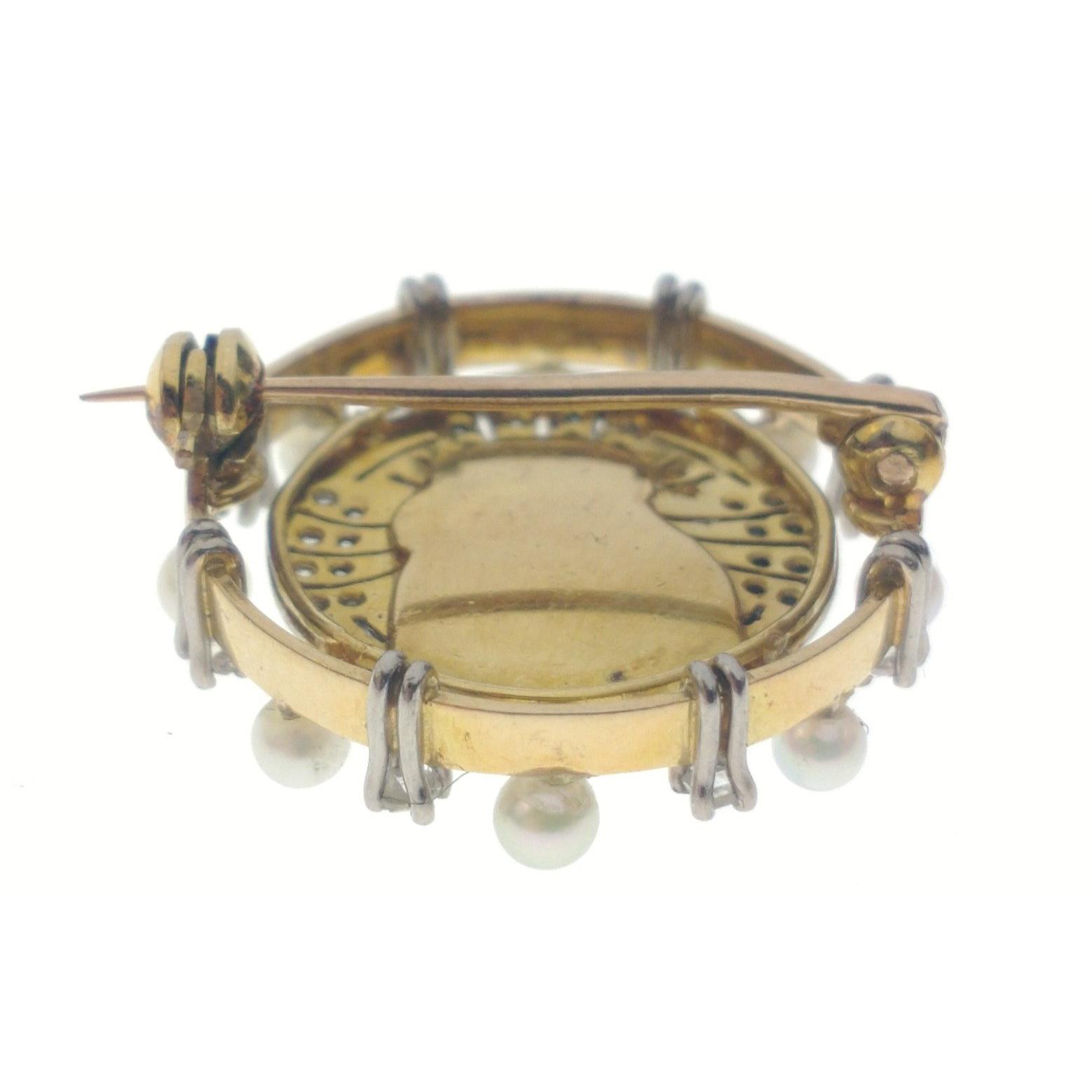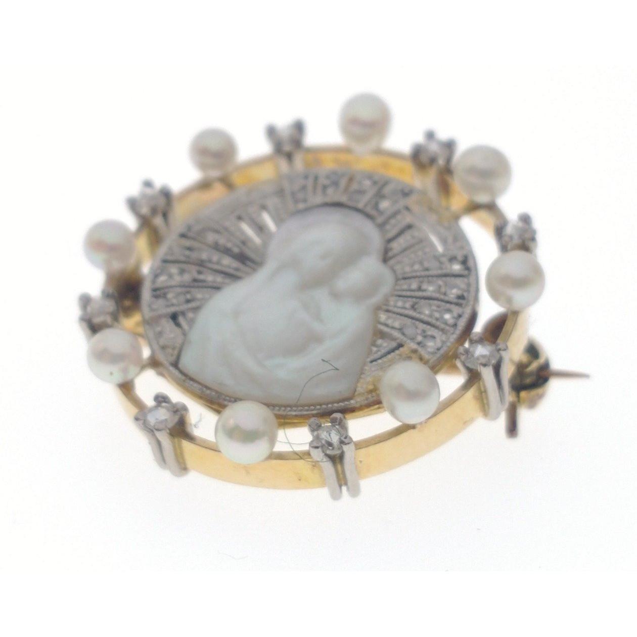 A vintage EXQUISITELY crafted in 'yellow metal' circular pin BROOCH with BIBLICAL Mary and her newborn child form within the centre, in mother of pearl, surrounded by eight small pearls and eight small DIAMONDS - 2cm in diameter, 4.26g weight approx