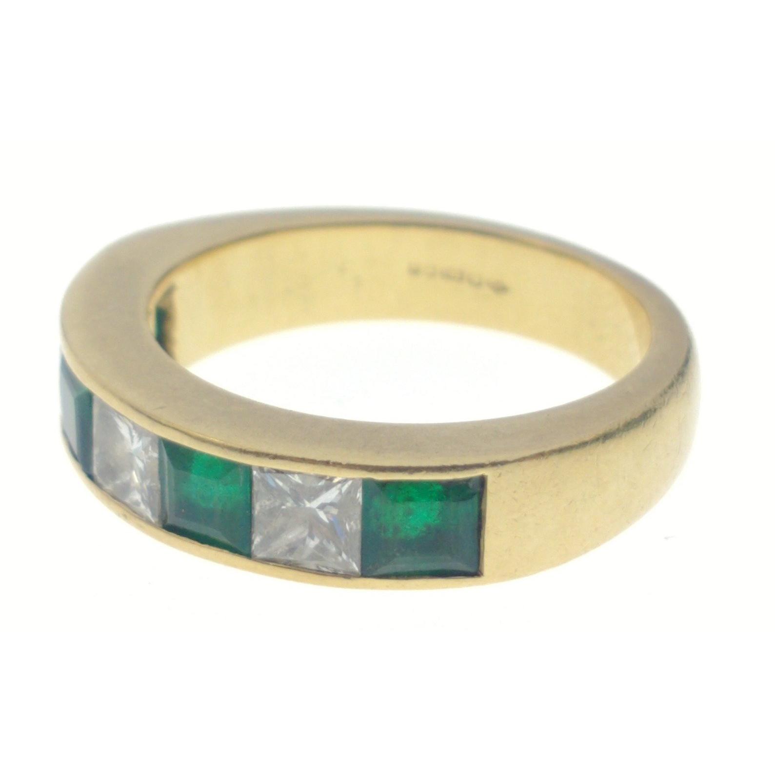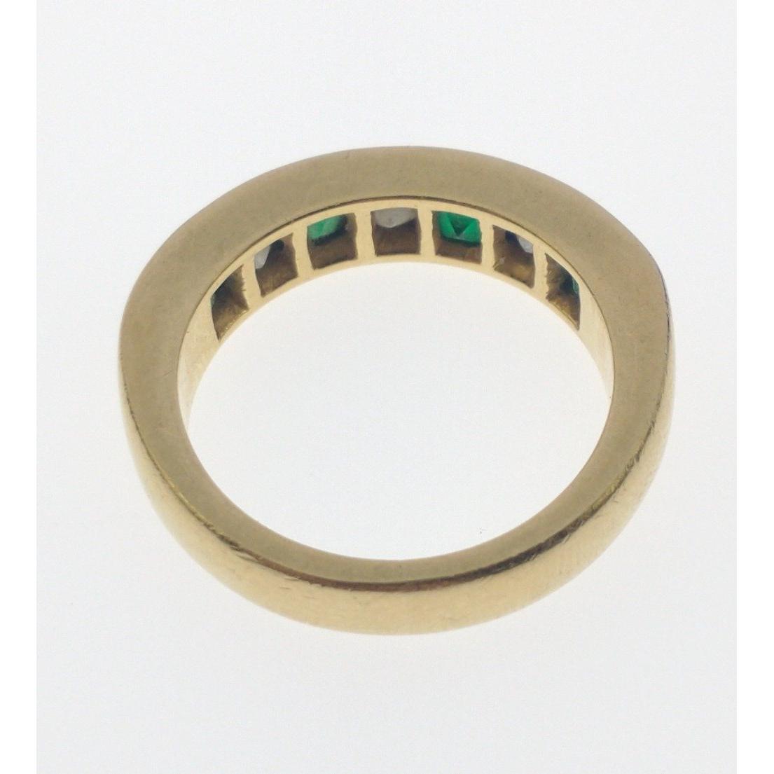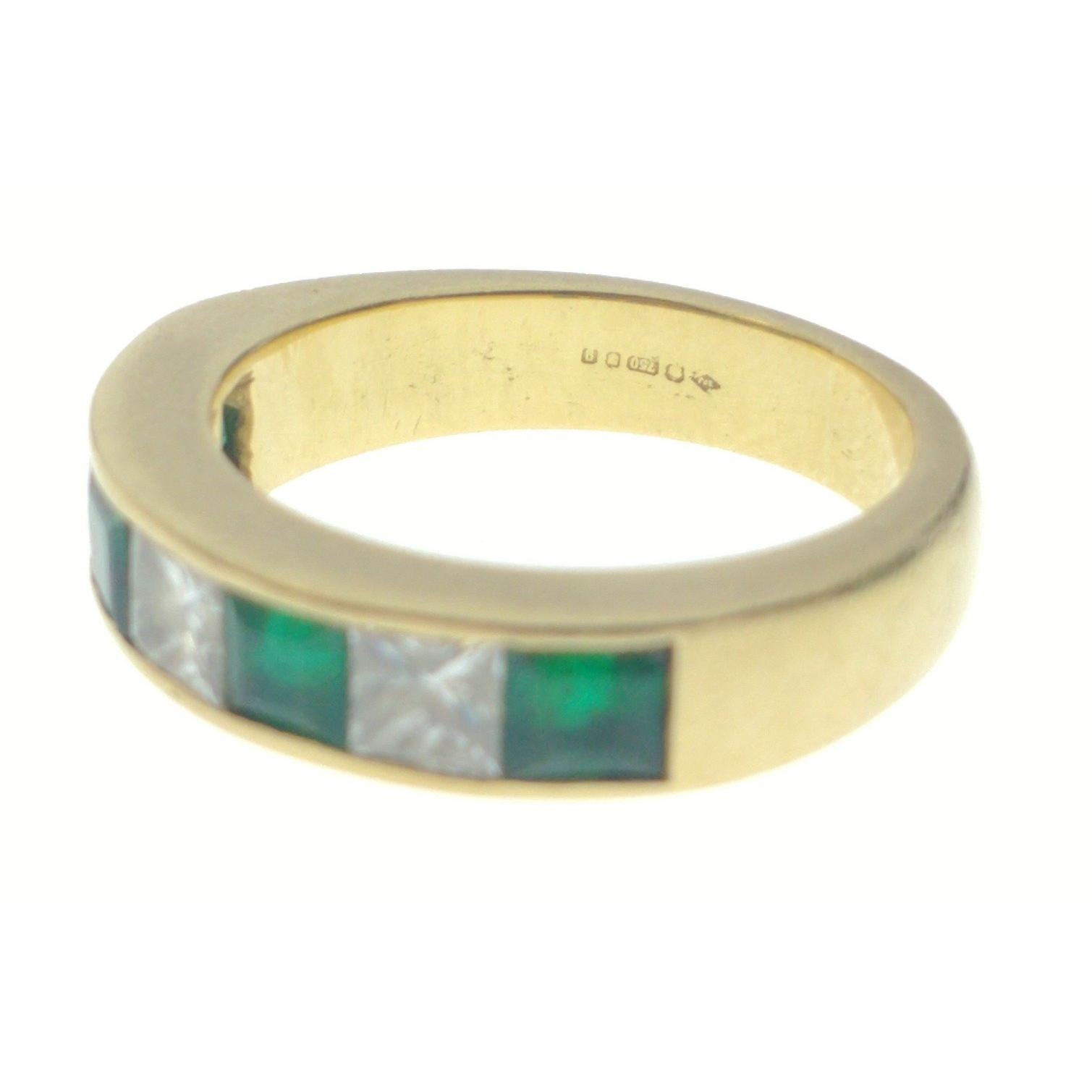 A SUBSTANTIAL 750 hallmarked yellow gold RING size O/P set with four large cut EMERALDS 4mm length approx and three large cut DIAMONDS 4mm length approx carat measurement is .33 approx -the colour appears white with no inclusions visible to the naked eye, and no noted inclusions by 10 magnification loop - gross weight 8.45g -