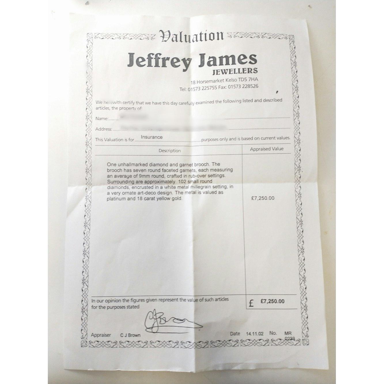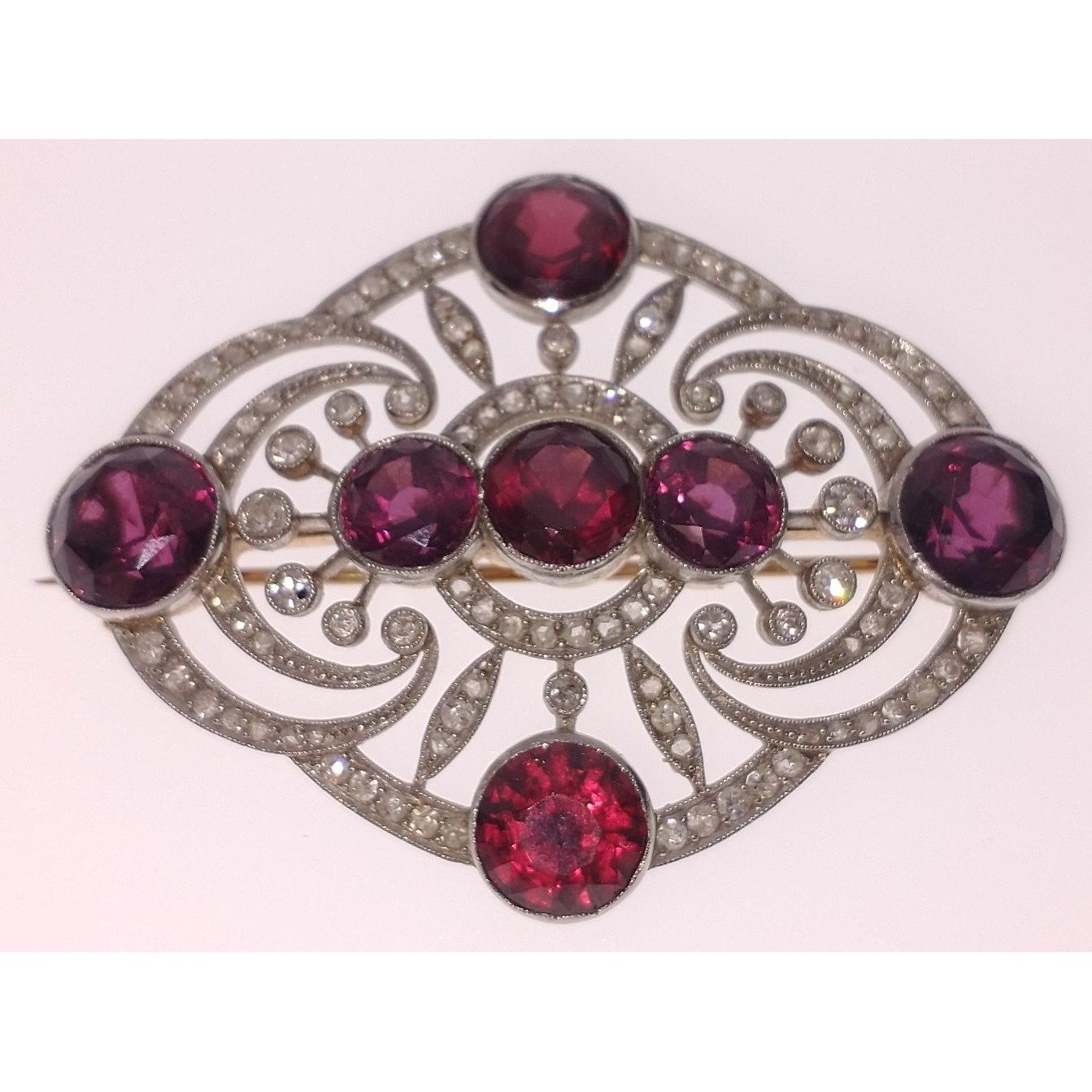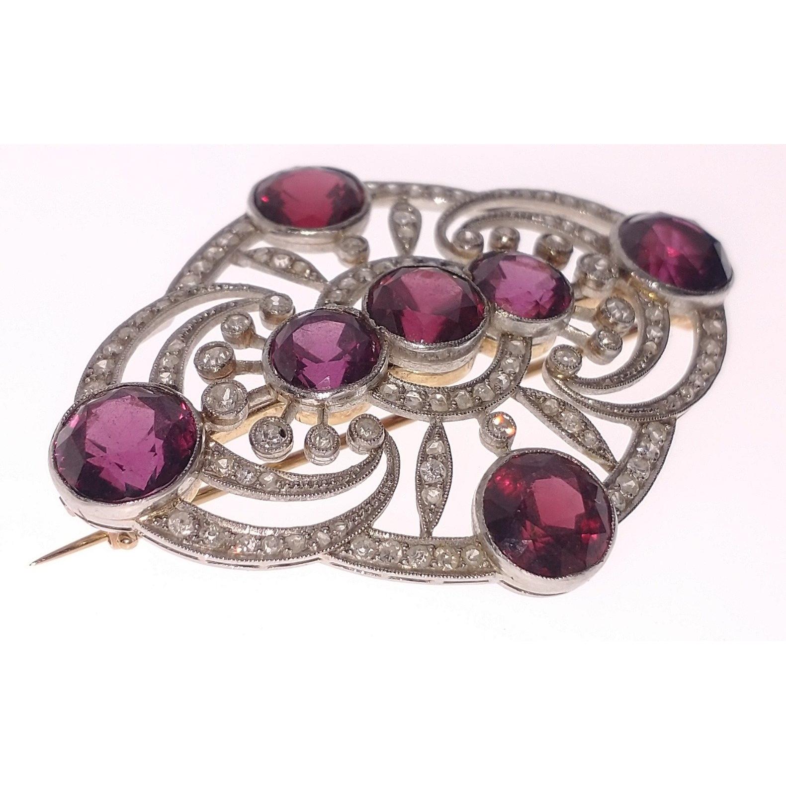 ORNATE STUNNING ART DECO DESIGN! An unmarked diamond and garnet set BROOCH, with 7 round faceted garnets, each measuring 9mm round approx, with 102 small round diamonds - the metal is valued as platinum and 18 carat yellow gold - gross weight 21g and dimensions 5cm x 4cm approx -