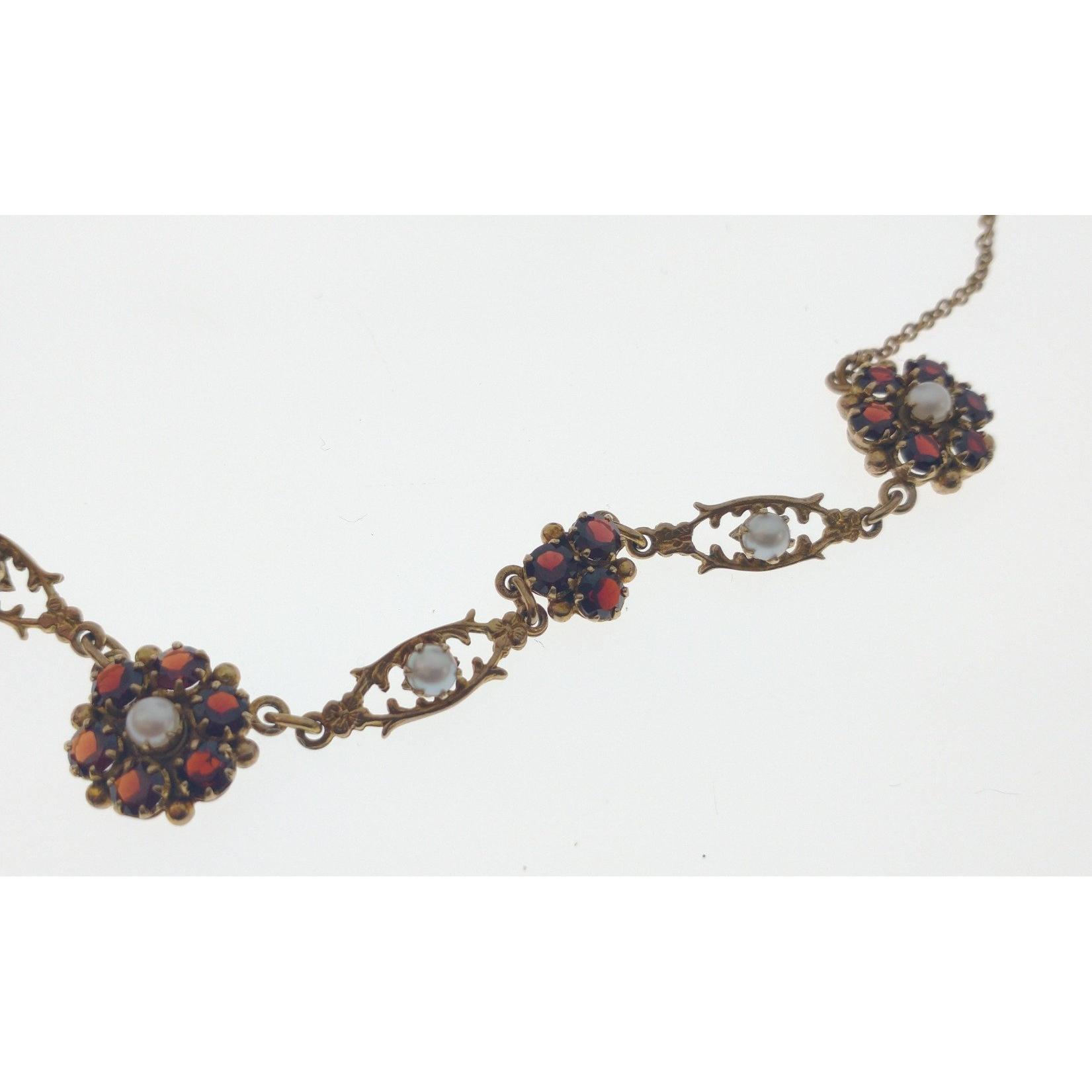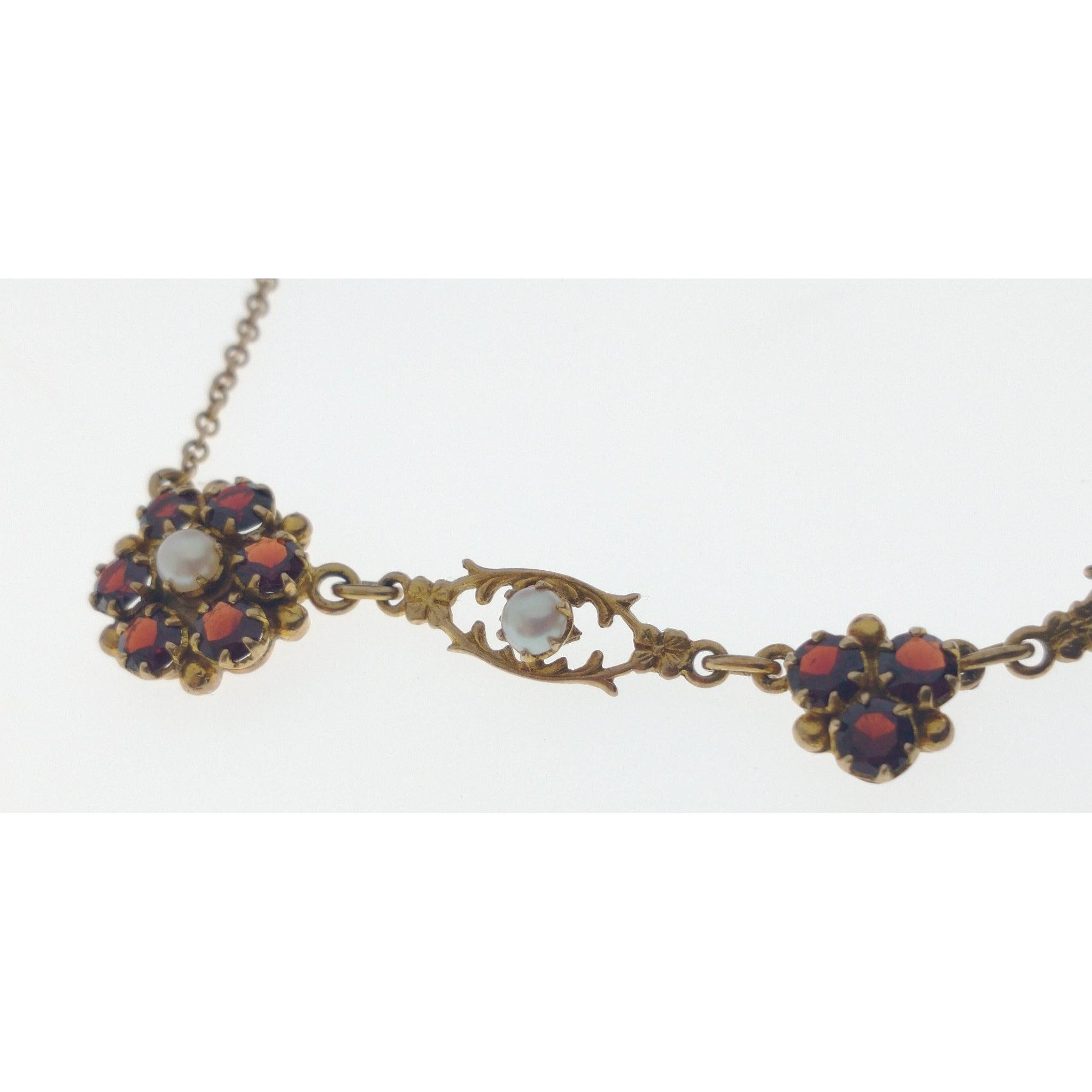 a matching stamped 9ct yellow gold NECKLACE studded with garnets and pearls in flower form gross weight 11.58g