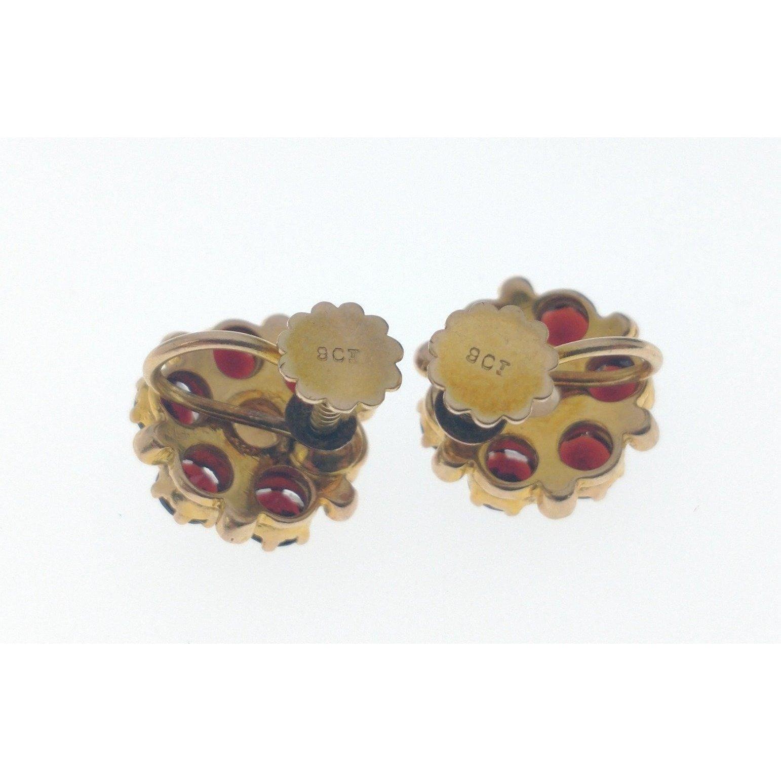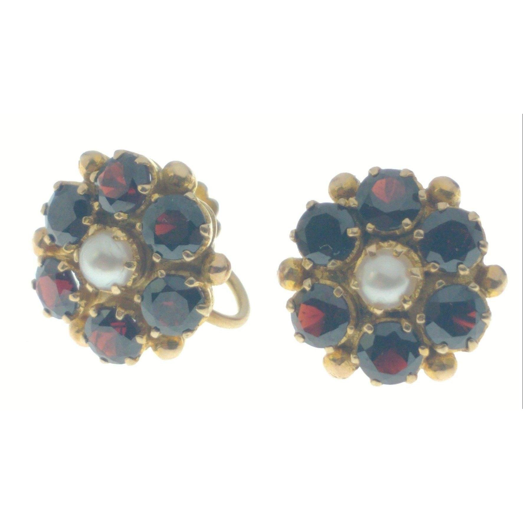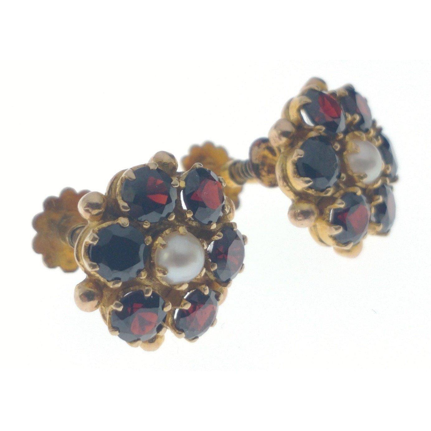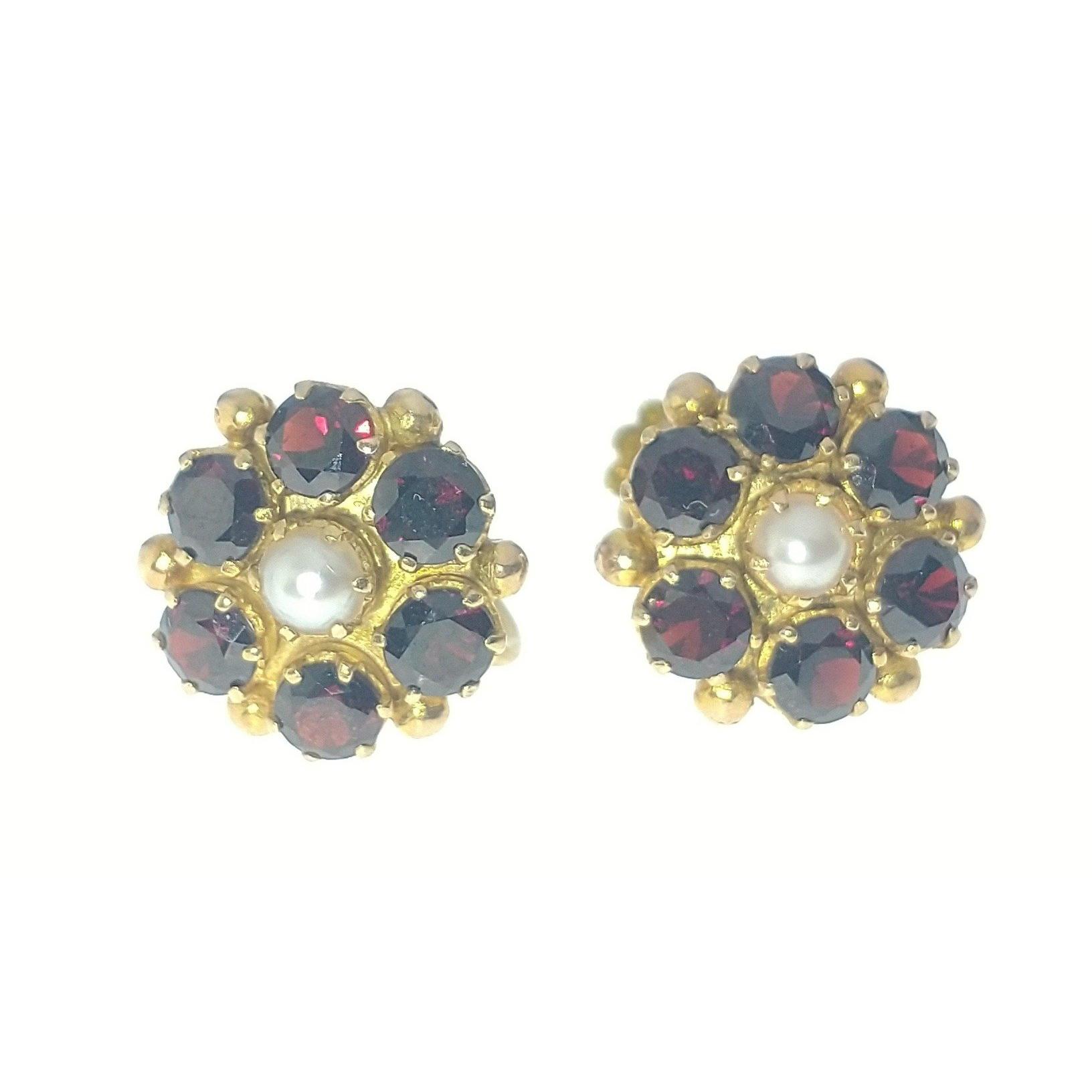VINTAGE A 9ct stamped pair of yellow gold EARRINGS with 6 garnets and one central pearl set in each earring gross weight 4.30g approx