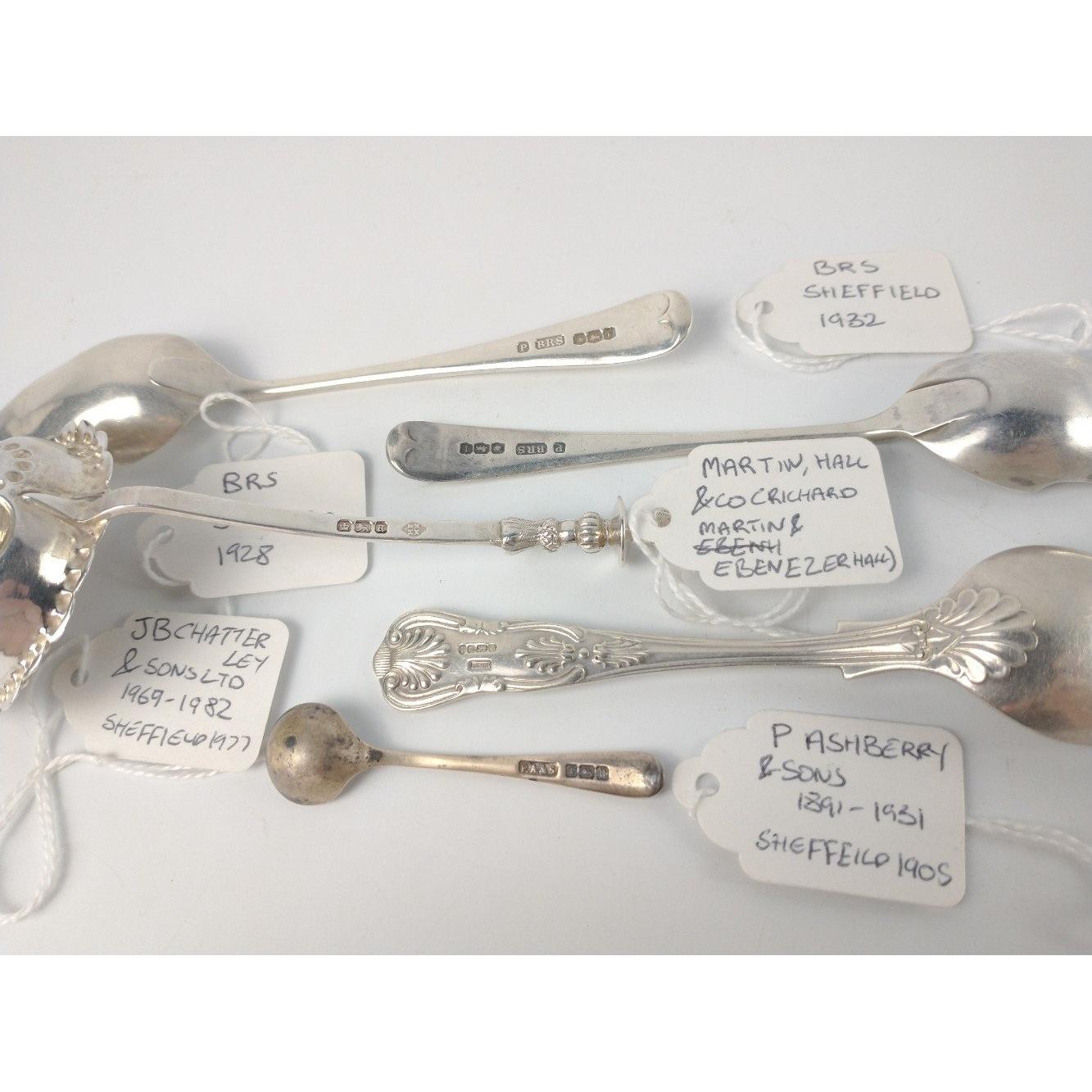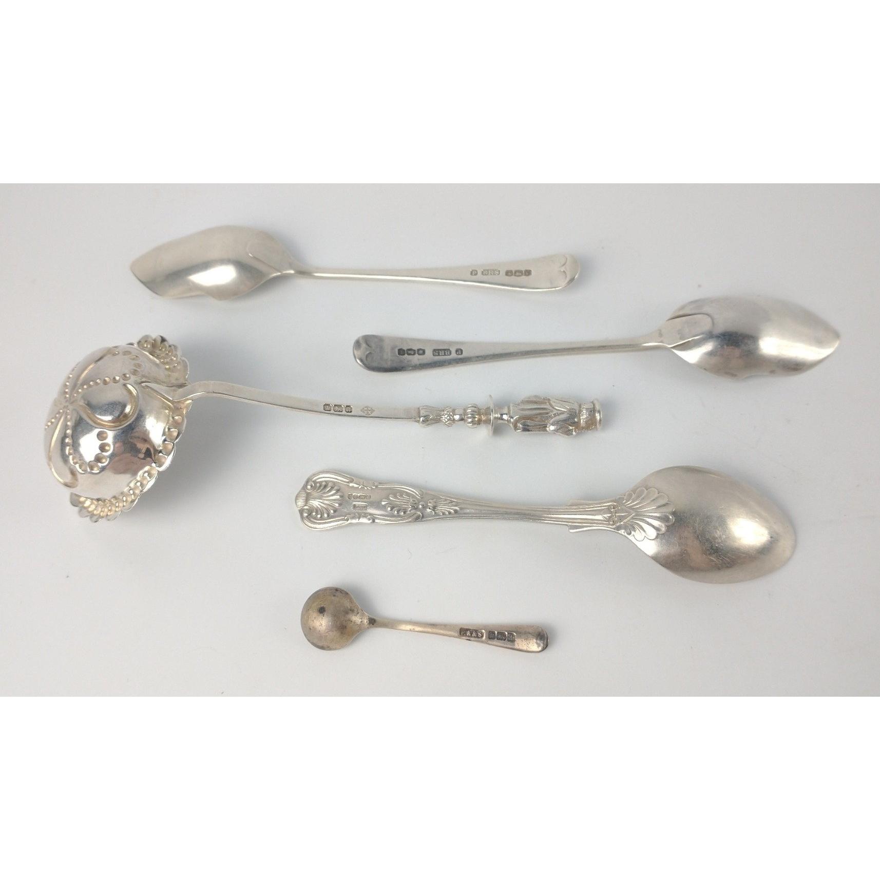 Five pieces of Sheffield hallmarked silver to include a small decorated LADLE ,1893 by silversmith MARTIN/HALL & CO, a pair of scoop style spoons, a teaspoon and a small cruet spoon, gross weight 90g.