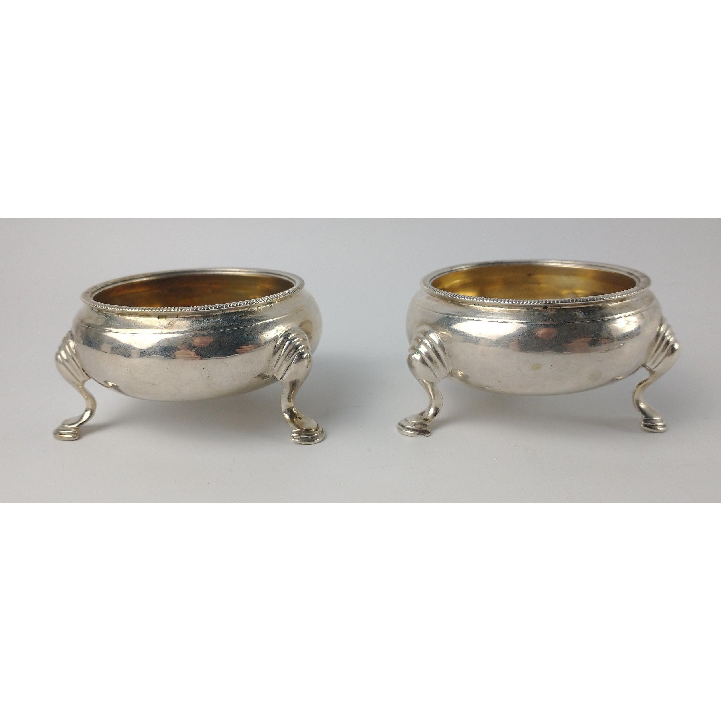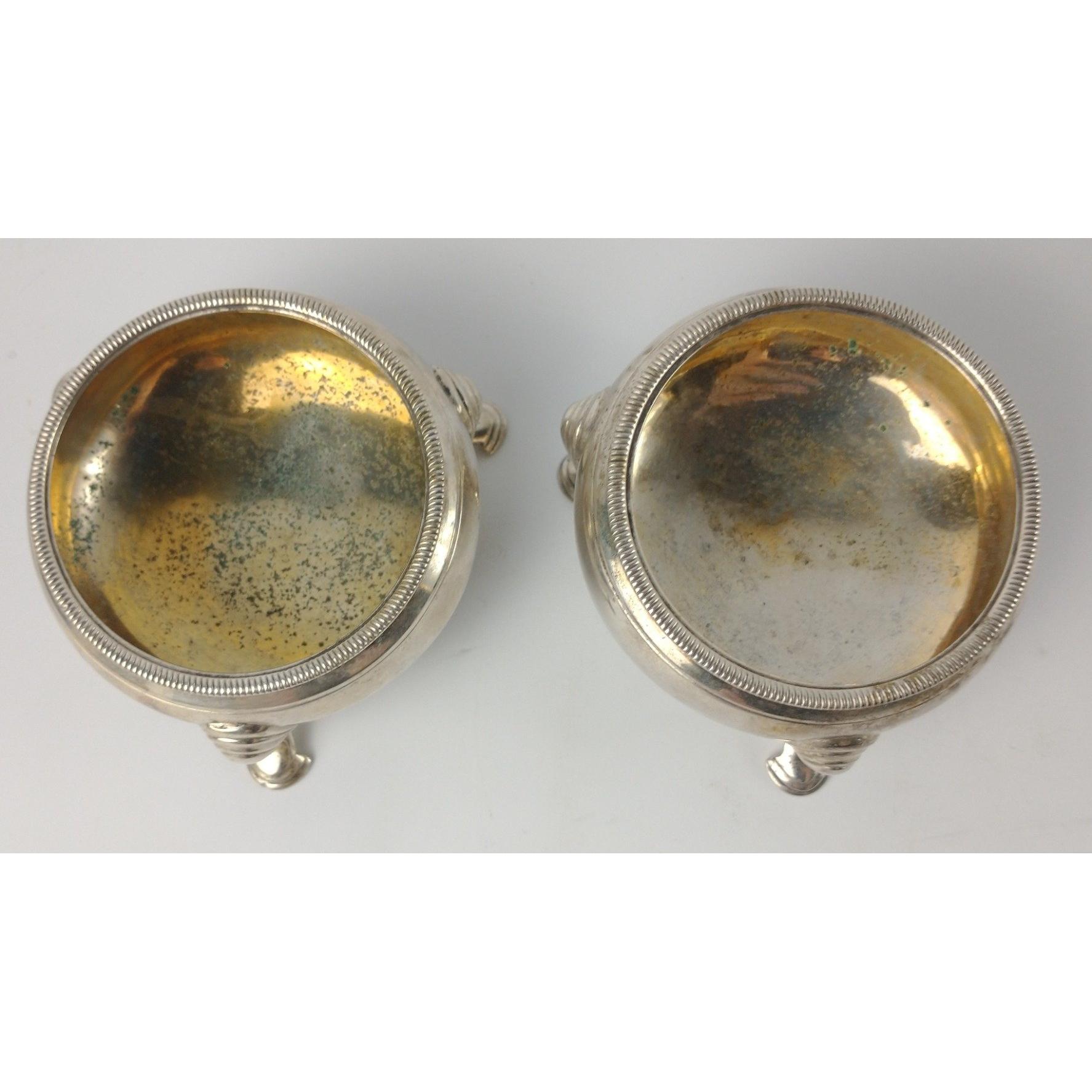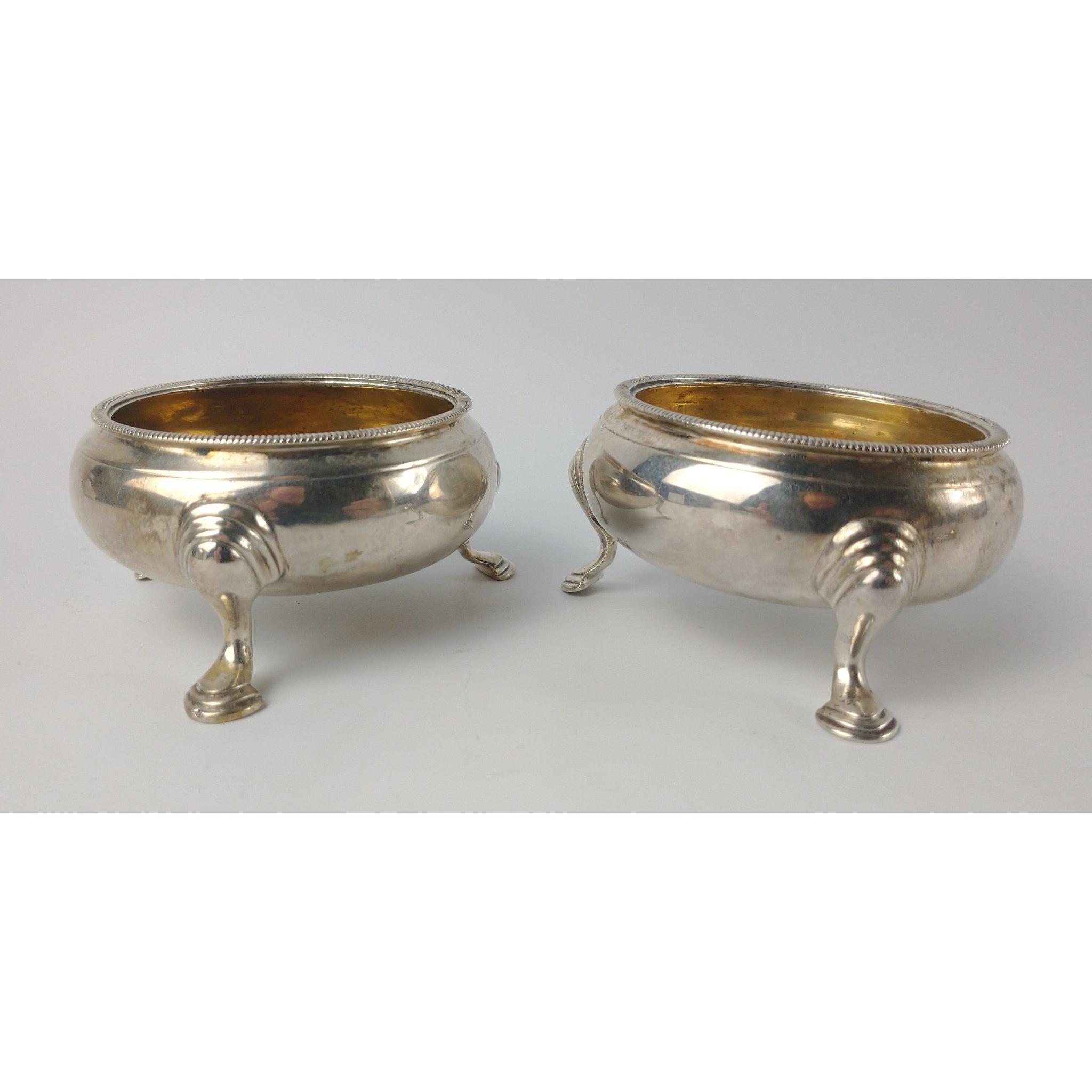 A pair of London hallmarked silver SALTS, hallmark indistinct, marked to base of feet initials A,C and 1751 diameter 7cm, height 4cm, and a pair of SALT SPOONS hallmarked London 1819, length 9cm, gross weight 140g.