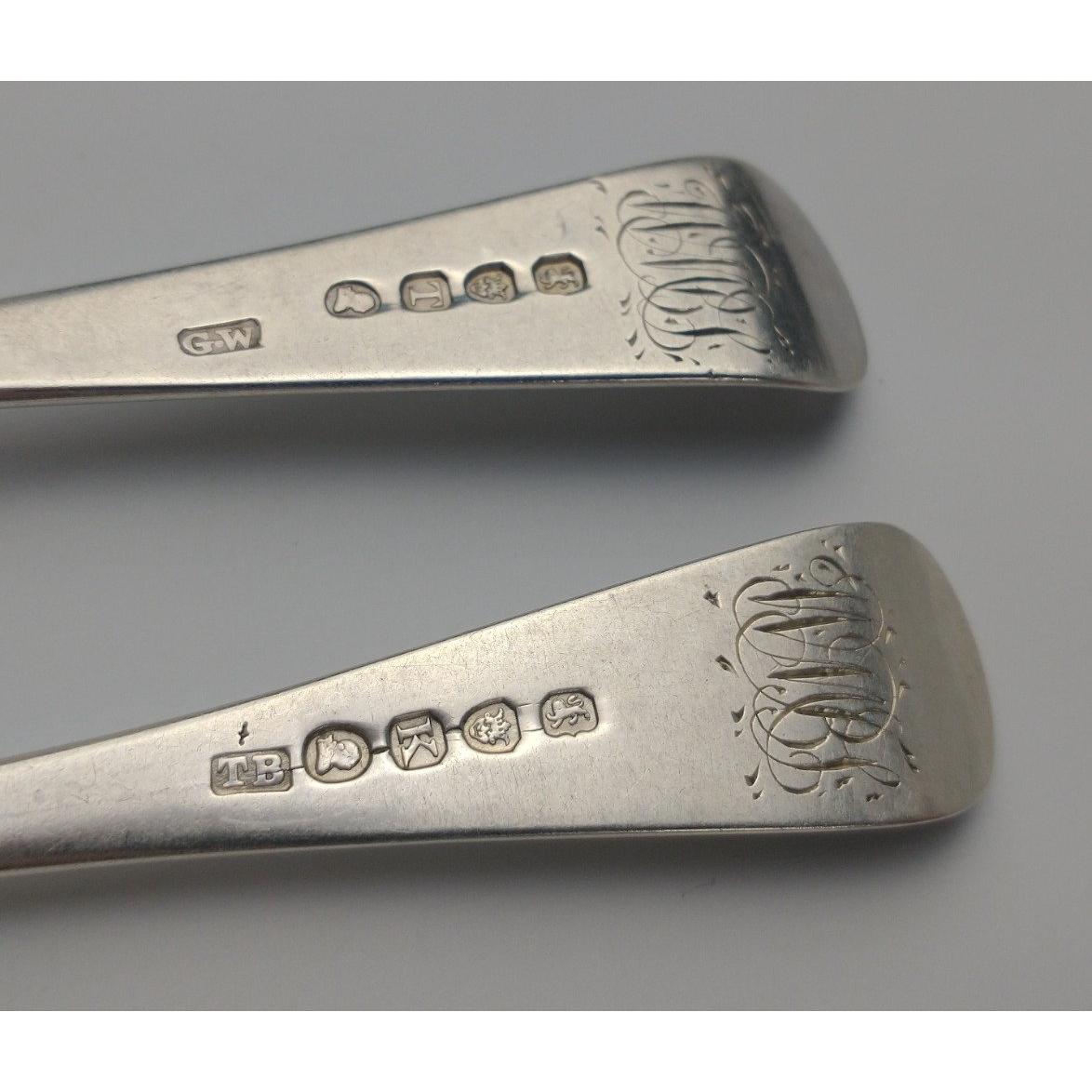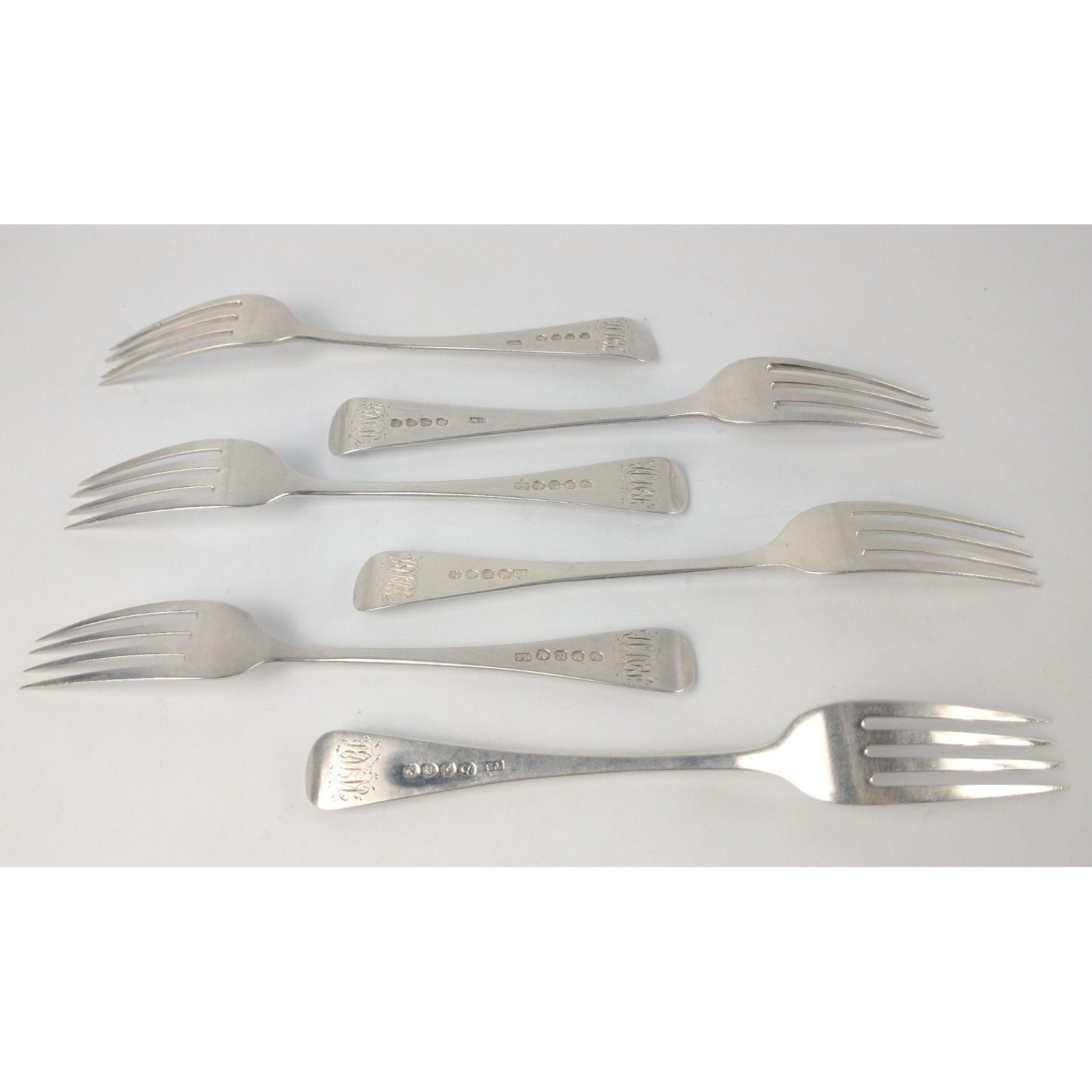 Four London silver hallmarked 1805 FORKS by silversmith THOMAS WILKES-BARKER, length 16.5cm, gross weight 106g, plus two London silver hallmarked 1814 FORKS by silversmith G. W., length 16.5cm, gross weight 67g.