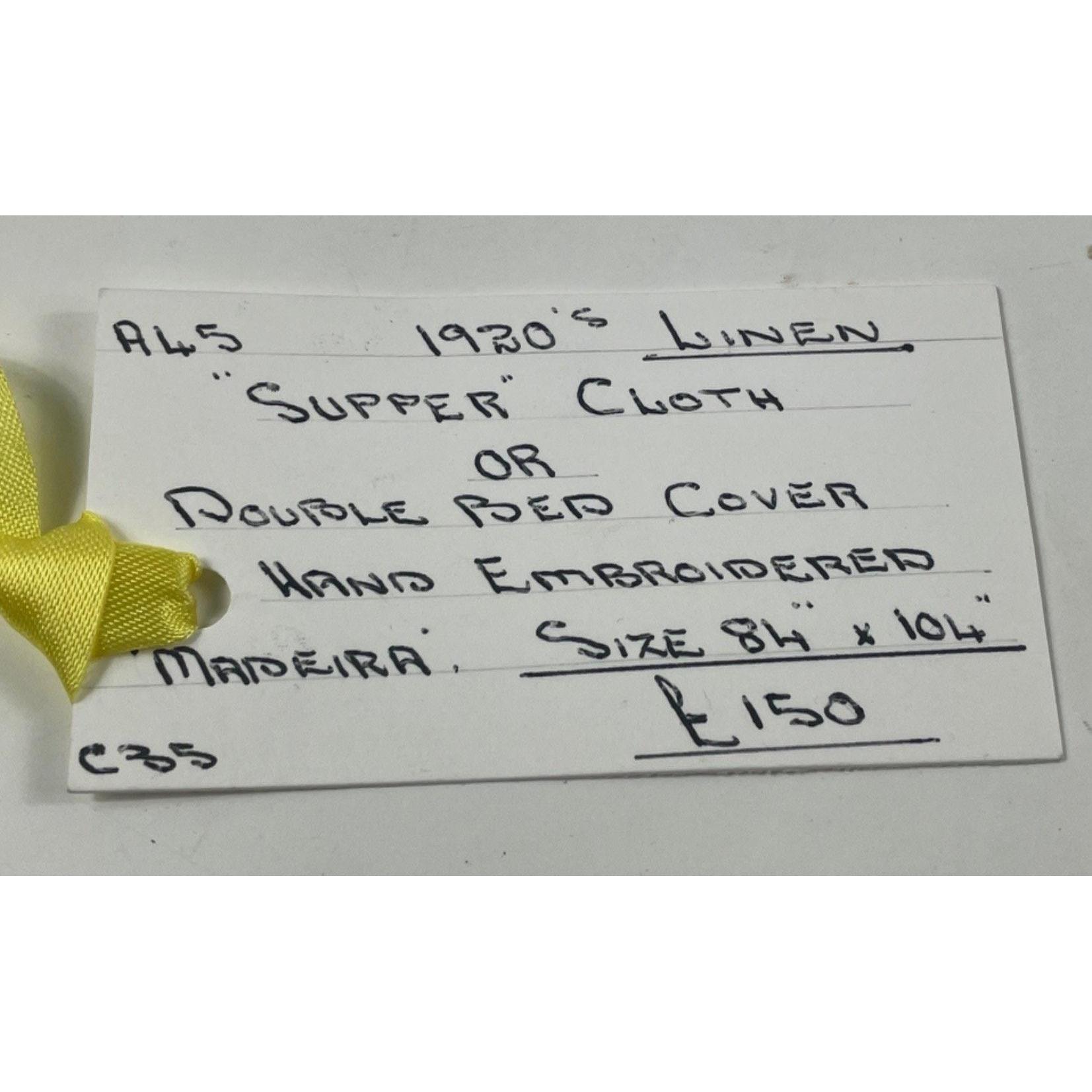 1920's linen SUPPER CLOTH or double bed cover hand embroidered from MADEIRA DIMENSIONS 84” x 104”