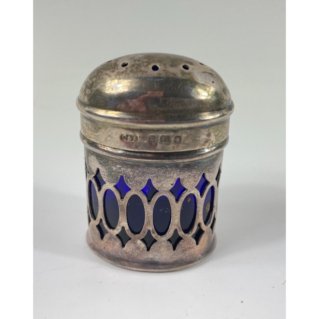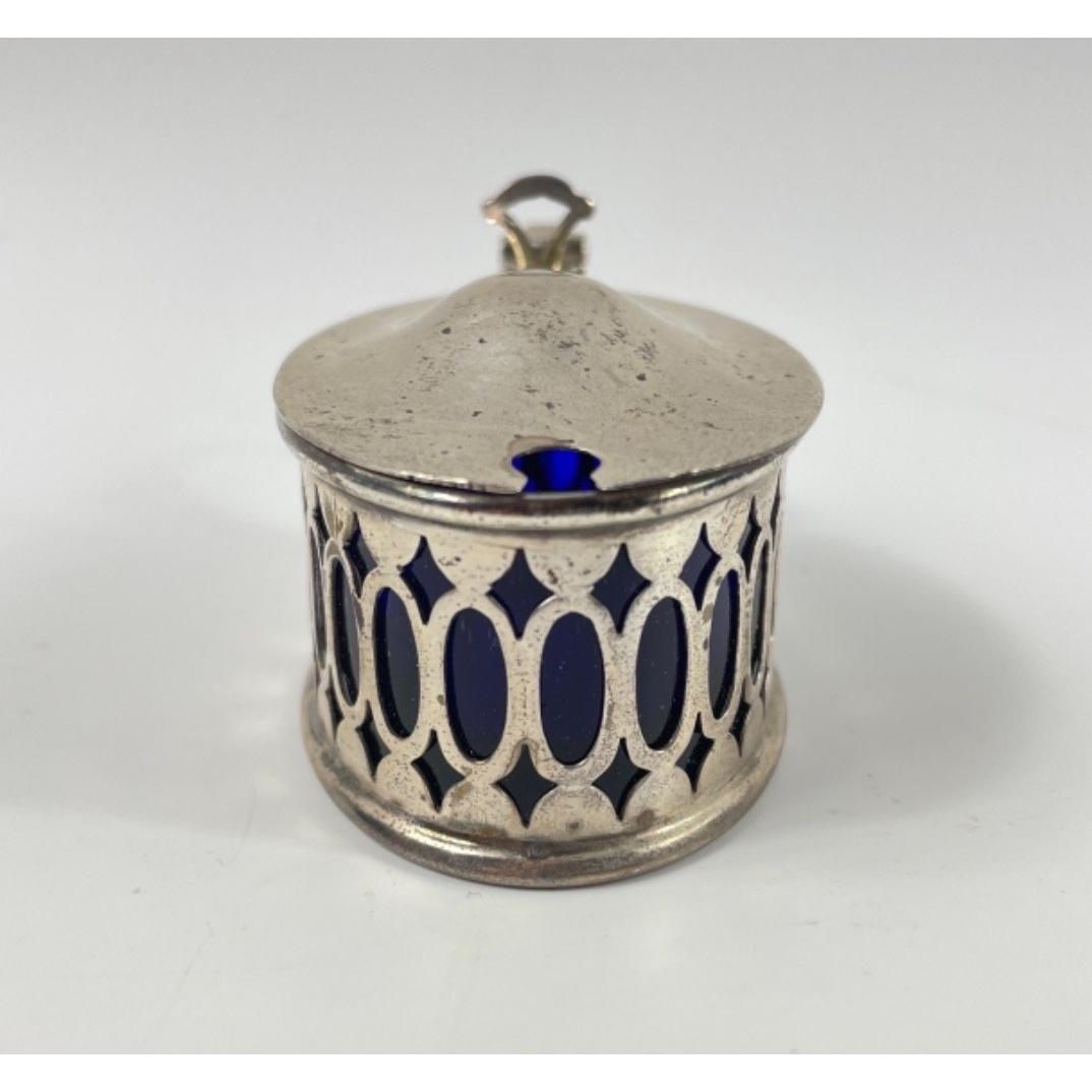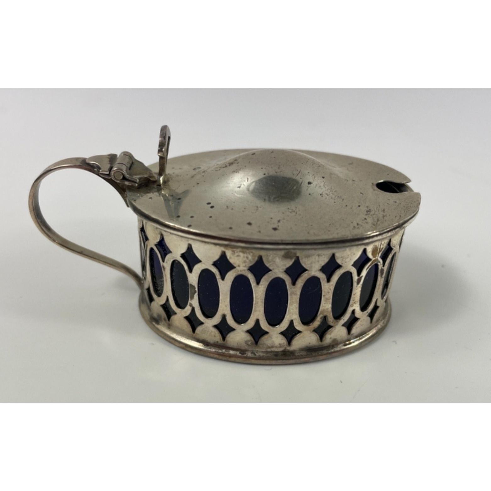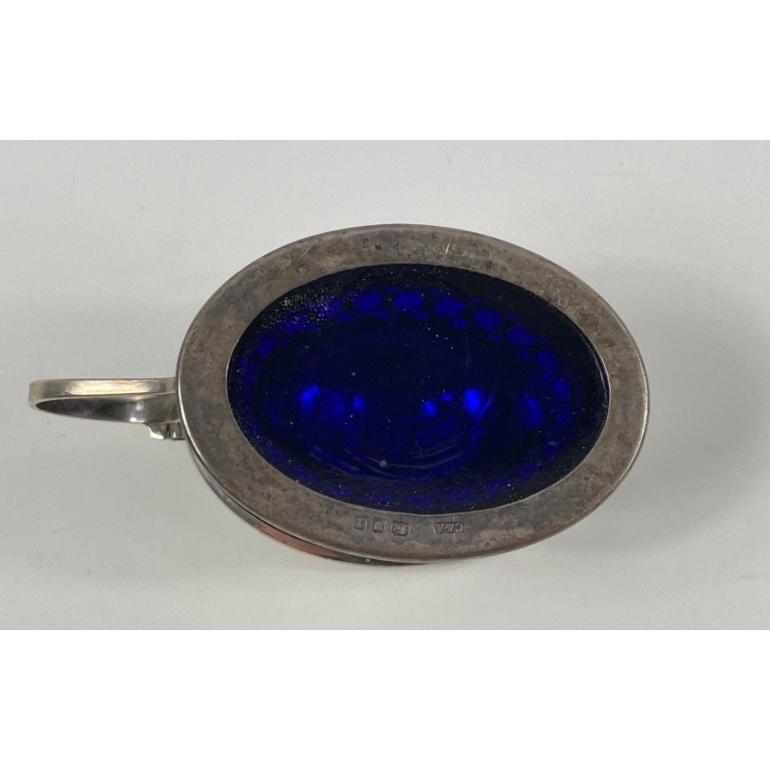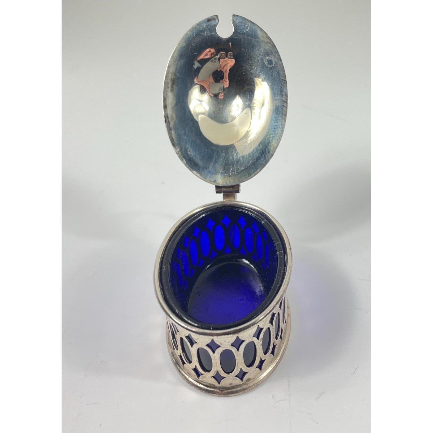 Three items of hallmarked silver CRUETS, the first two being a London 1932 mustard pot (7 x 3 x 4cm) with blue glass liner also salt pot (5 x 3.25cm), also with blue glass liner by silversmith COLLETT & ANDERSON and a MUSTARD SPOON Sheffield 1912, gross weight of silver only 40g