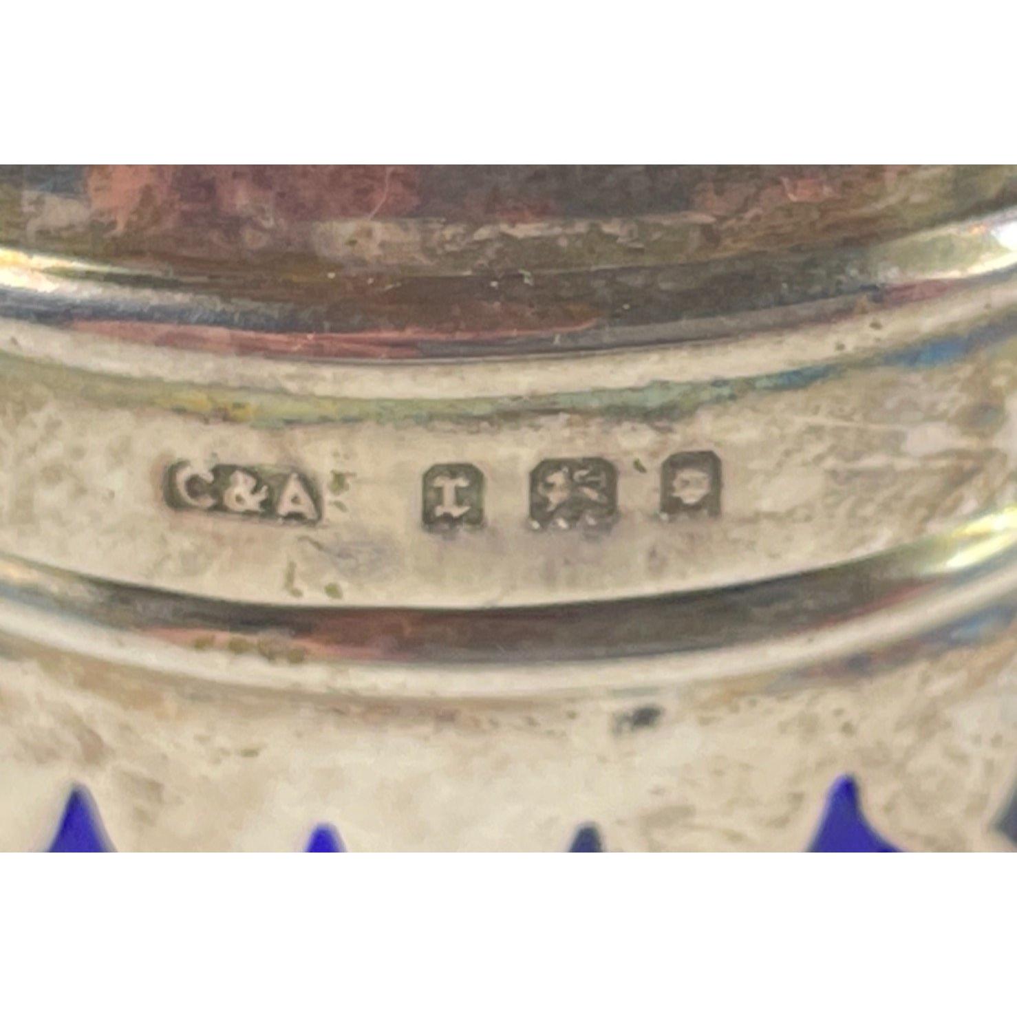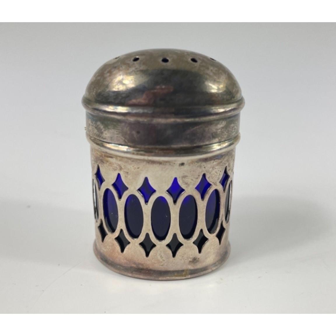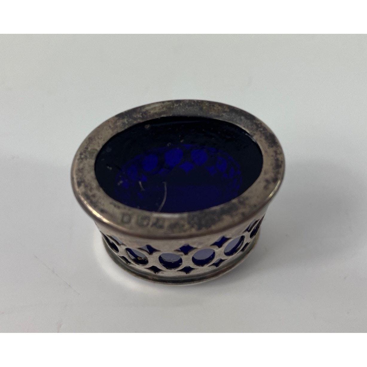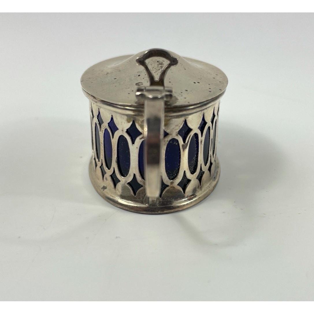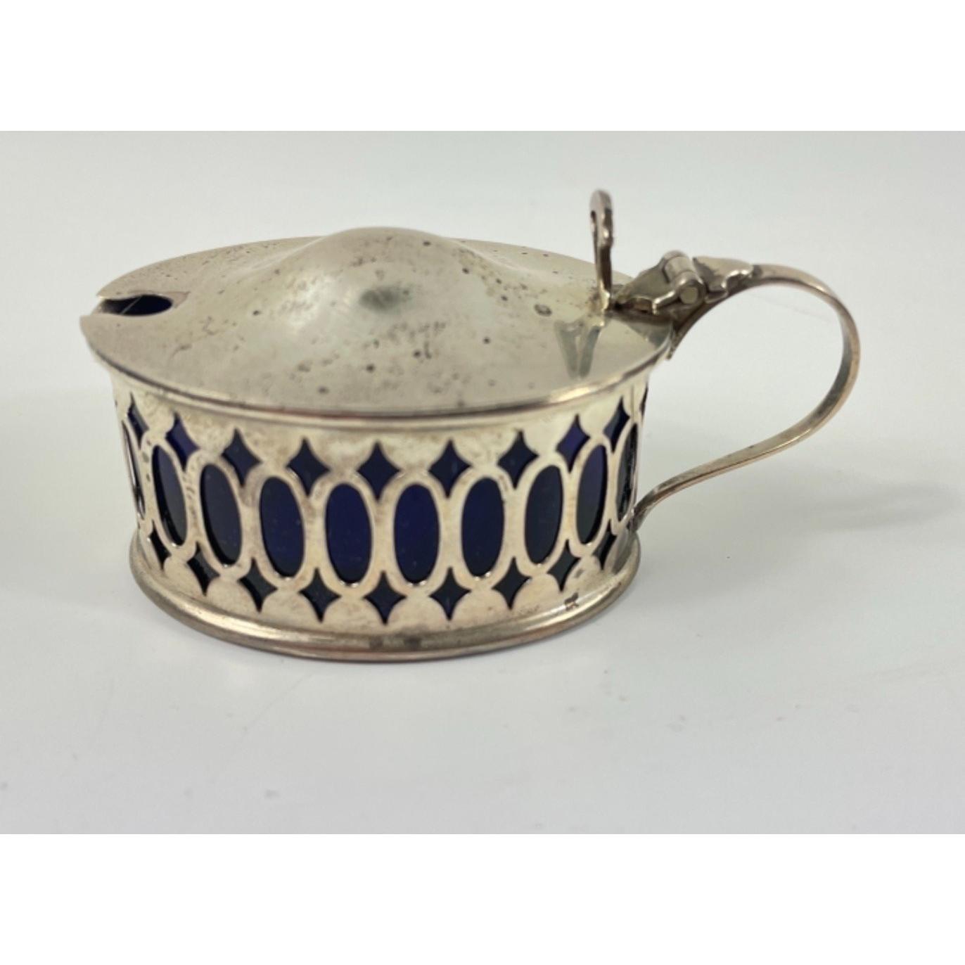 Three items of hallmarked silver CRUETS, the first two being a London 1932 mustard pot (7 x 3 x 4cm) with blue glass liner also salt pot (5 x 3.25cm), also with blue glass liner by silversmith COLLETT & ANDERSON and a MUSTARD SPOON Sheffield 1912, gross weight of silver only 40g