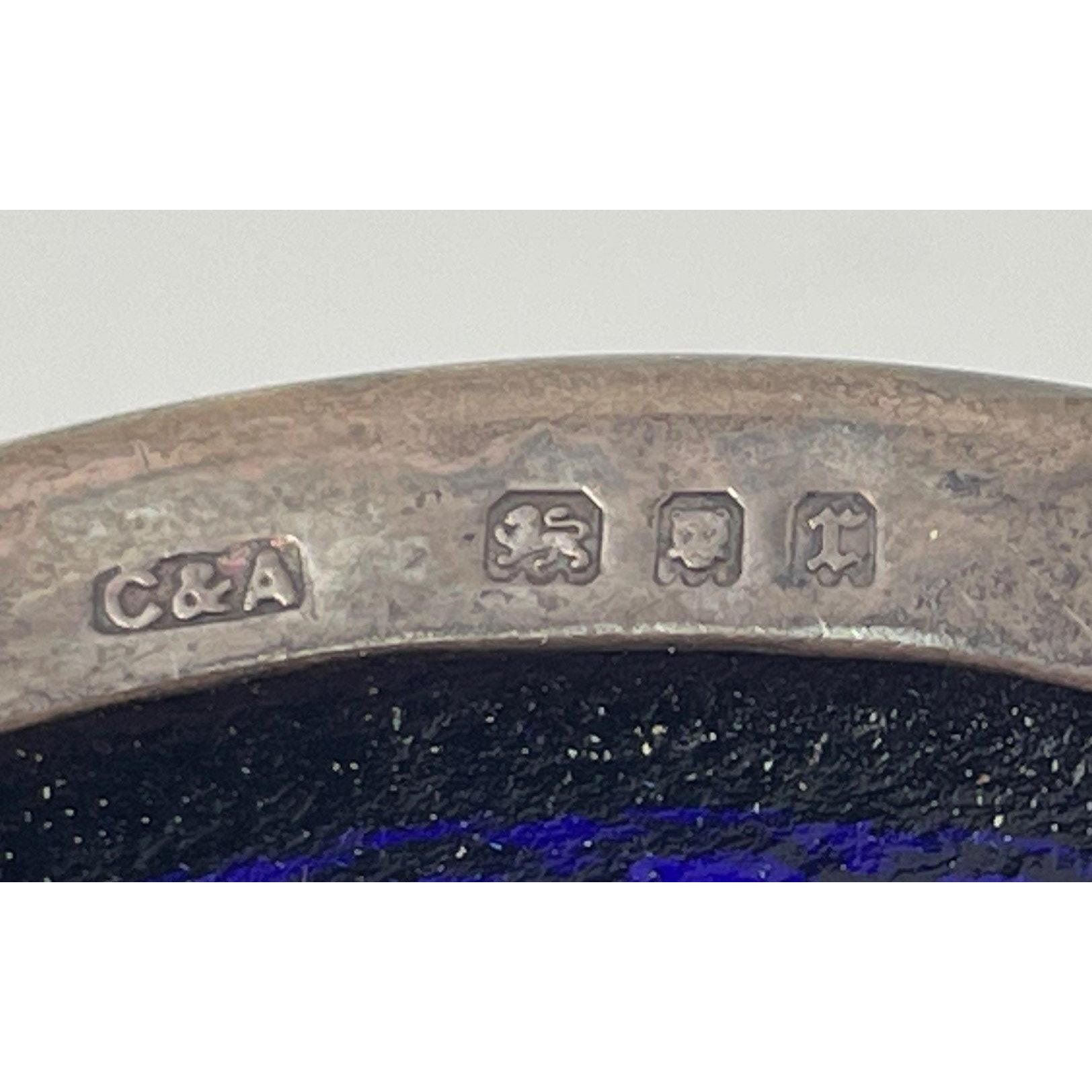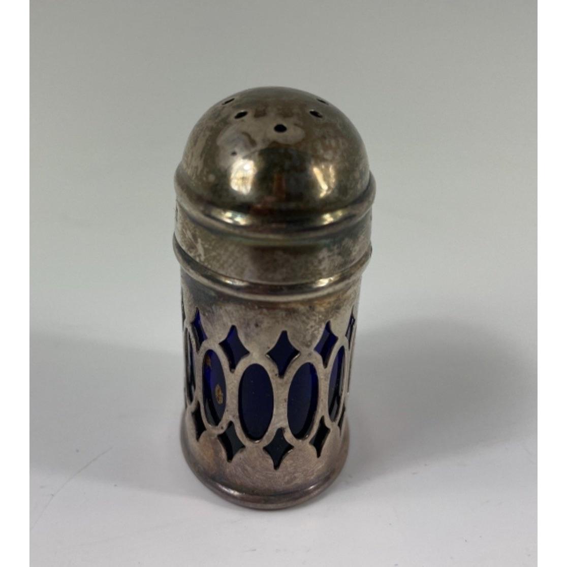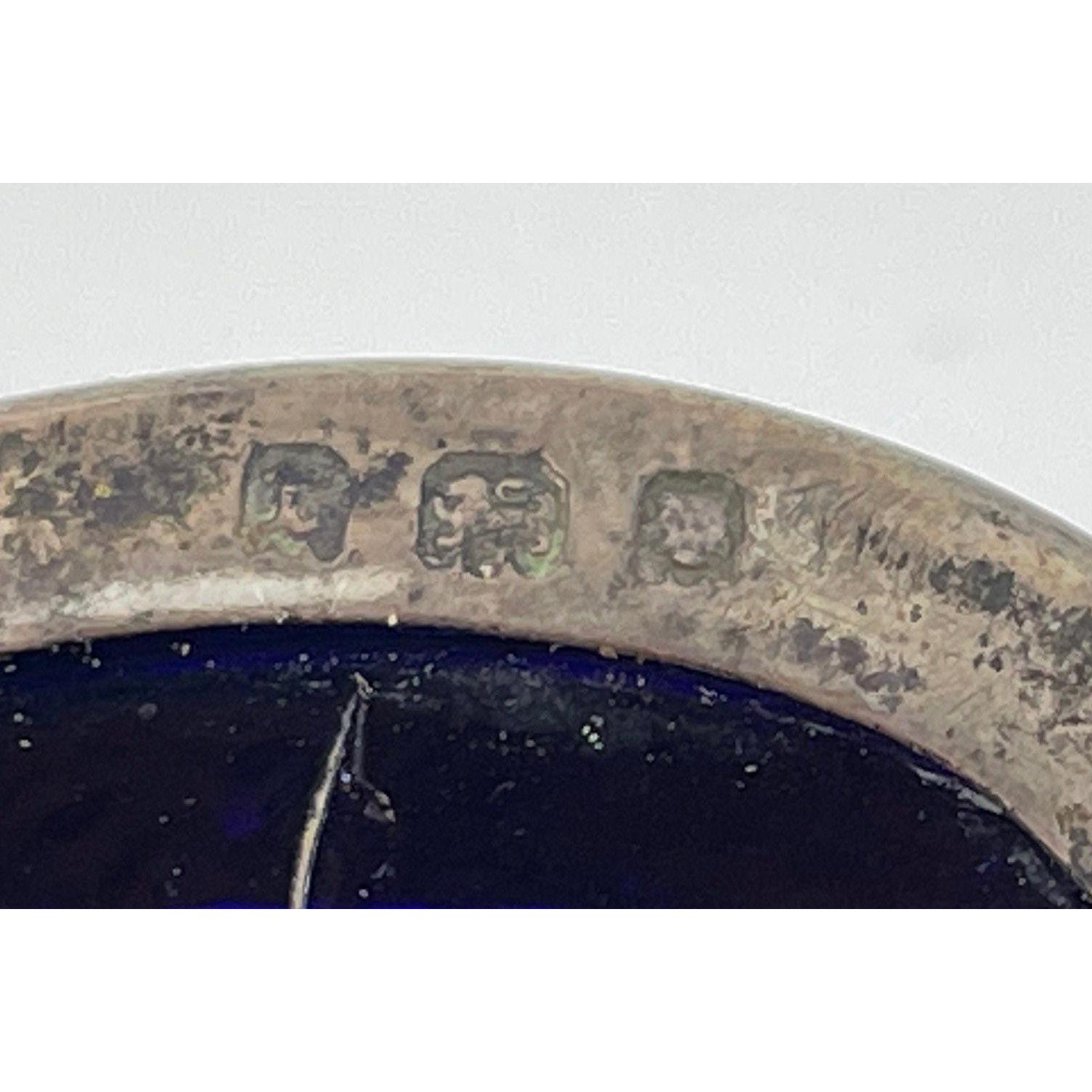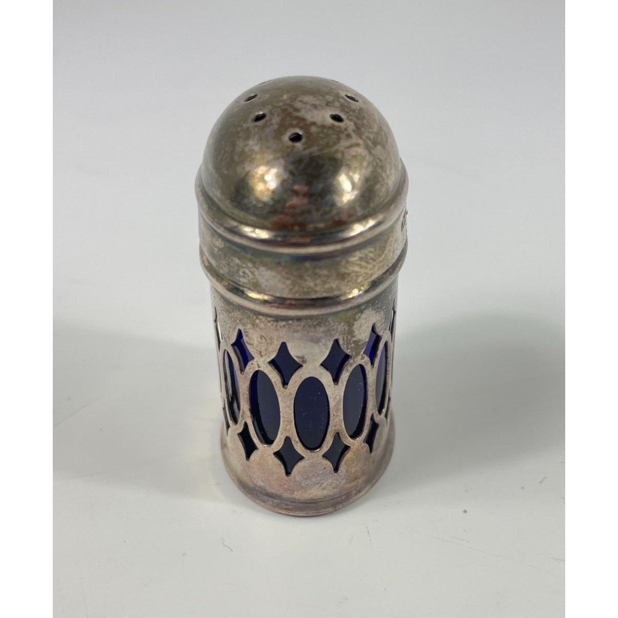 Three items of hallmarked silver CRUETS, the first two being a London 1932 mustard pot (7 x 3 x 4cm) with blue glass liner also salt pot (5 x 3.25cm), also with blue glass liner by silversmith COLLETT & ANDERSON and a MUSTARD SPOON Sheffield 1912, gross weight of silver only 40g