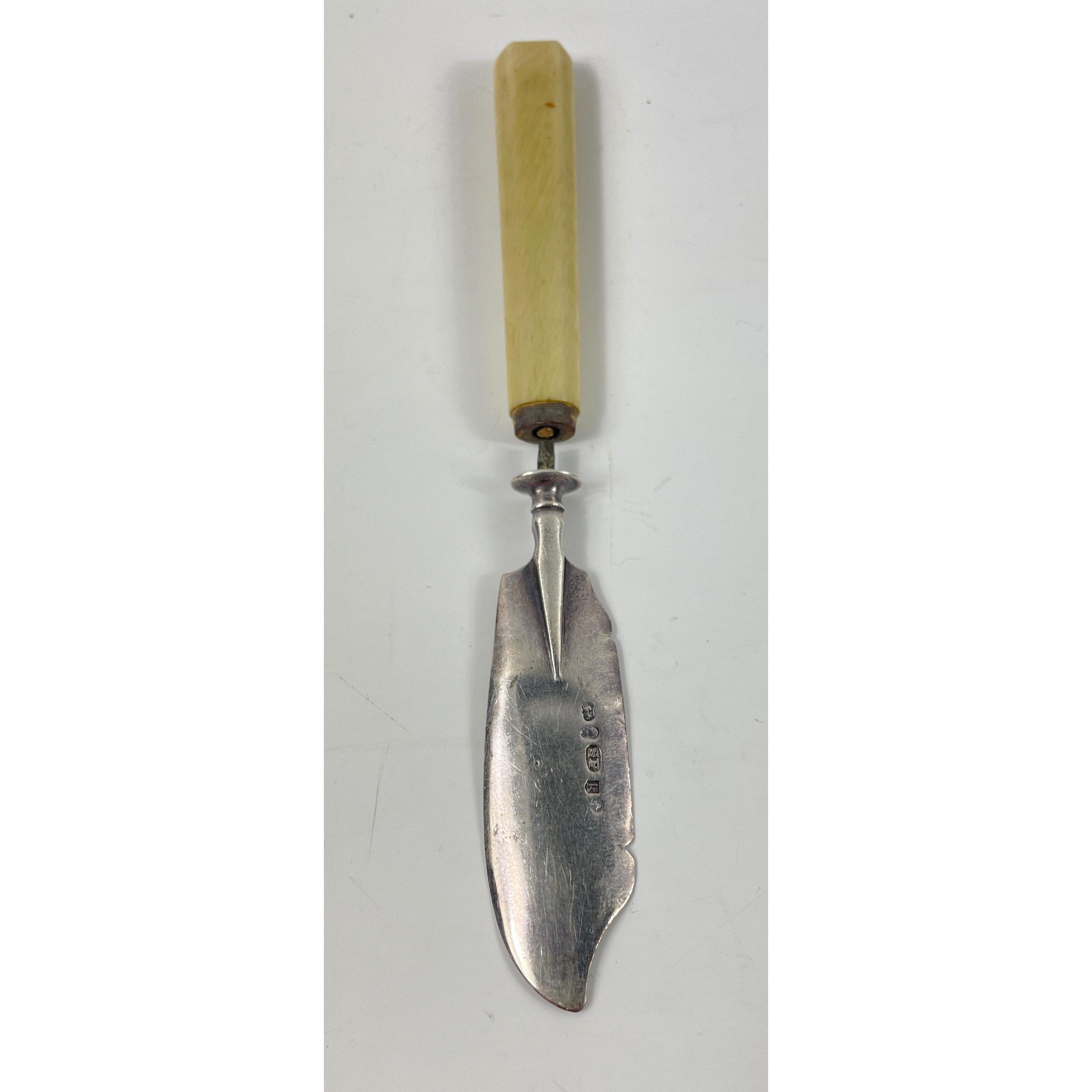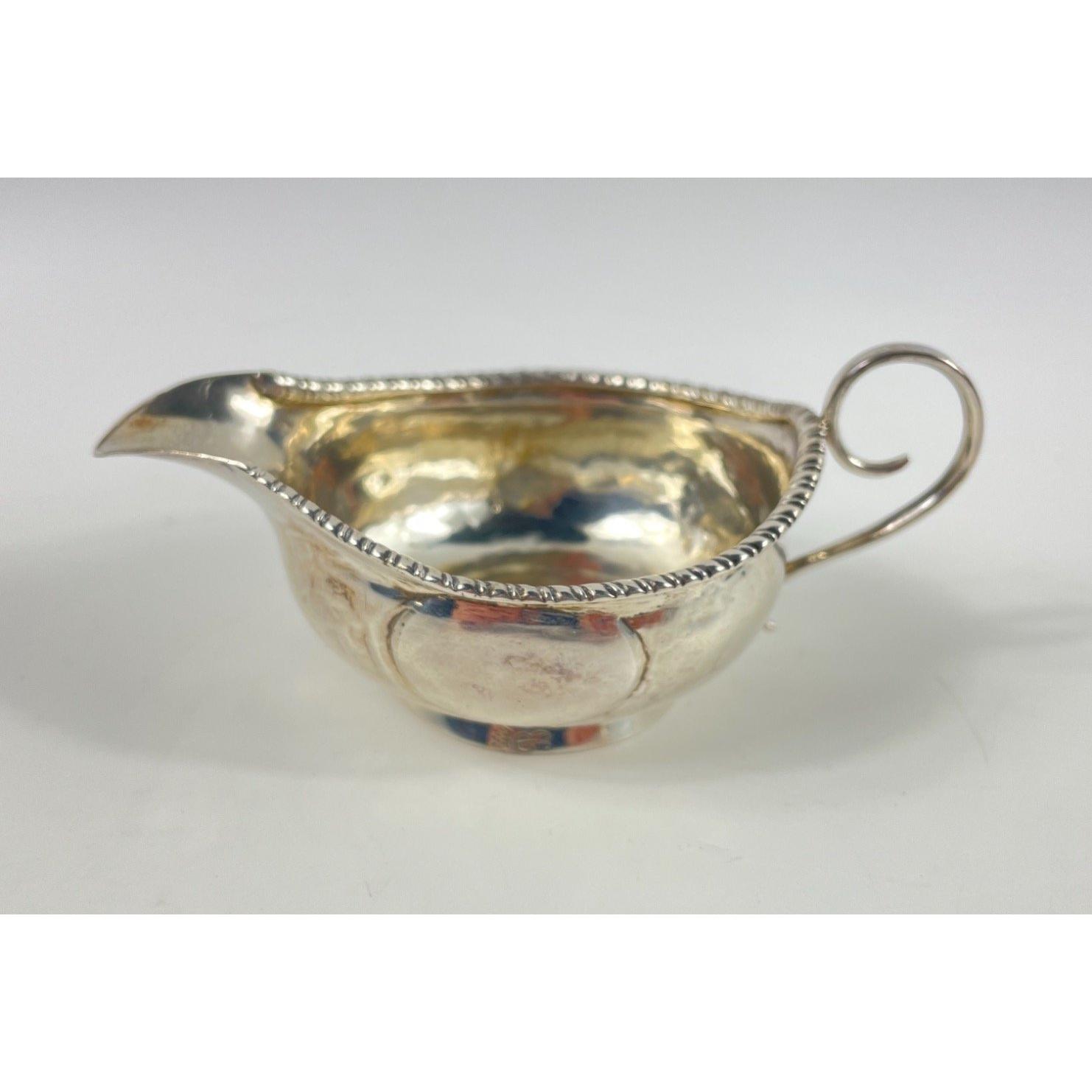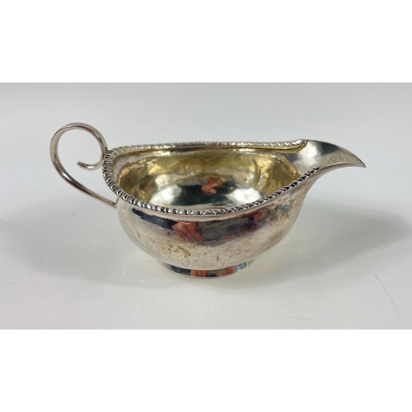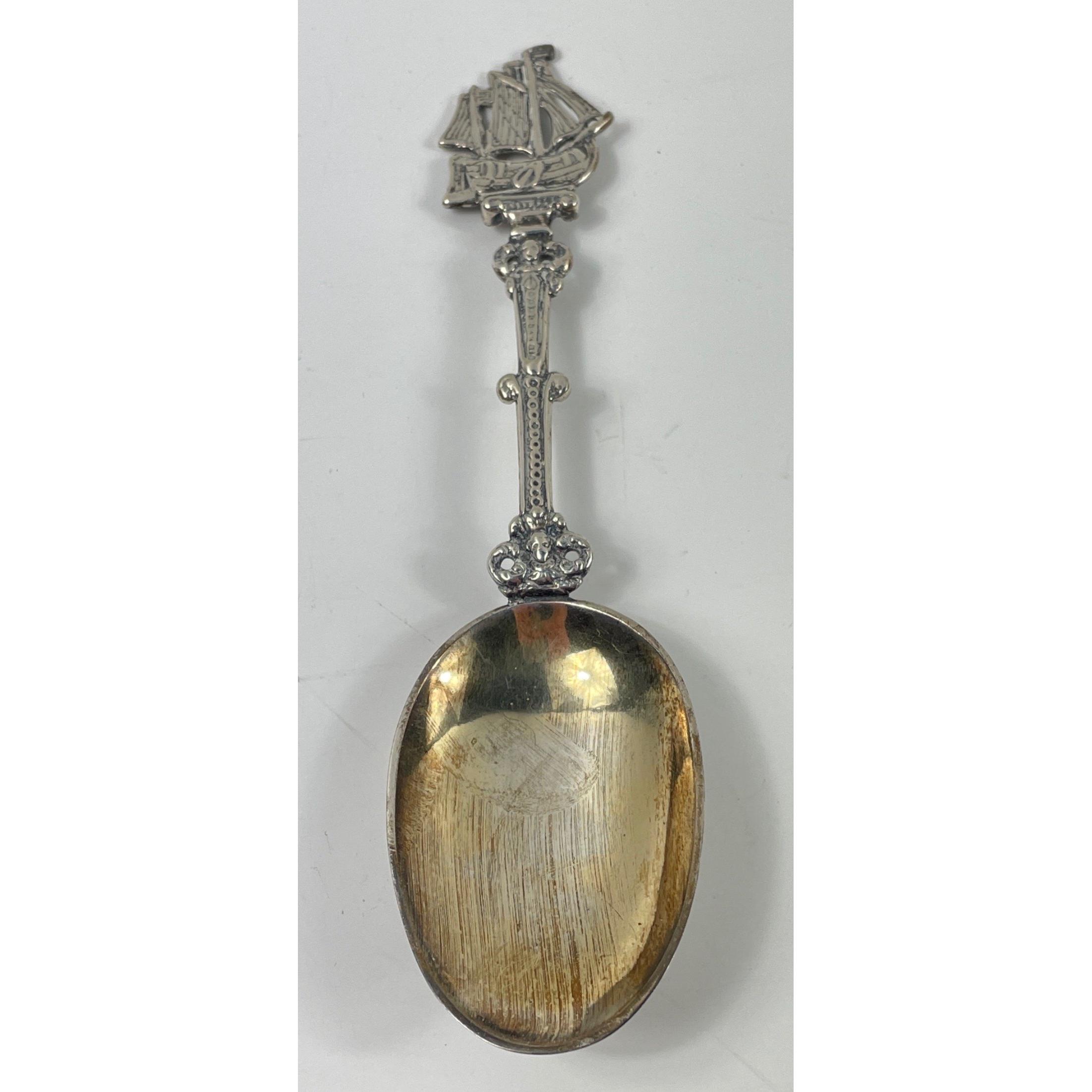 Three pieces of hallmarked silver to include a FISH KNIFE with a broken bone handle, a small condiment LADLE, a BUTTER KNIFE, and a white metal spoon with a highly decorative sailing ship handle and a very small white metal SAUCEBOAT gross weight of silver 140g.