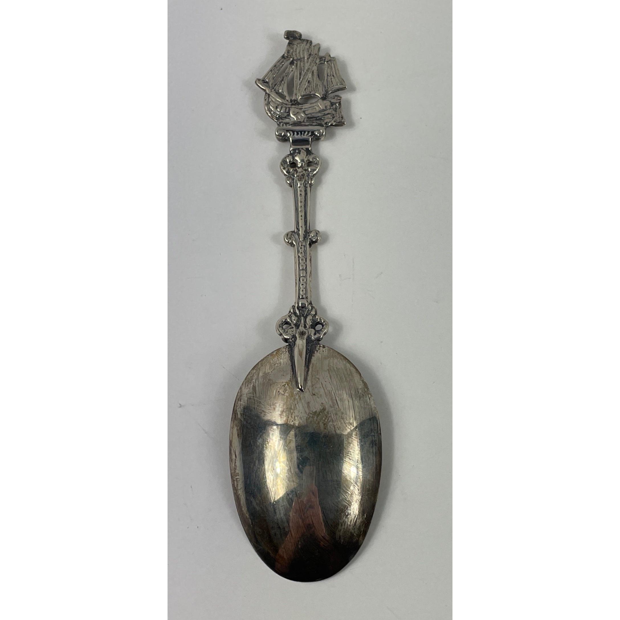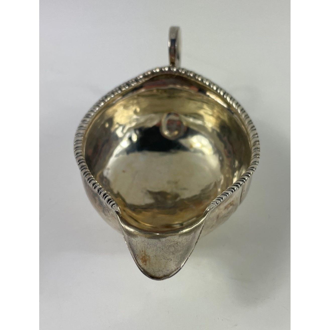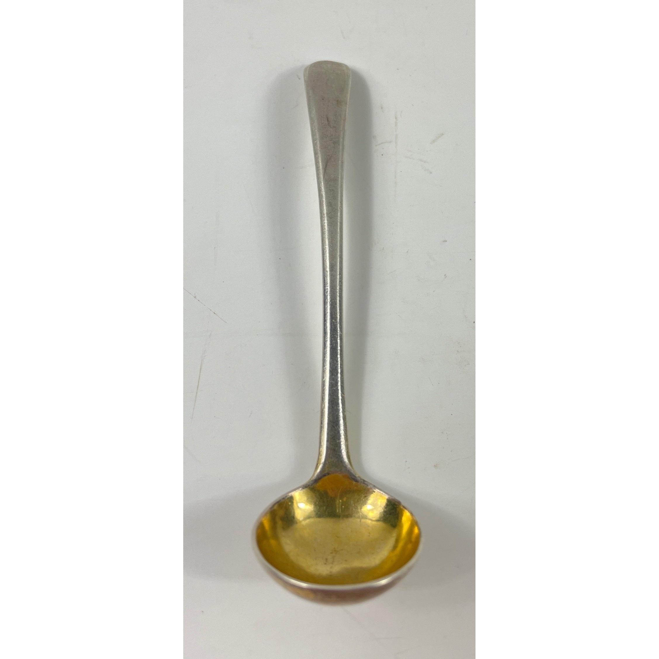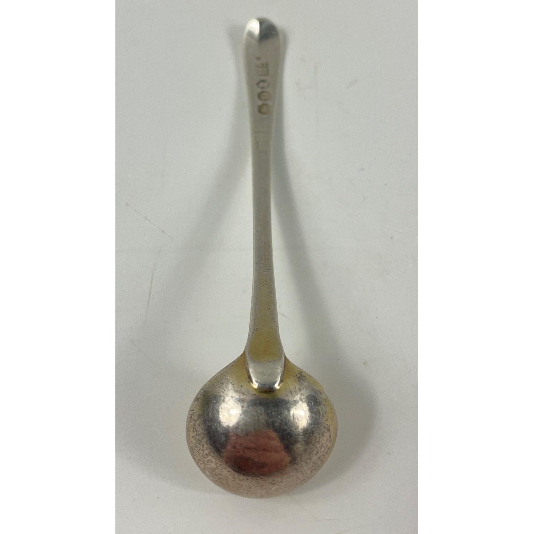 Three pieces of hallmarked silver to include a FISH KNIFE with a broken bone handle, a small condiment LADLE, a BUTTER KNIFE, and a white metal spoon with a highly decorative sailing ship handle and a very small white metal SAUCEBOAT gross weight of silver 140g.