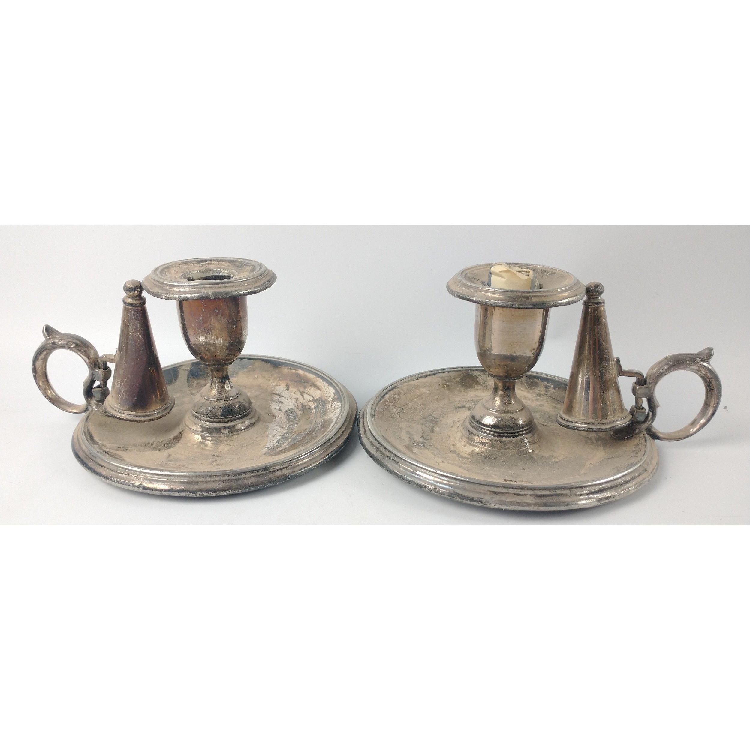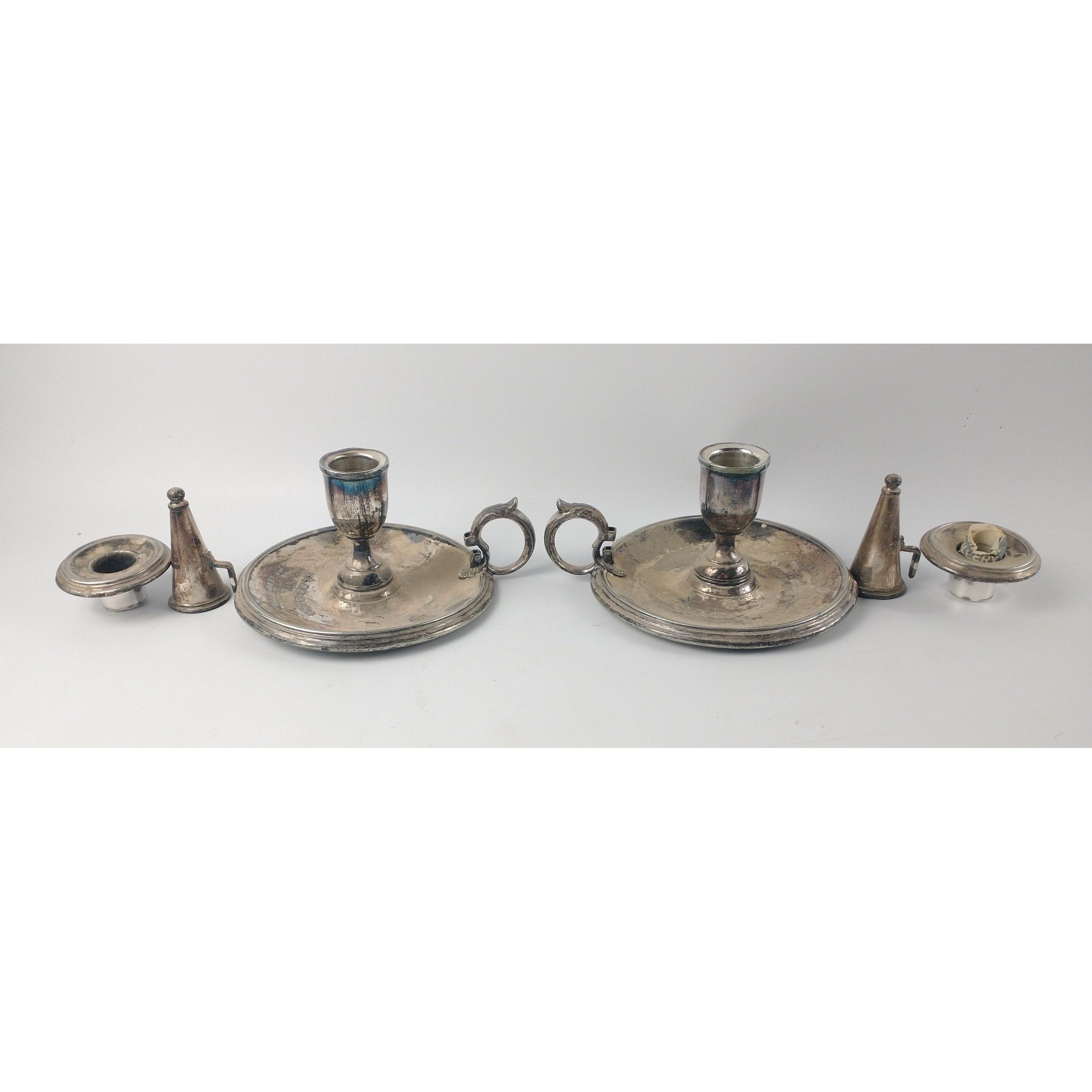 A pair of Sheffield WALKER & HALL Wee Willie Winkie CANDLE HOLDERS with candle SNUFFERS 14.5cm diameter by 8cm high, gross weight 759gApprox 2 pieces