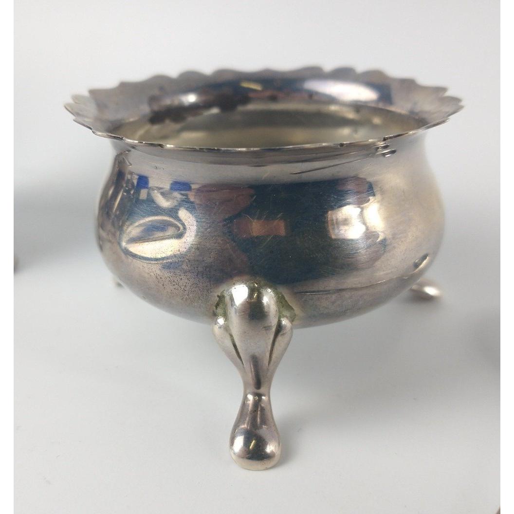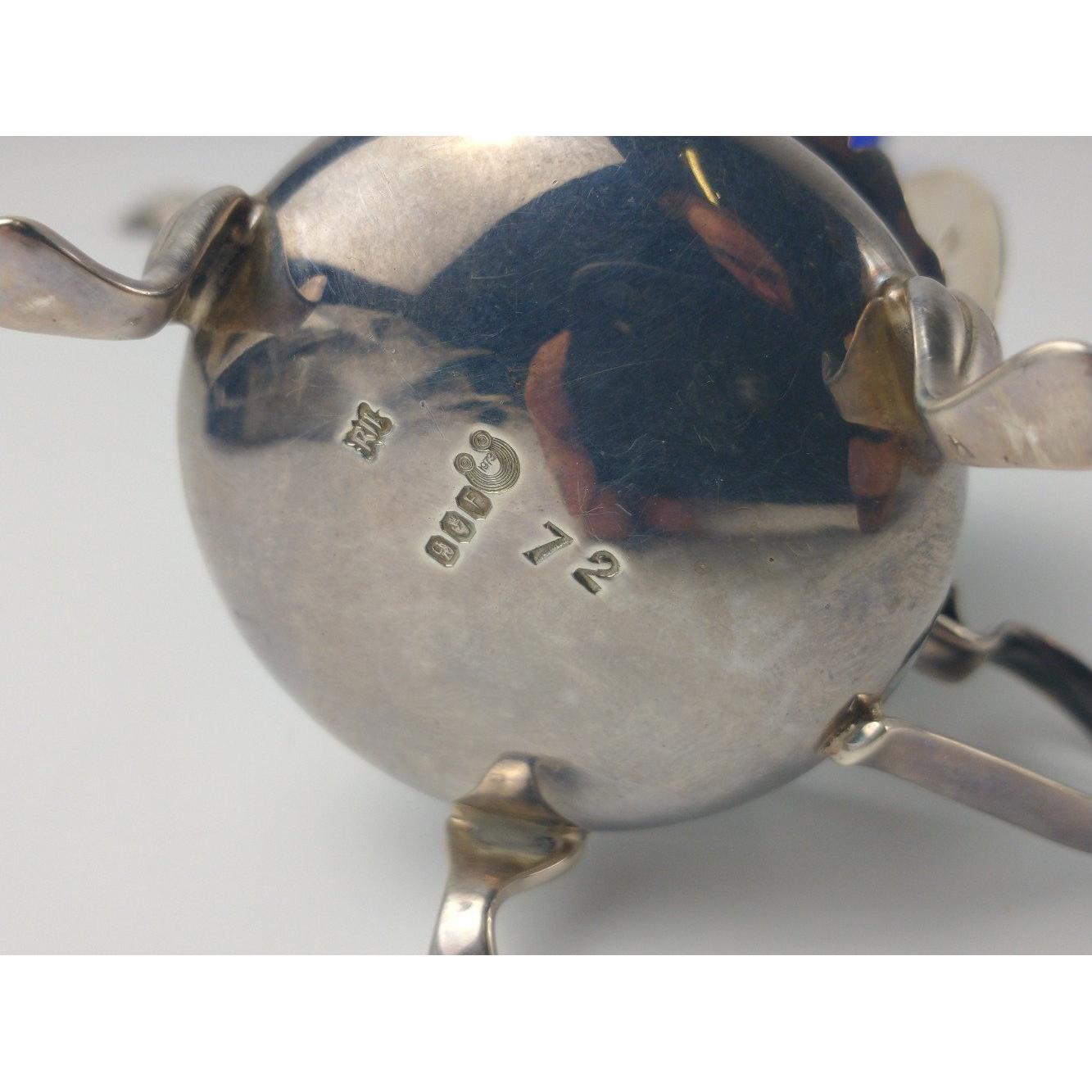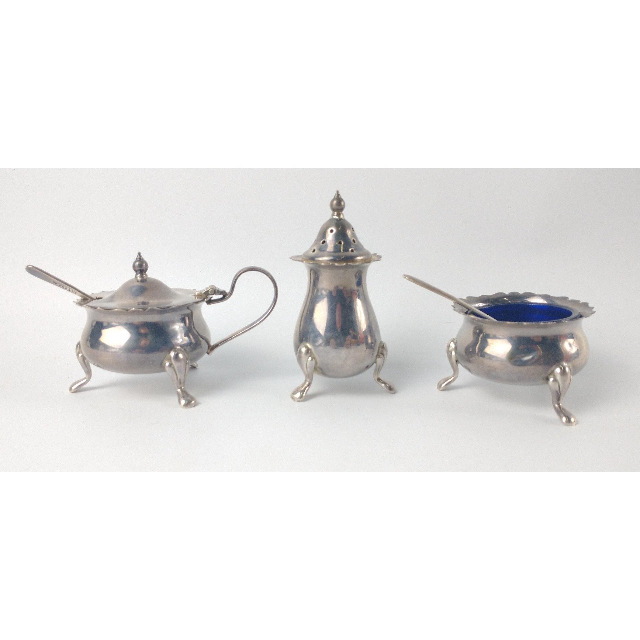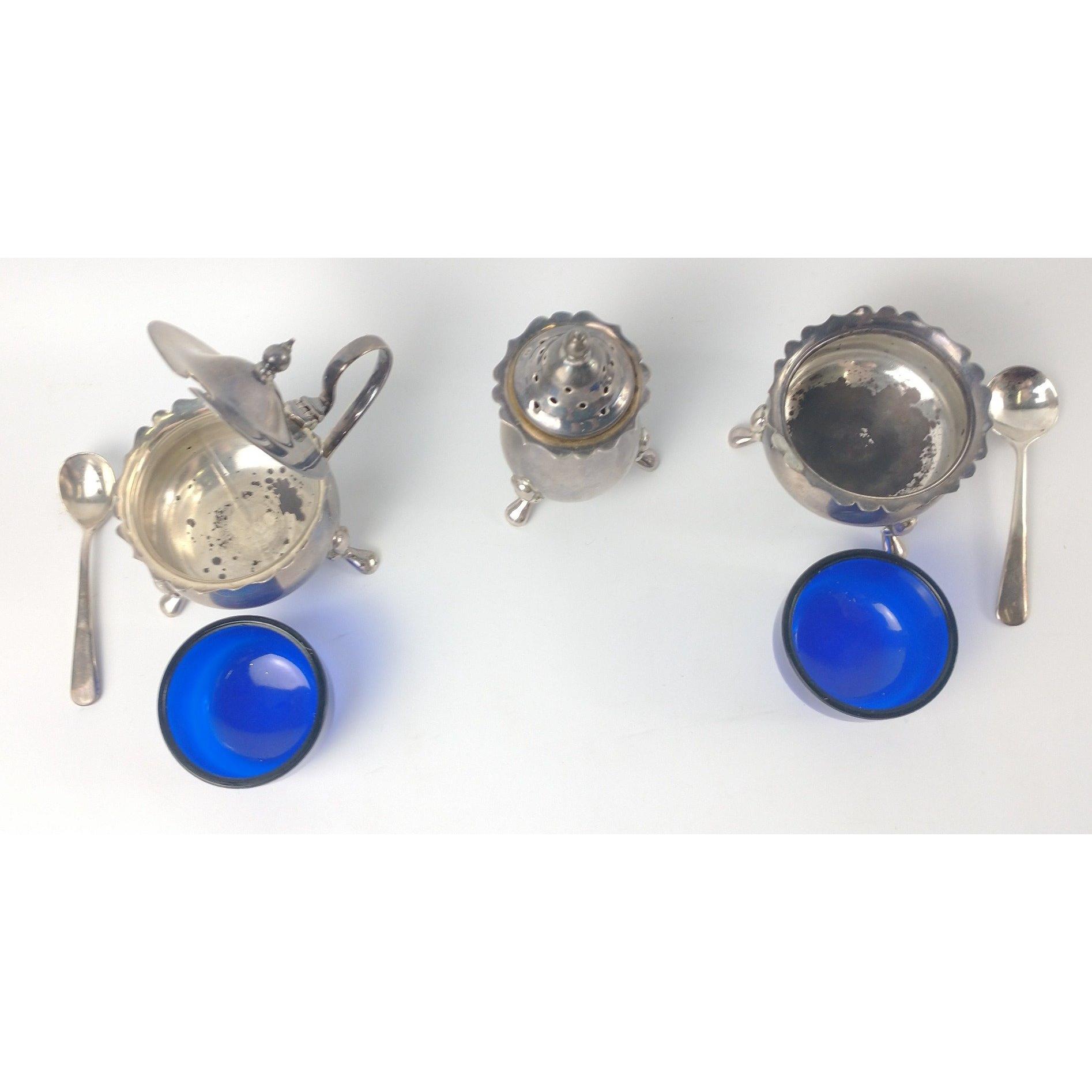 A Dublin silver hallmarked 1973 CRUET SET comprising pepper, mustard and salt (salt and mustard have blue glass liners), by silversmith ROYAL IRISH SILVER COMPANY and 2 matching spoons silver only weight 254g