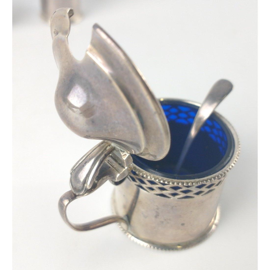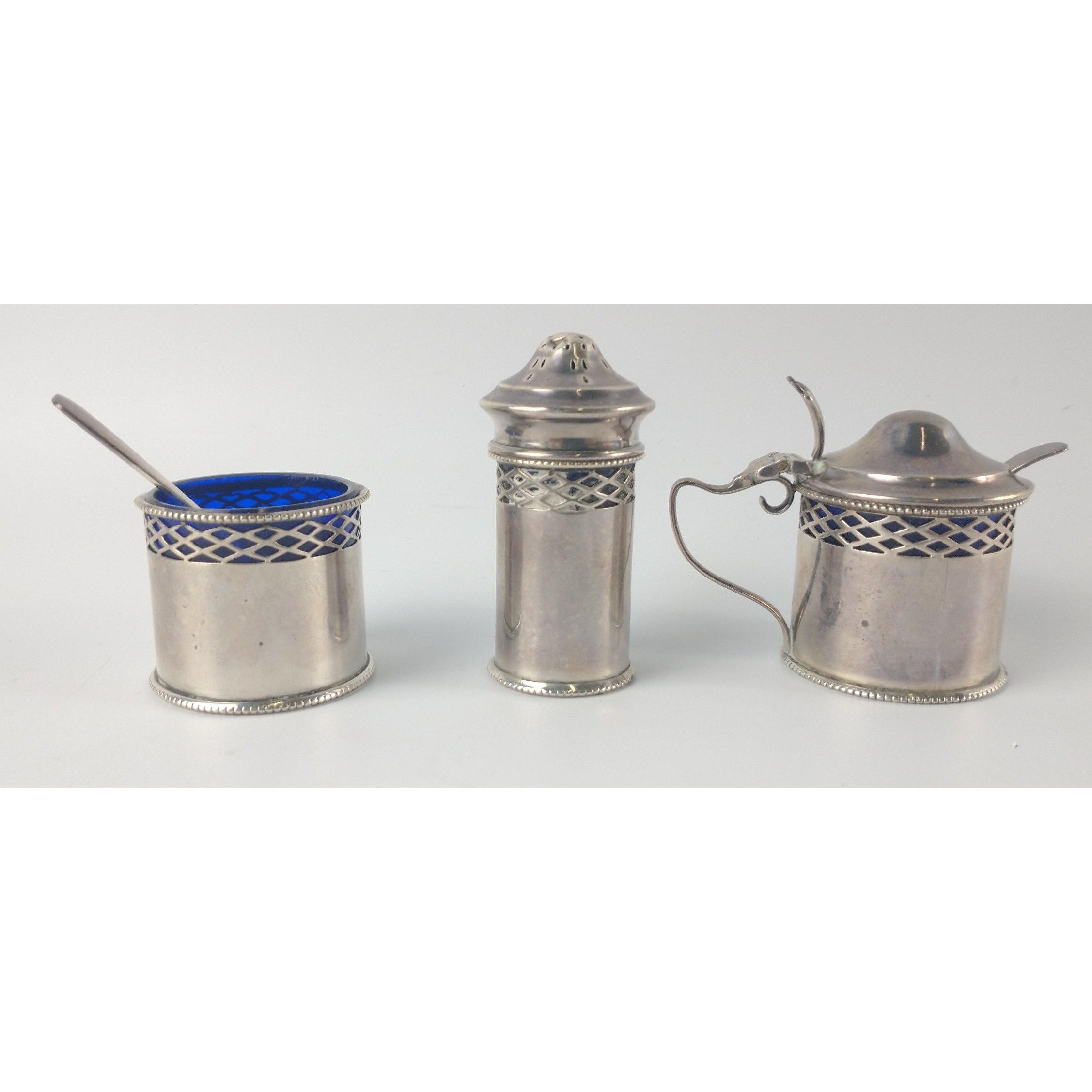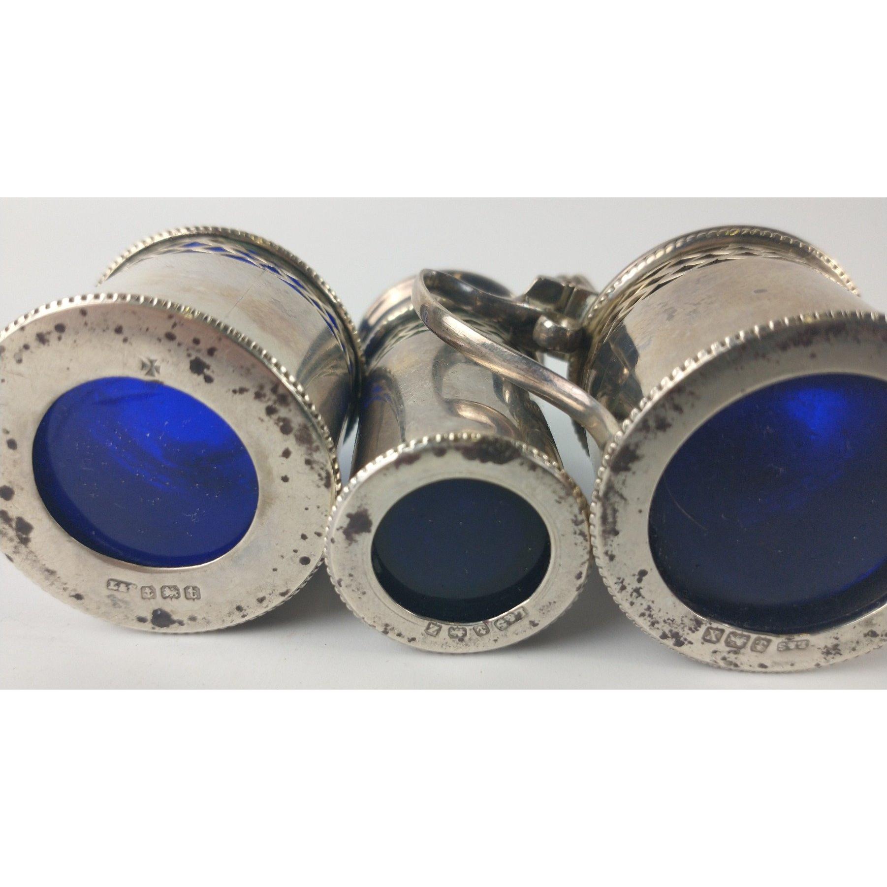 A Birmingham 1920's silver hallmarked CRUET SET by LEVI & SALOMON comprising mustard with liner and spoon, salt with liner and spoon and pepper with liner, gross weight 153g.Approx 5 pieces