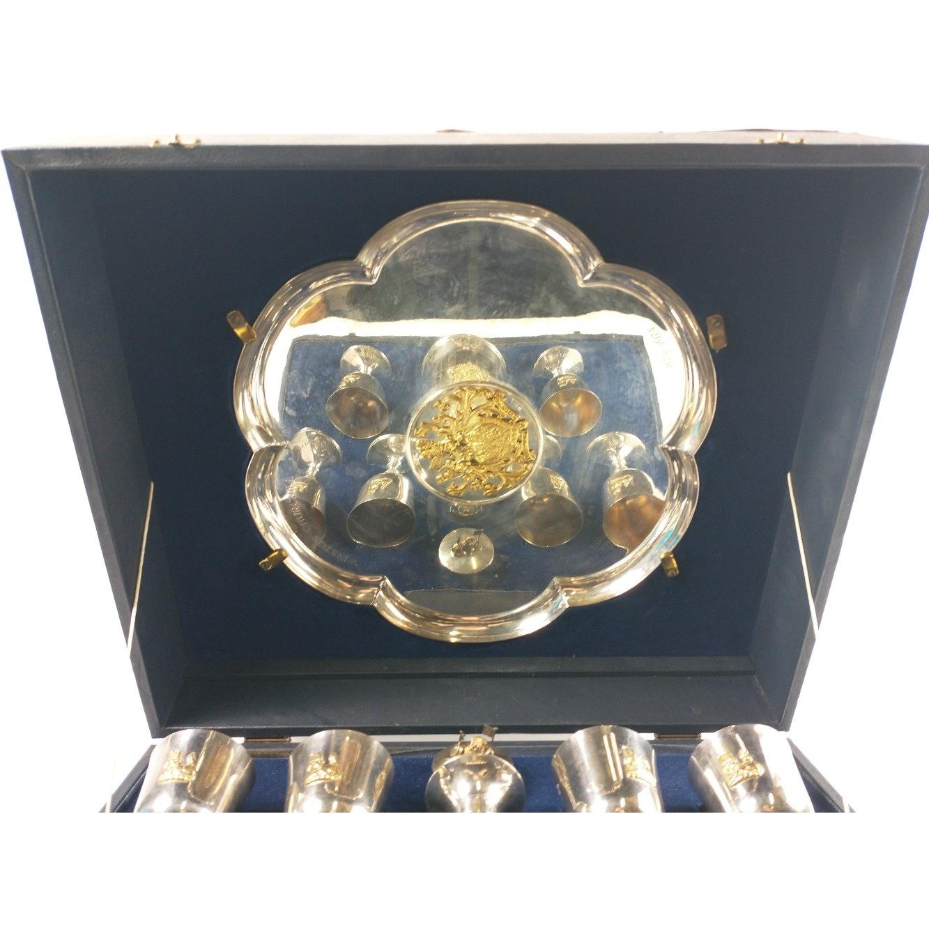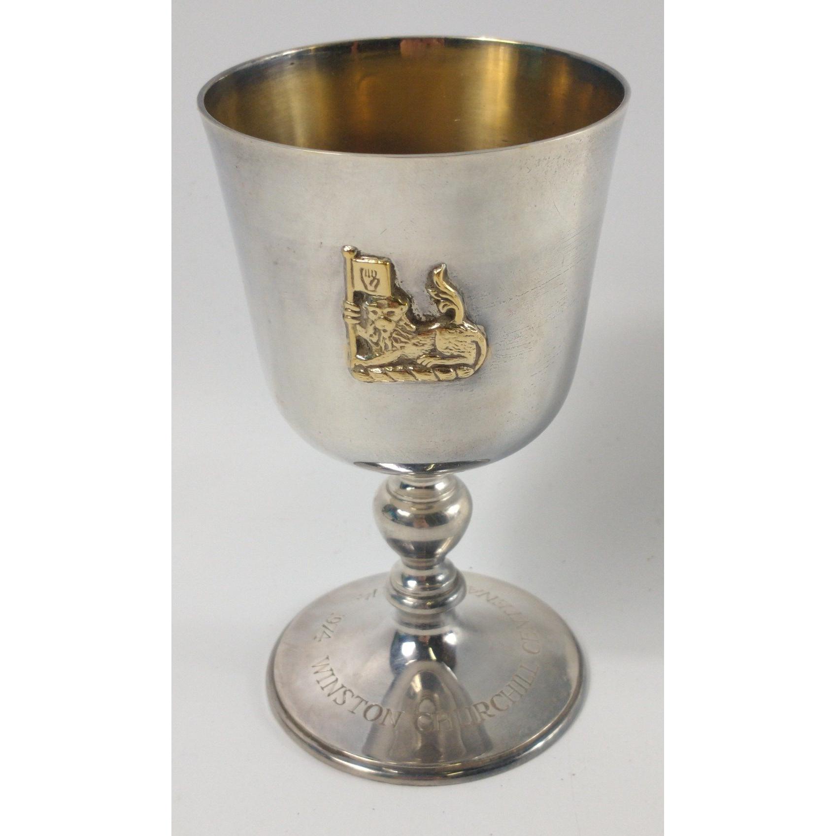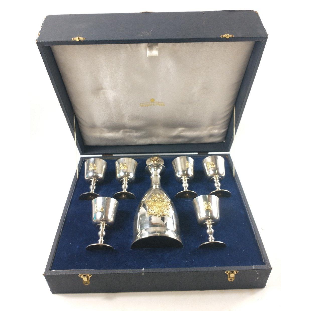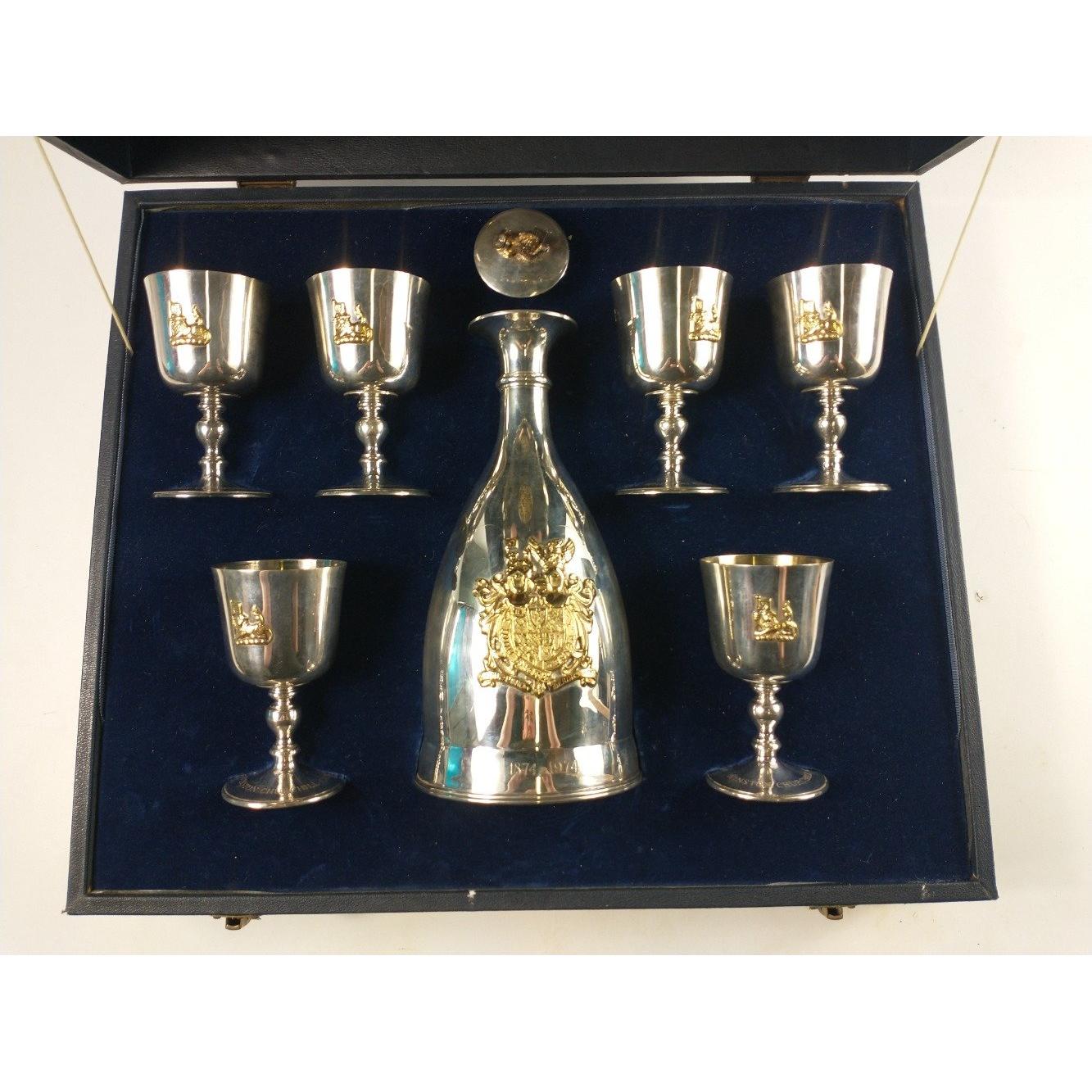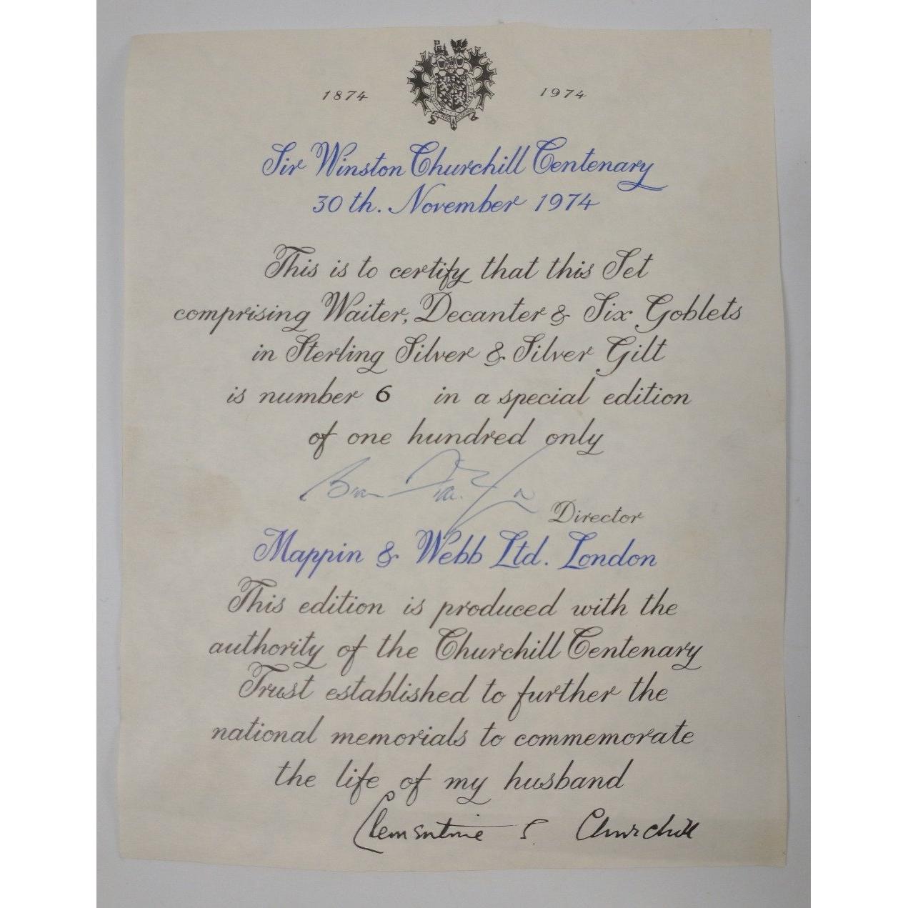 RARE!! A COMPLETE SET OF SIR WINSTON CHURCHILL CENTENARY 1974 by MAPPIN and WEBB, Limited Edition No 6/100 fully hallmarked solid silver and silver gilt cased set comprising a large TRAY, DECANTER with SIX GOBLETS with a combined silver content of 3.37kg.applied with Sir Winston's coat-of-arms within garter surround above Churchill motto Fiel Pero Desdichado (Faithful but unfortunate), inscribed 1874-1974, numbered 6, stopper applied with the Churchill crest, vase-shaped cups similarly applied with the Churchill crest on circular bases with baluster stems, inscribed Winston Churchill Centenary 1874-1974, in original Mappin & Webb fitted case also stamped with the Churchill coat-of-arms and crest, including the parchment authentication from the Churchill Centenary Trust signed by Clementine Churchill