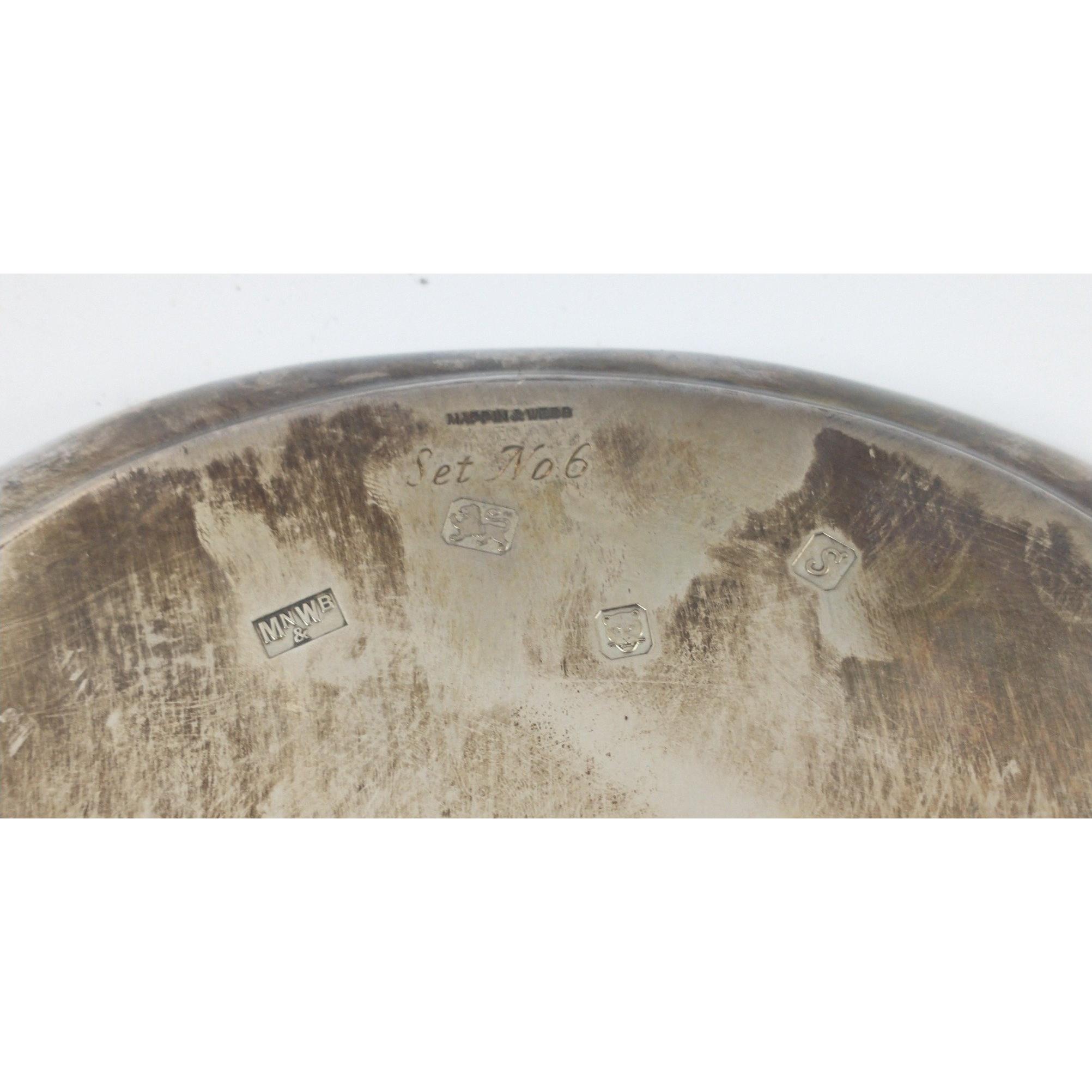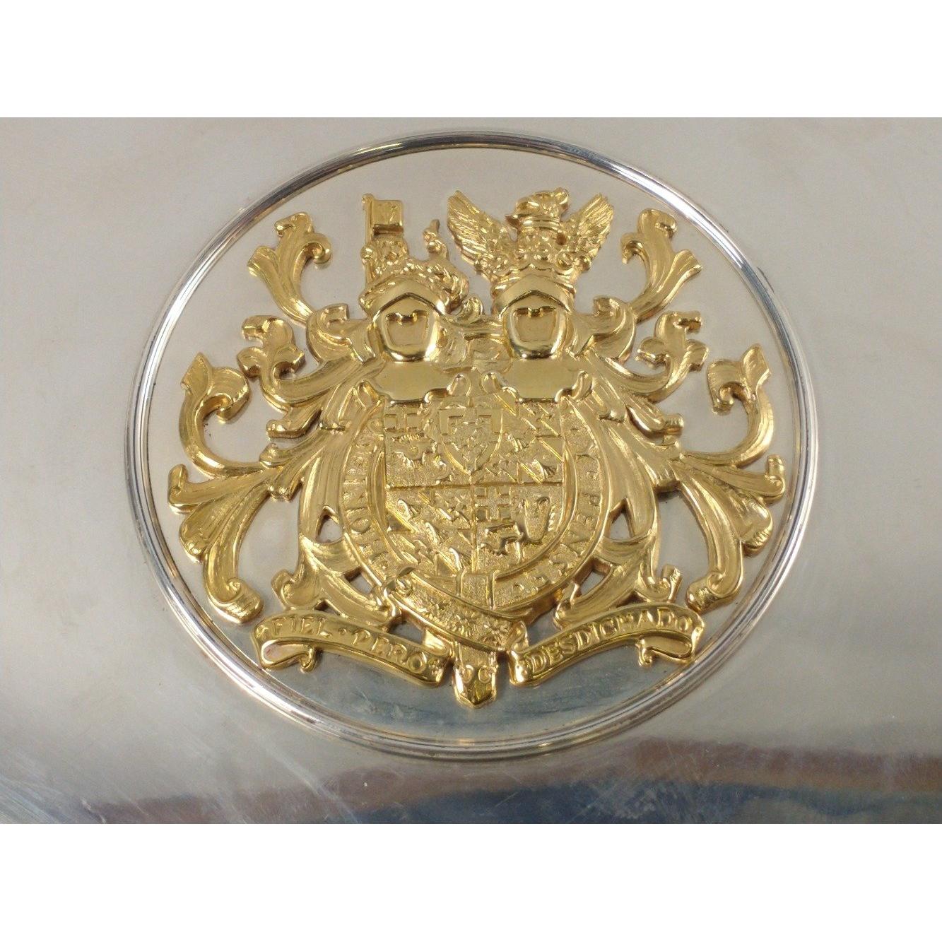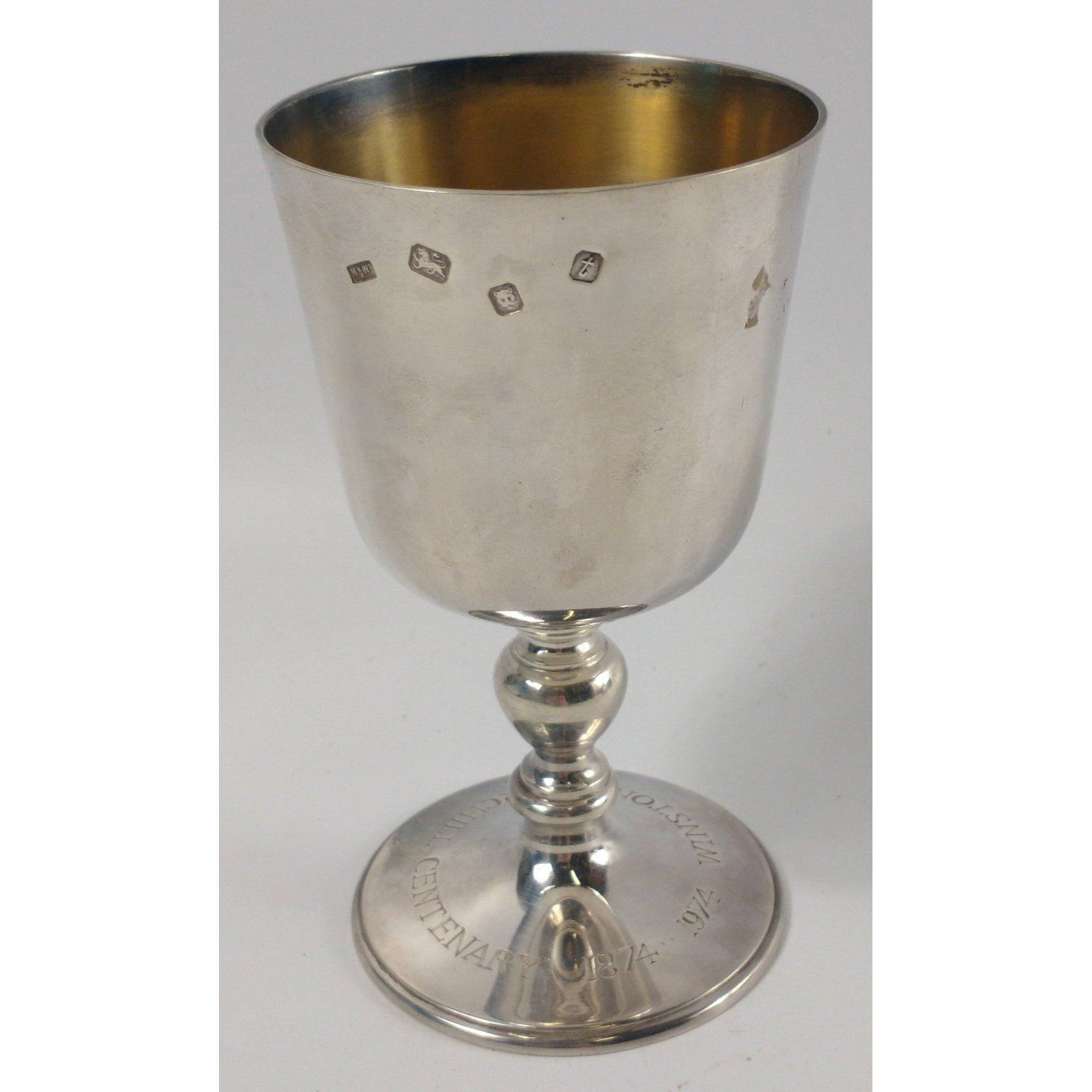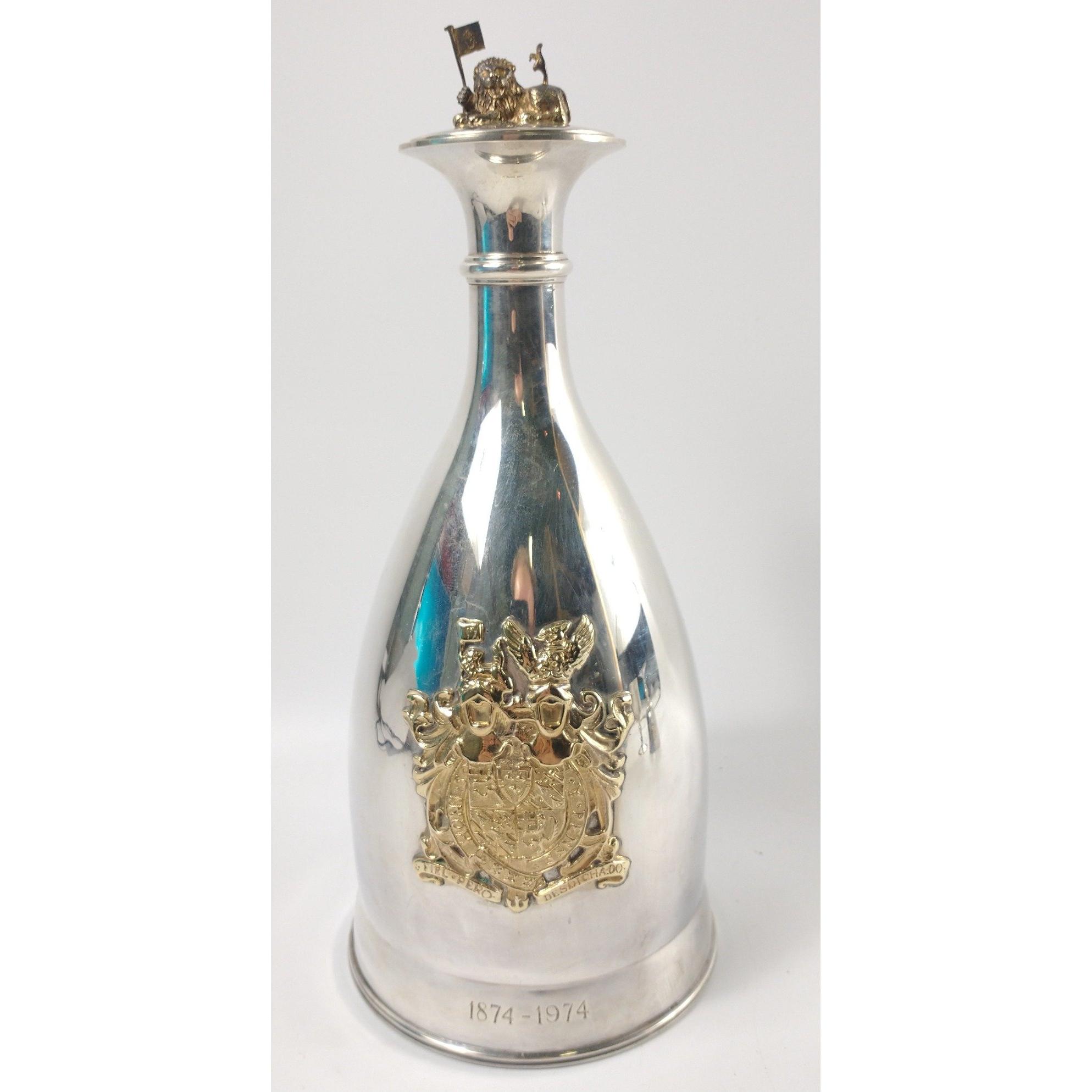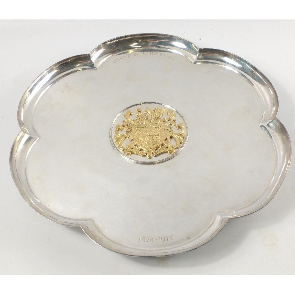 RARE!! A COMPLETE SET OF SIR WINSTON CHURCHILL CENTENARY 1974 by MAPPIN and WEBB, Limited Edition No 6/100 fully hallmarked solid silver and silver gilt cased set comprising a large TRAY, DECANTER with SIX GOBLETS with a combined silver content of 3.37kg.applied with Sir Winston's coat-of-arms within garter surround above Churchill motto Fiel Pero Desdichado (Faithful but unfortunate), inscribed 1874-1974, numbered 6, stopper applied with the Churchill crest, vase-shaped cups similarly applied with the Churchill crest on circular bases with baluster stems, inscribed Winston Churchill Centenary 1874-1974, in original Mappin & Webb fitted case also stamped with the Churchill coat-of-arms and crest, including the parchment authentication from the Churchill Centenary Trust signed by Clementine Churchill