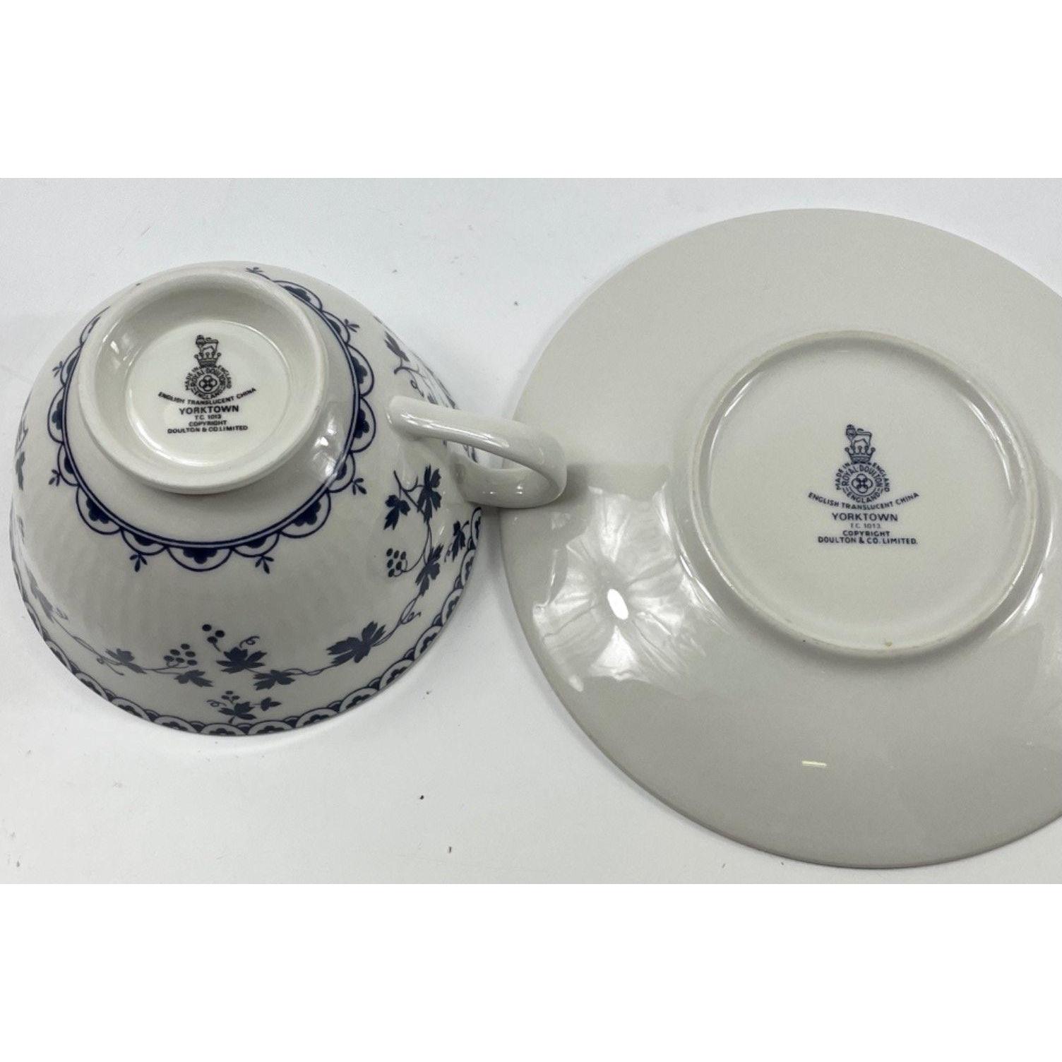 A vintage ROYAL DOULTON YORKTOWN service to include 12 cups (10cm), 10 demi-tasse cups (7cm), 12 saucers (15.5cm), 12 saucers (13cm), 12 plates (16.5cm), 3 plates (20cm), 2 plates (27cm), 5 bowls (17cm), 2 sauceboats (29cm) with underplates, 2 lidded soup bowls (12cm dia), 1 creamer (9cm high), 1 milk jug (10cm), 1 milk jug (15cm), 1 sugar bowl (11.5cm dia), 1 sugar bowl (9cm dia)